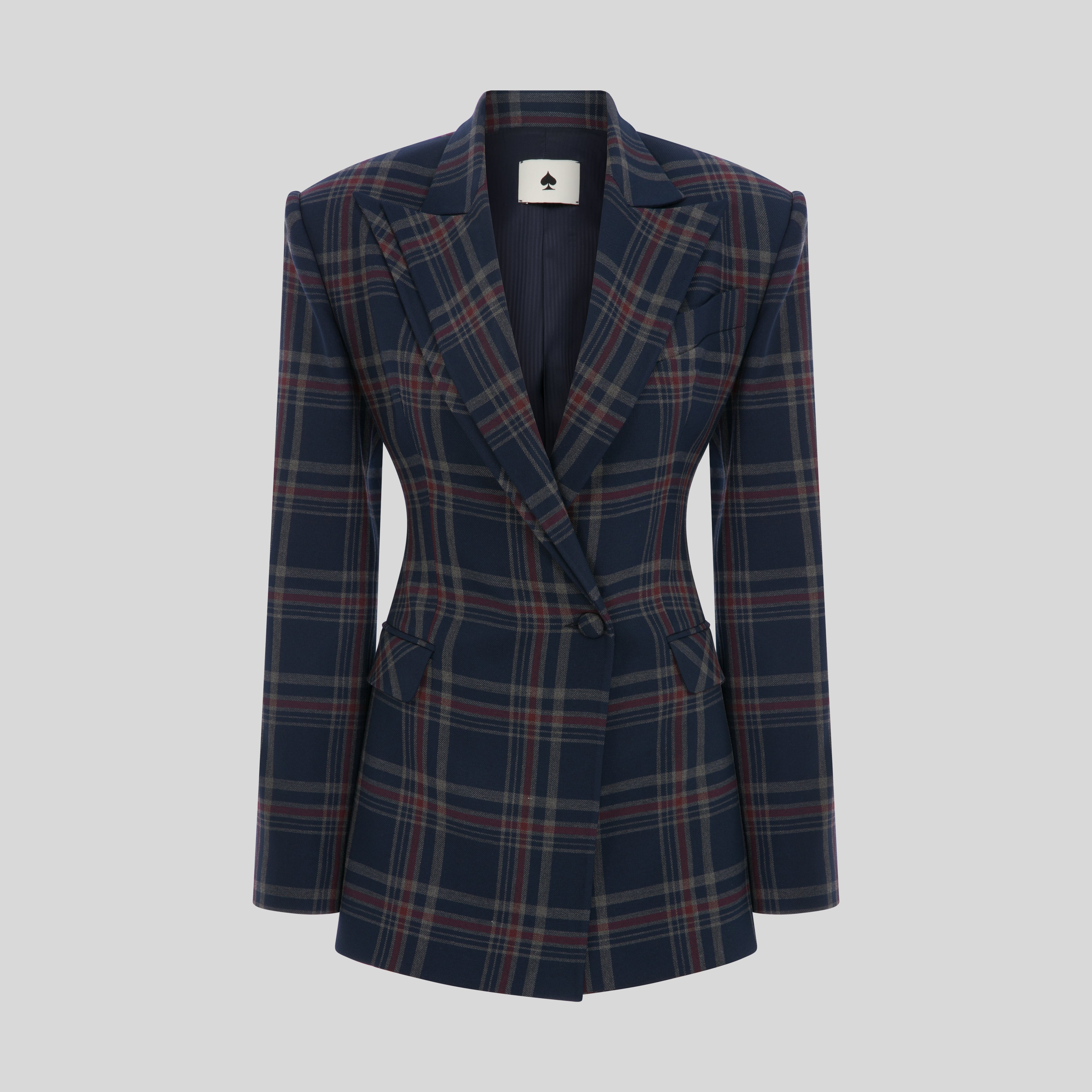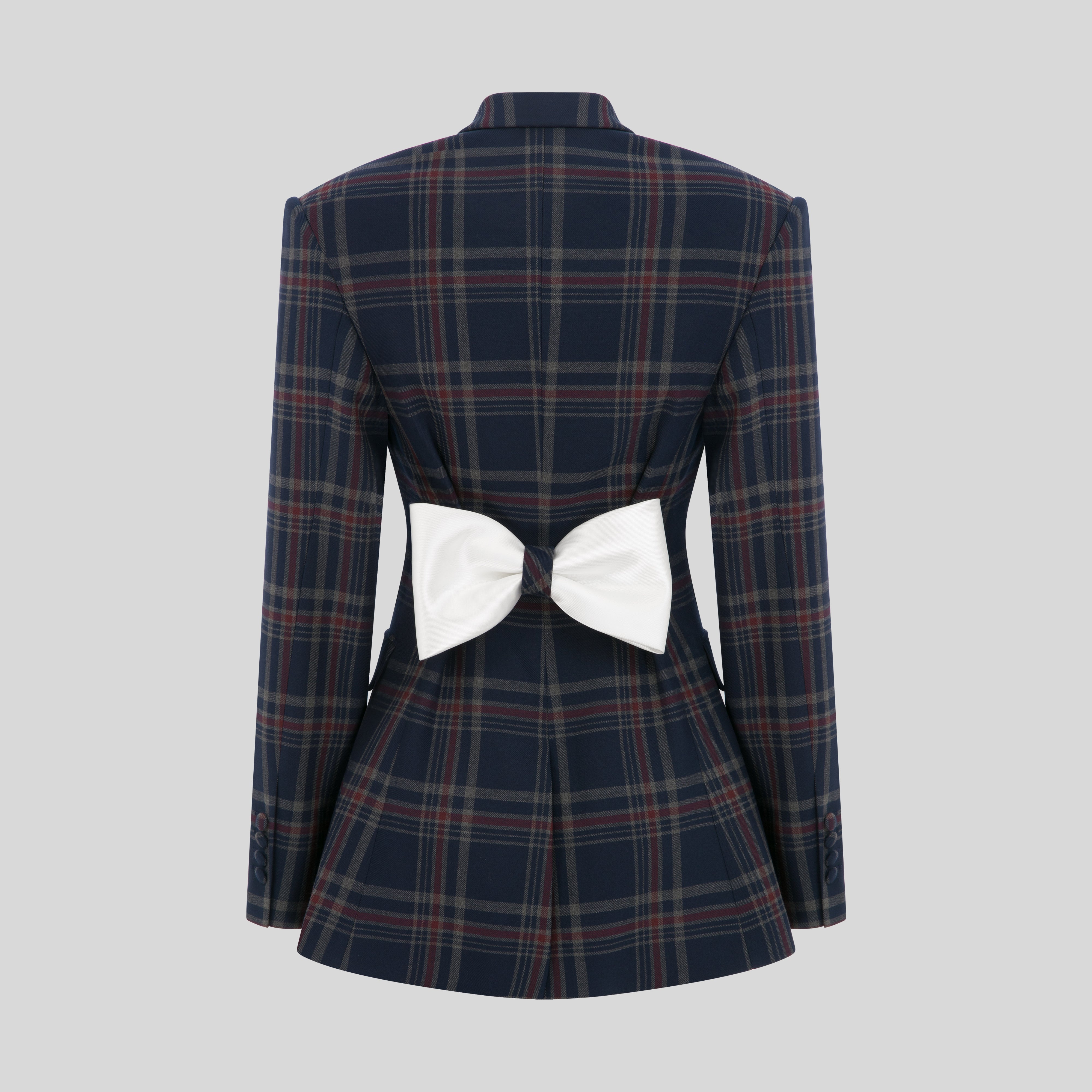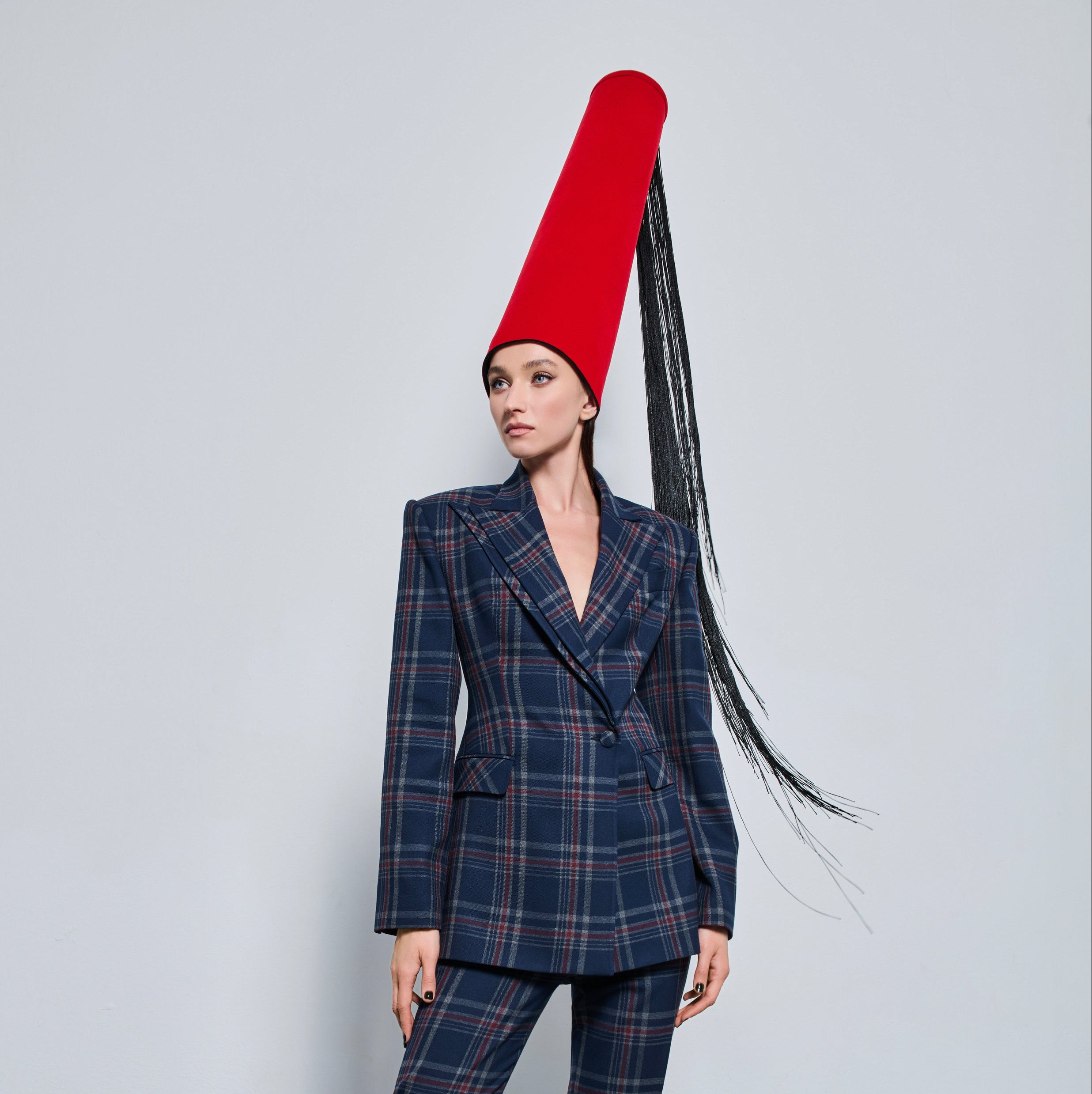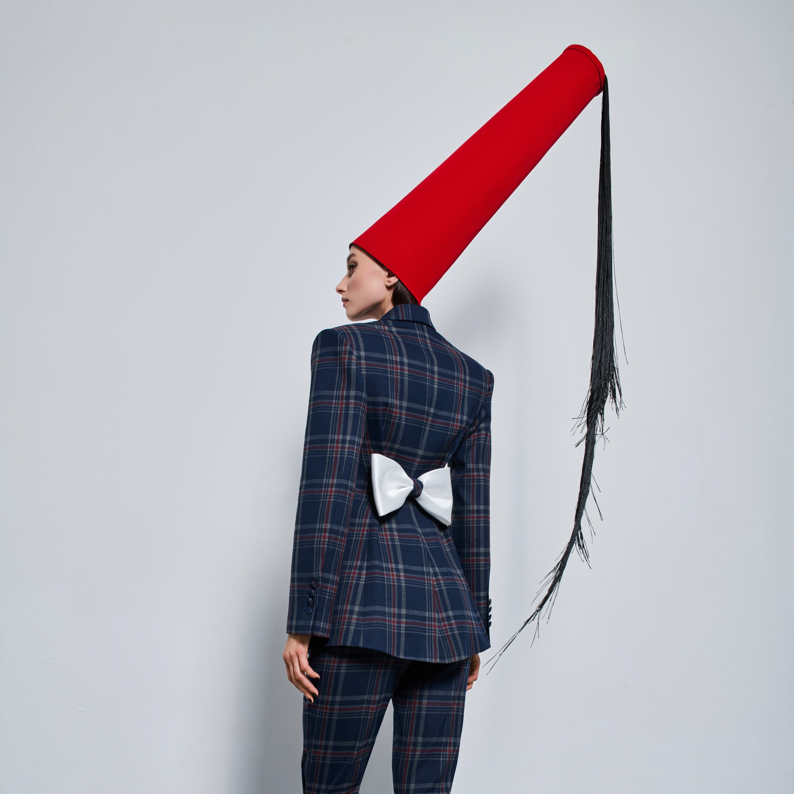 بليزر قصير من الصوف الأسود بتصميم إيطالي أنيق، بقصّة غير متماثلة وياقة من الساتان