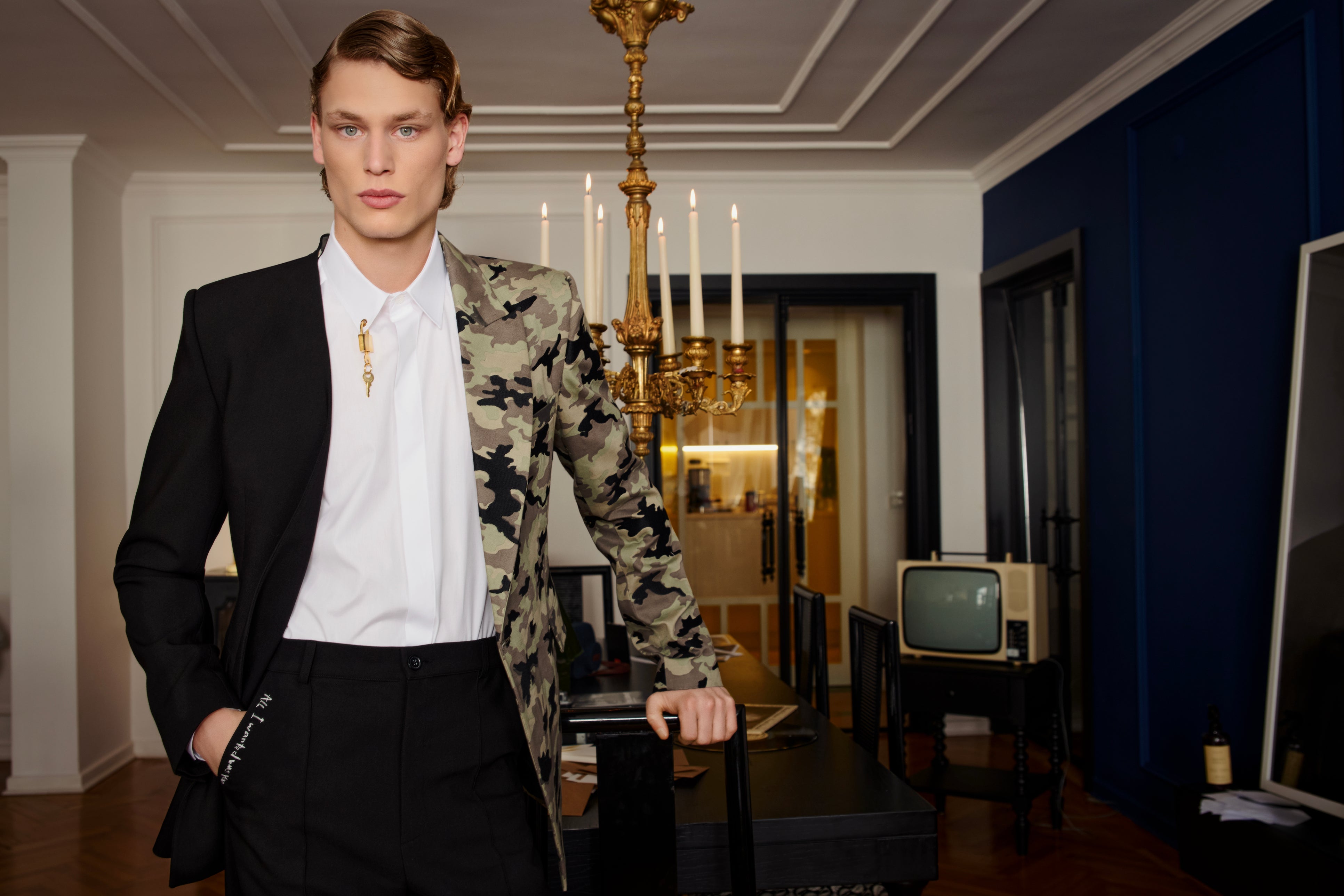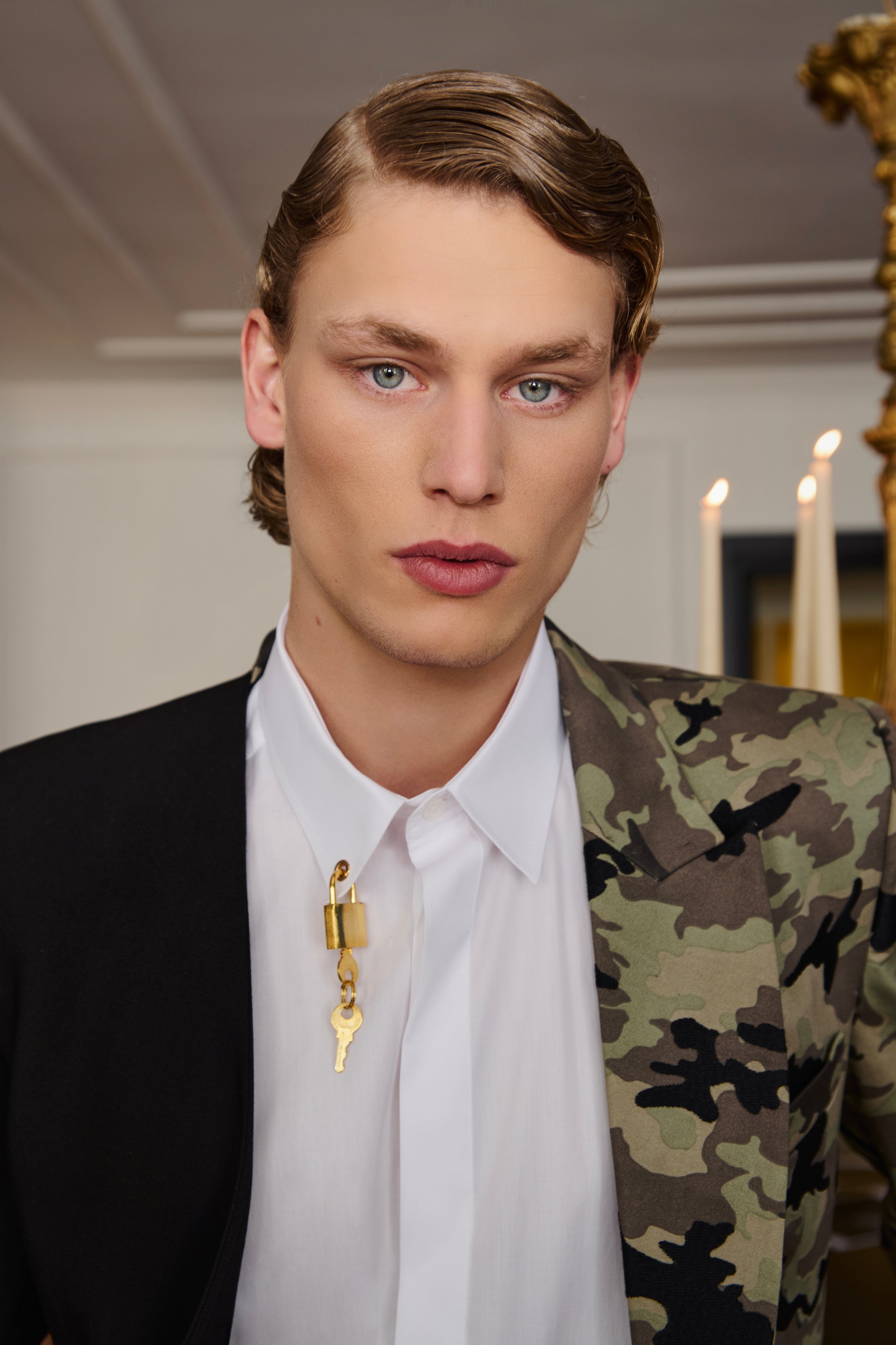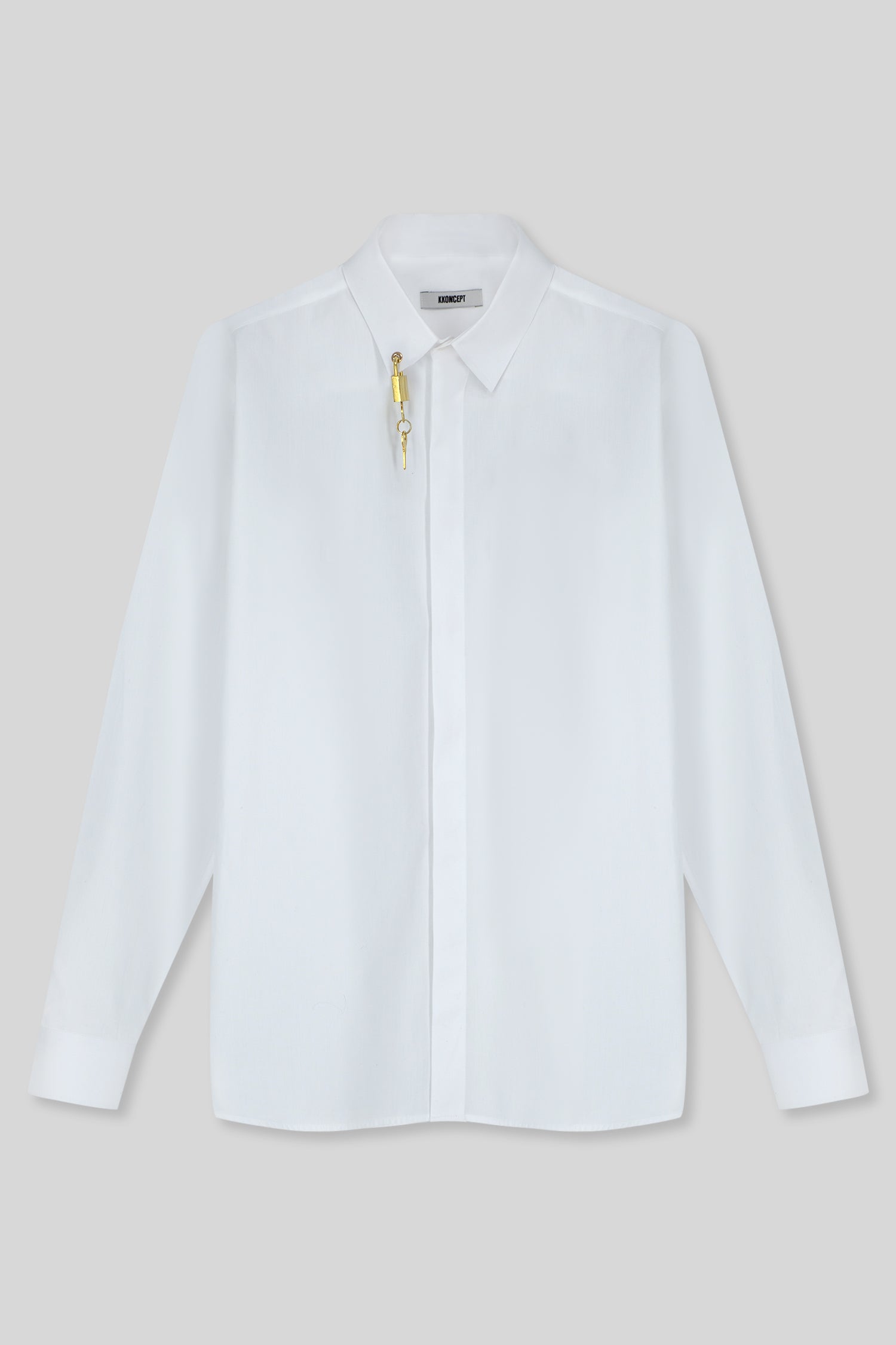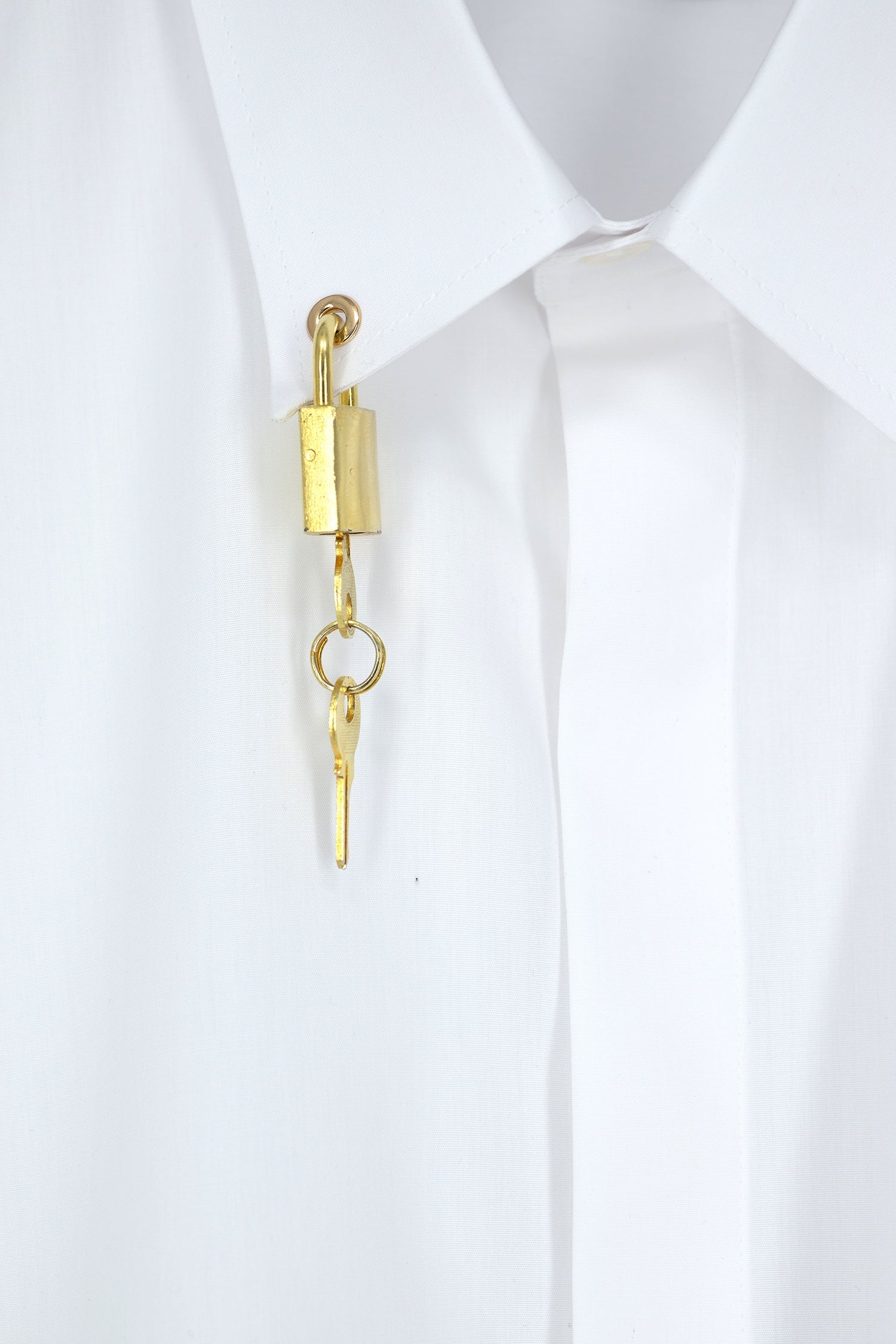 قميص بوبلين أبيض مصمم بدقة عالية، ومُثبت بقفل ومفتاح معدني ذهبي على الياقة.
