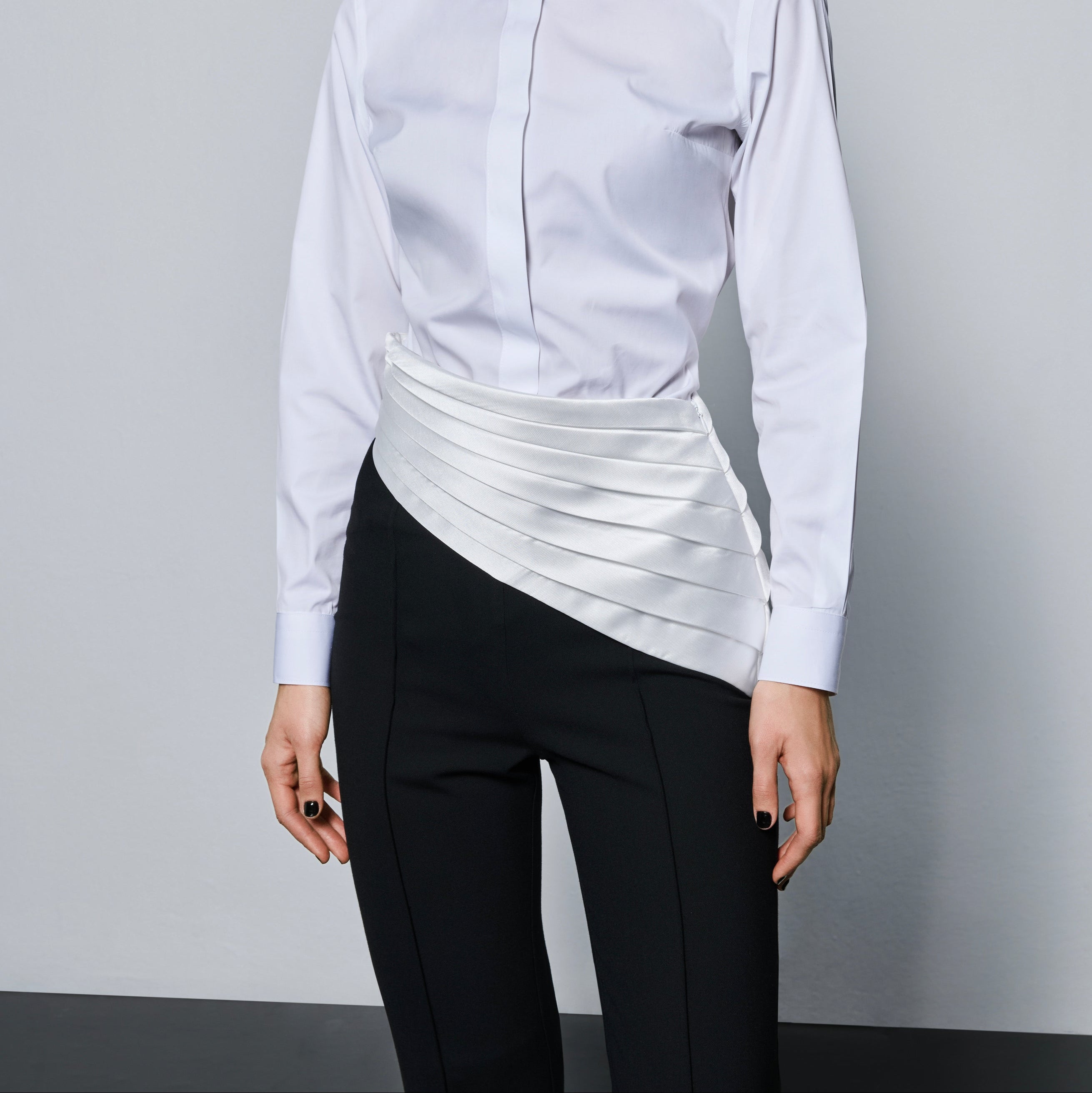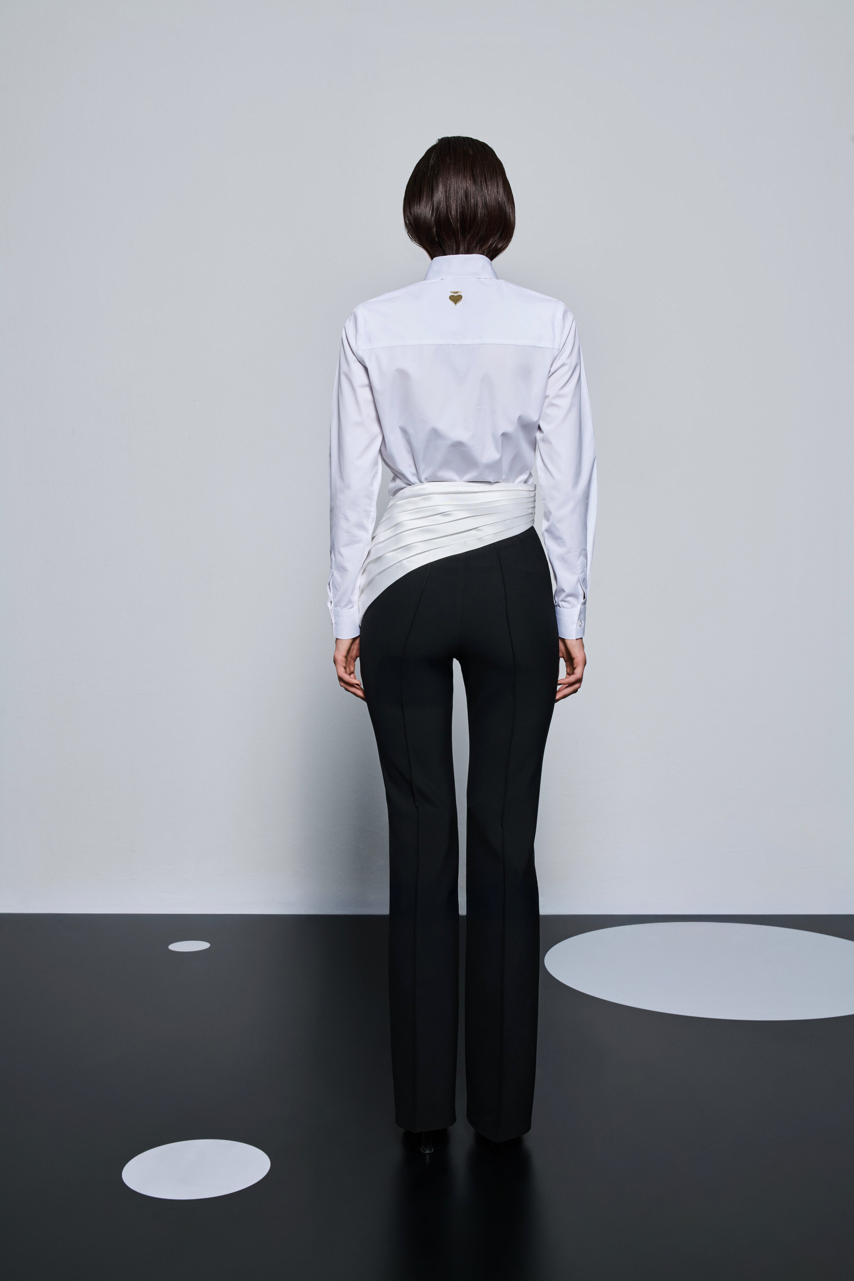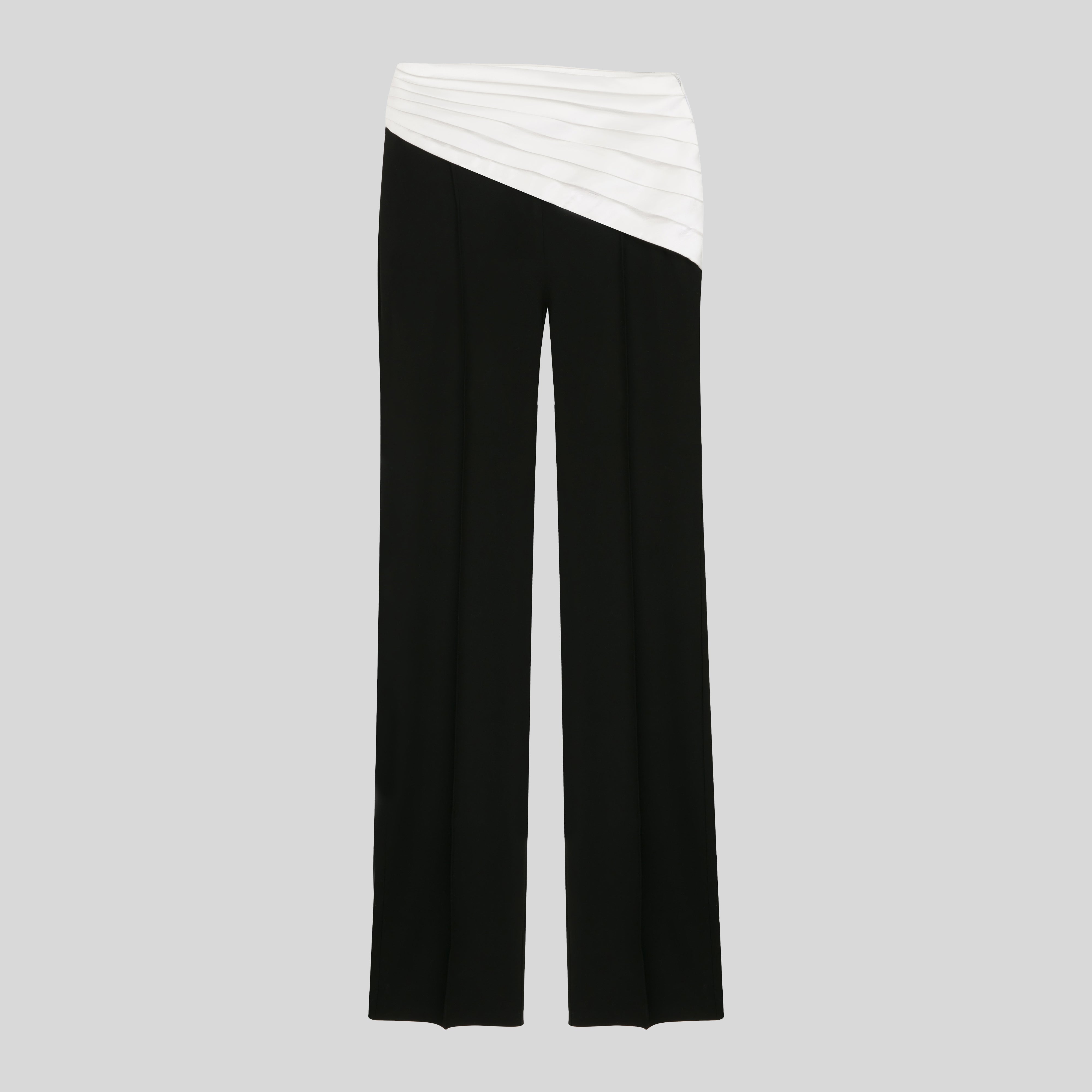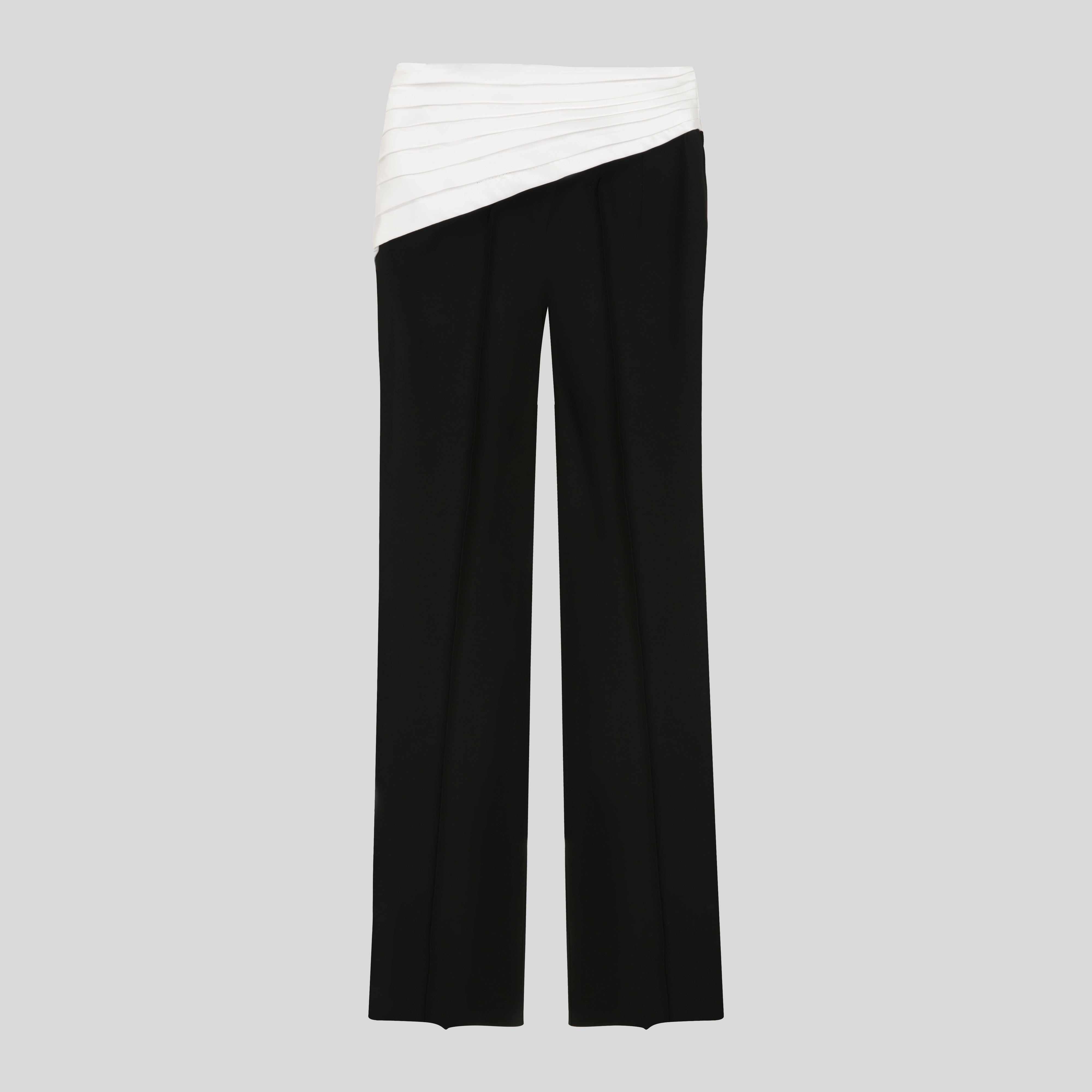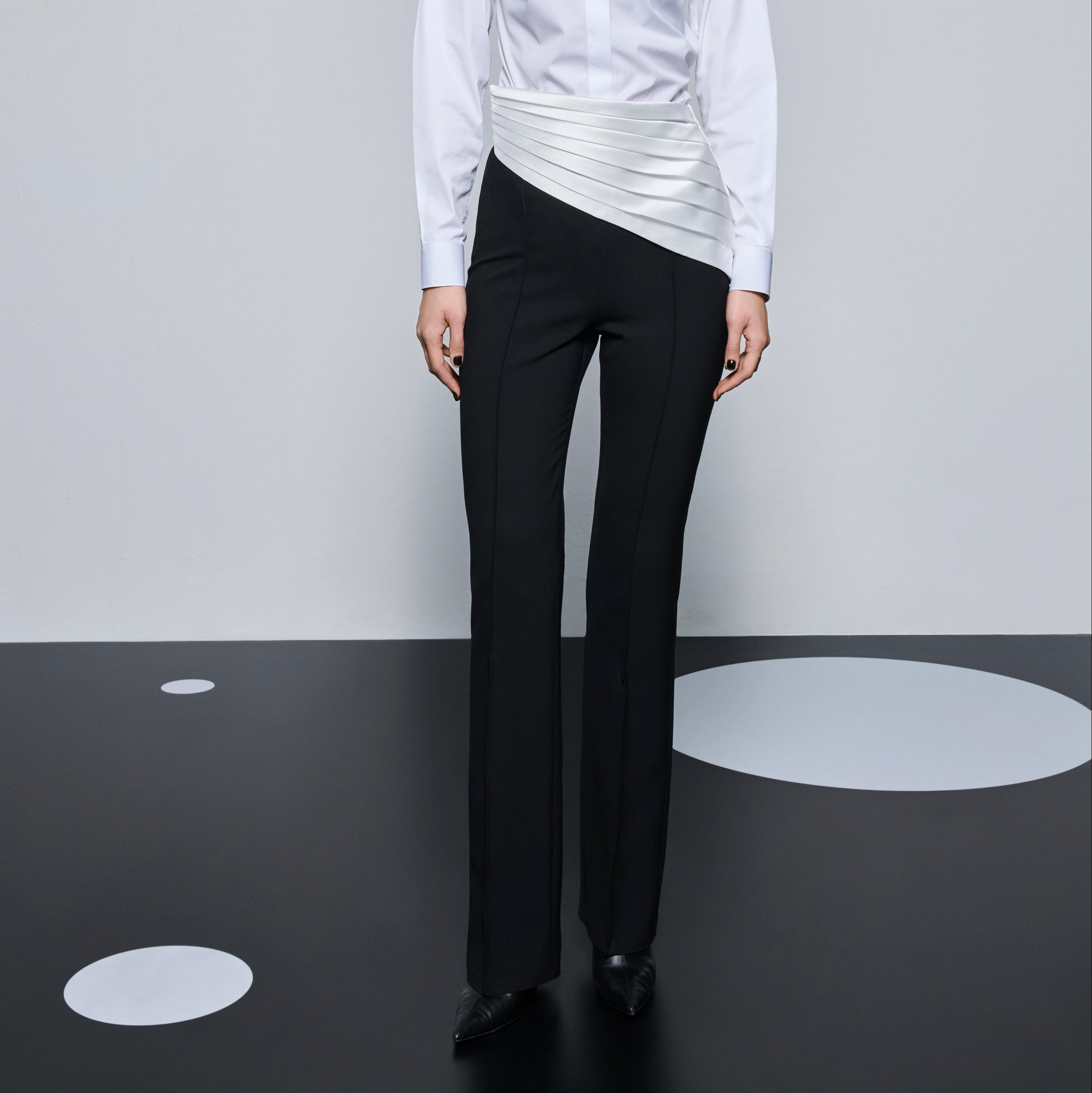 بنطلون غاباردين أسود بقصّة كلاسيكية مع تصميم على شكل طوق تفتا أبيض مدمج على الخصر.