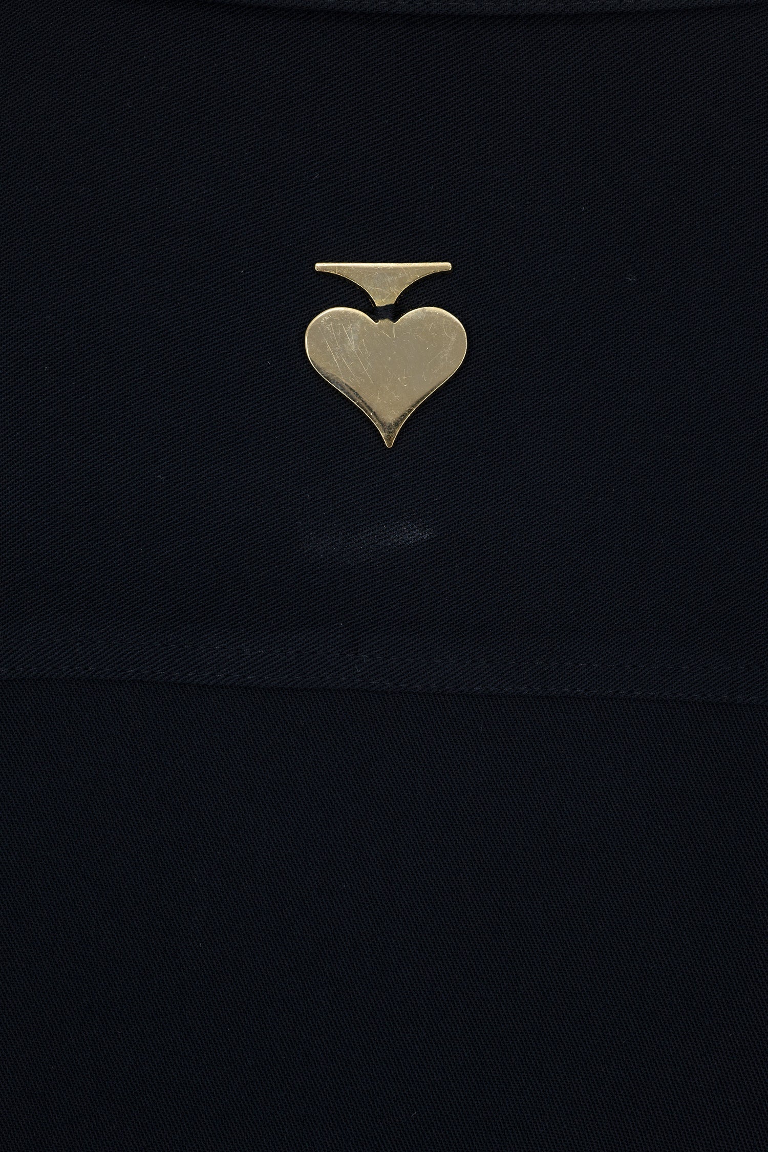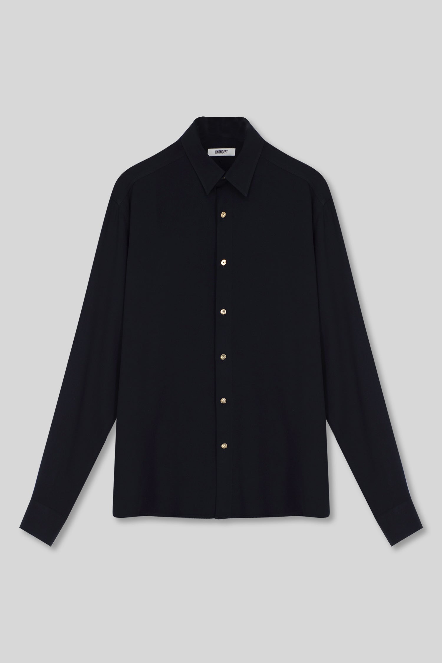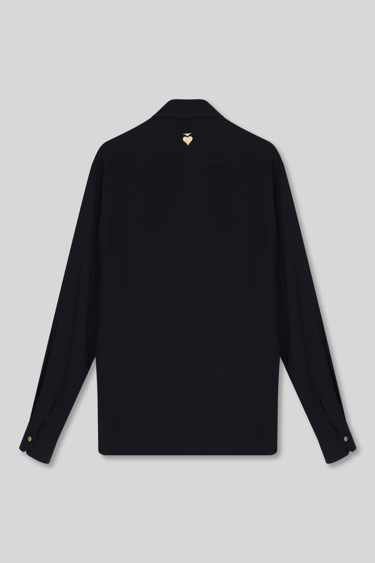 قميص فضفاض مصمم من قماش تويل باللون الأسود مع أزرار ذهبية فريدة من نوعها.