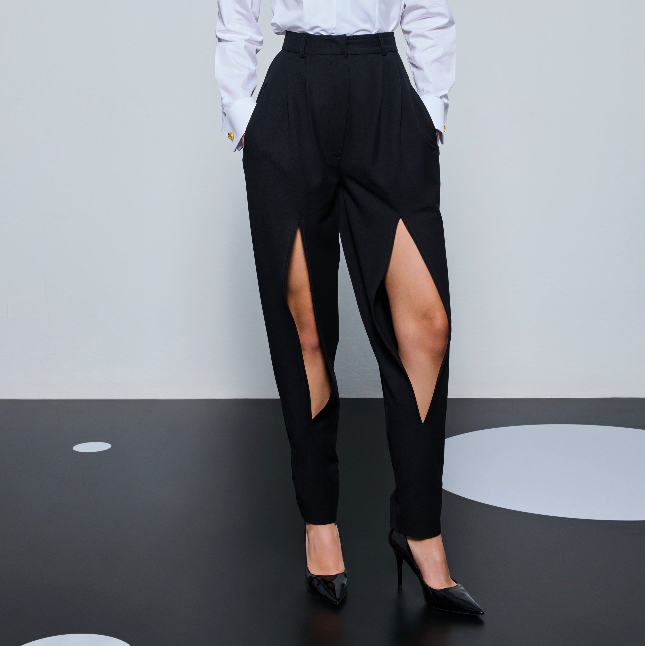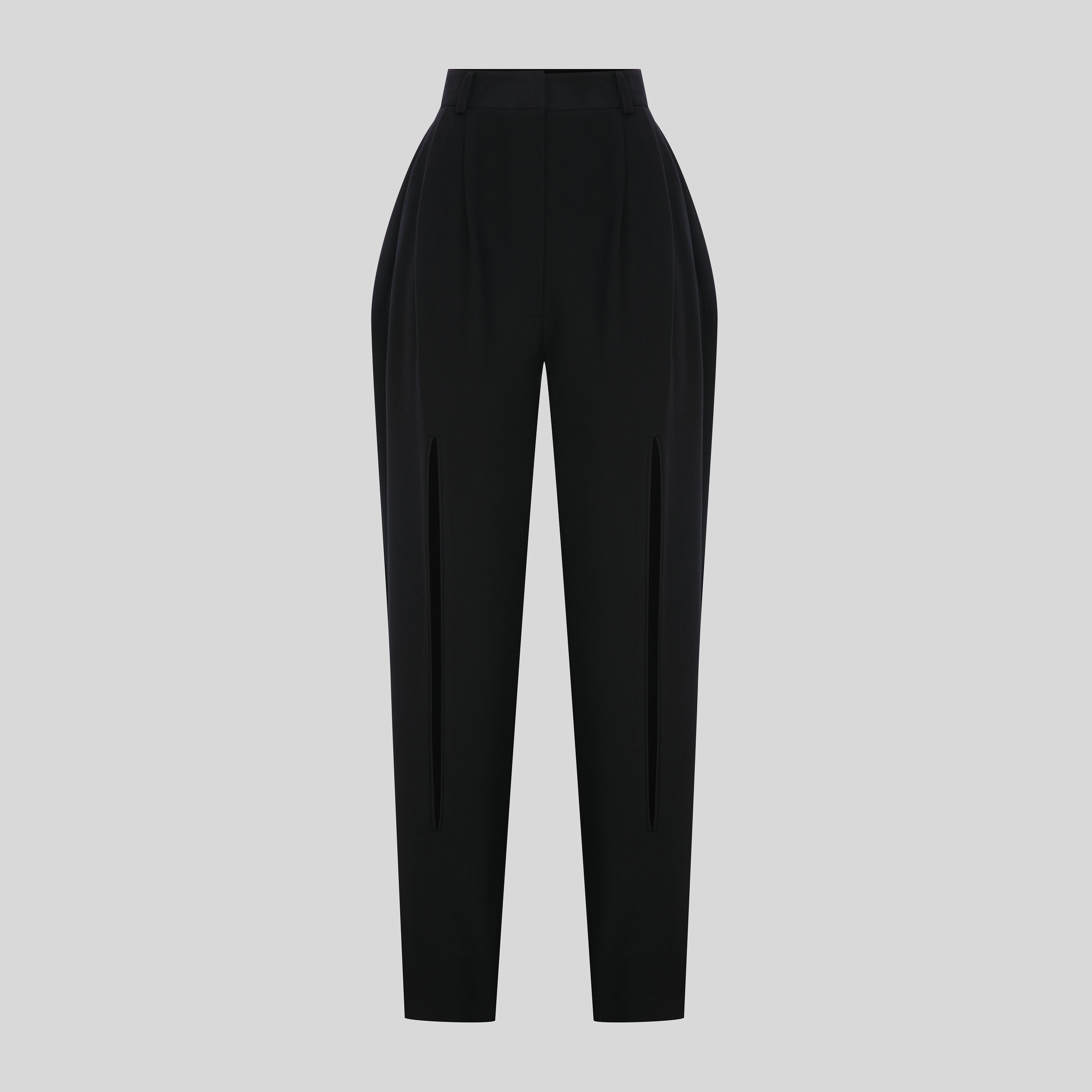 بنطلون غاباردين أسود رفيع بقصّة كلاسيكية وخصر مرتفع مع طيات بيضاء.