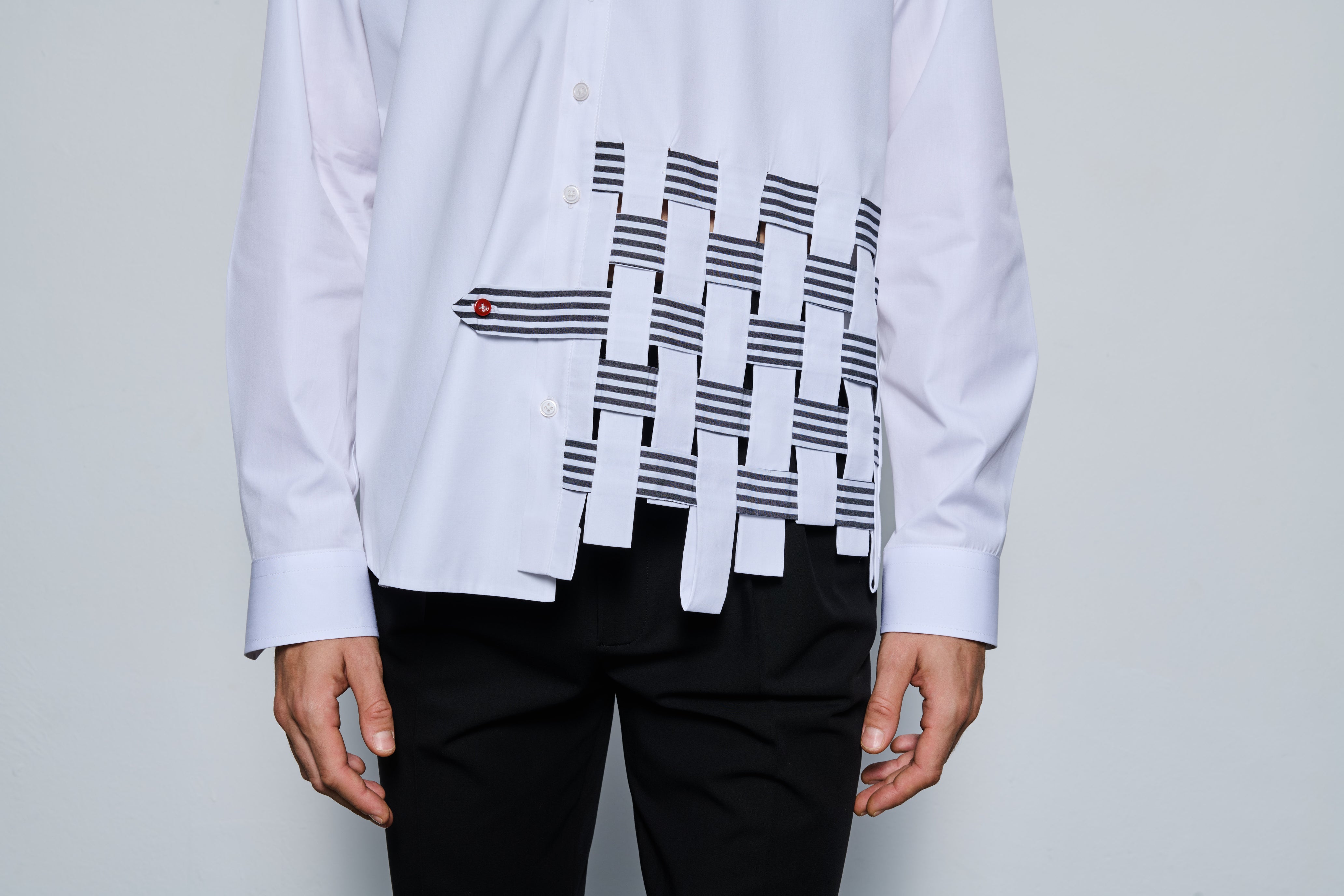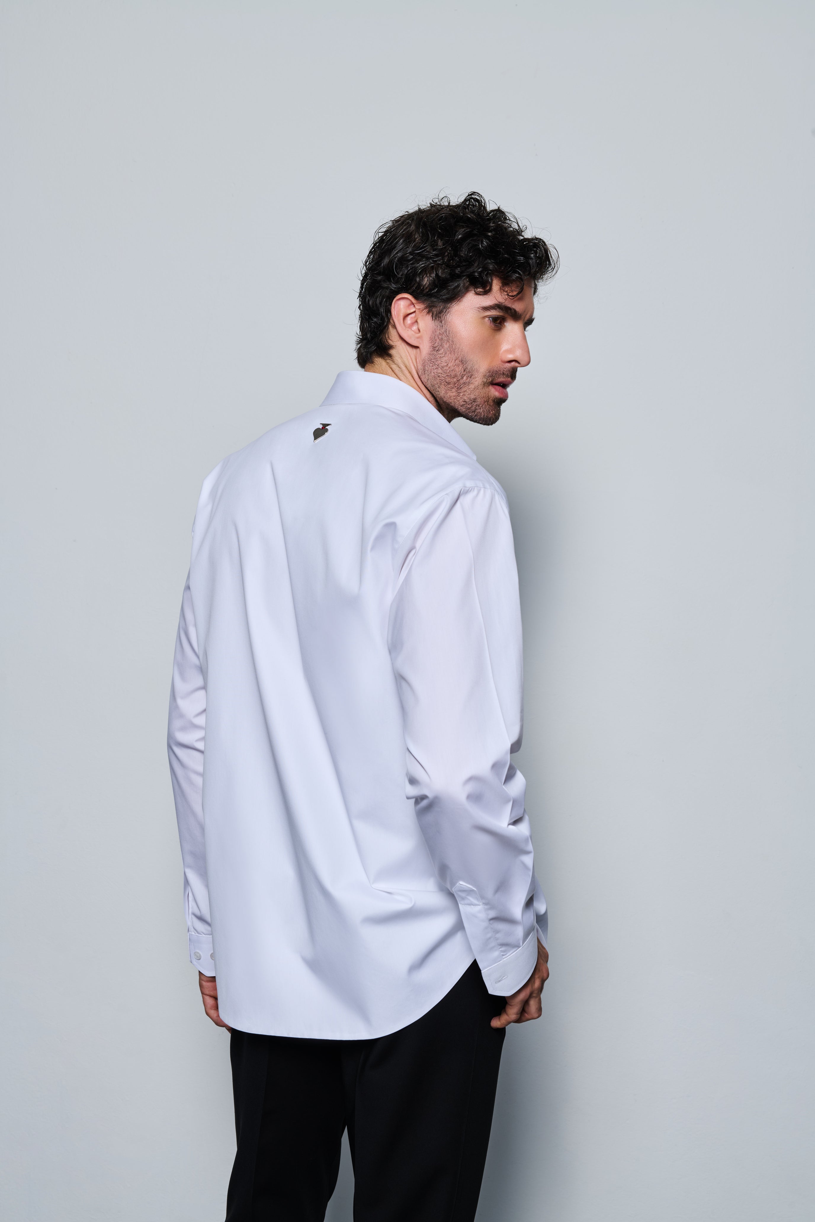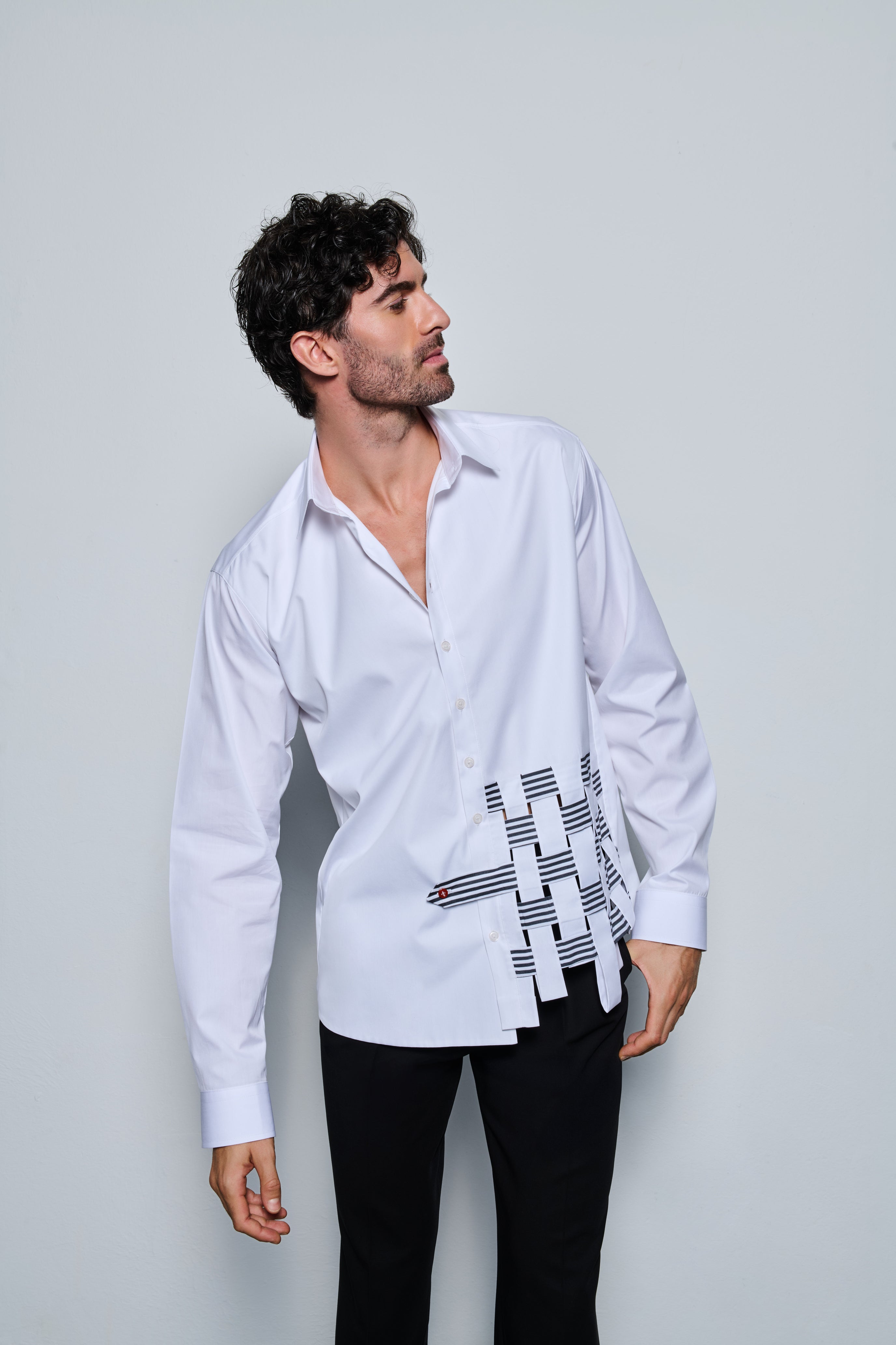 قميص أبيض بقصّة قياسية من قماش البوبلين مع تصميم خياطة باللونين الأبيض والأسود مصنوعة يدويًا في الجزء السفلي.