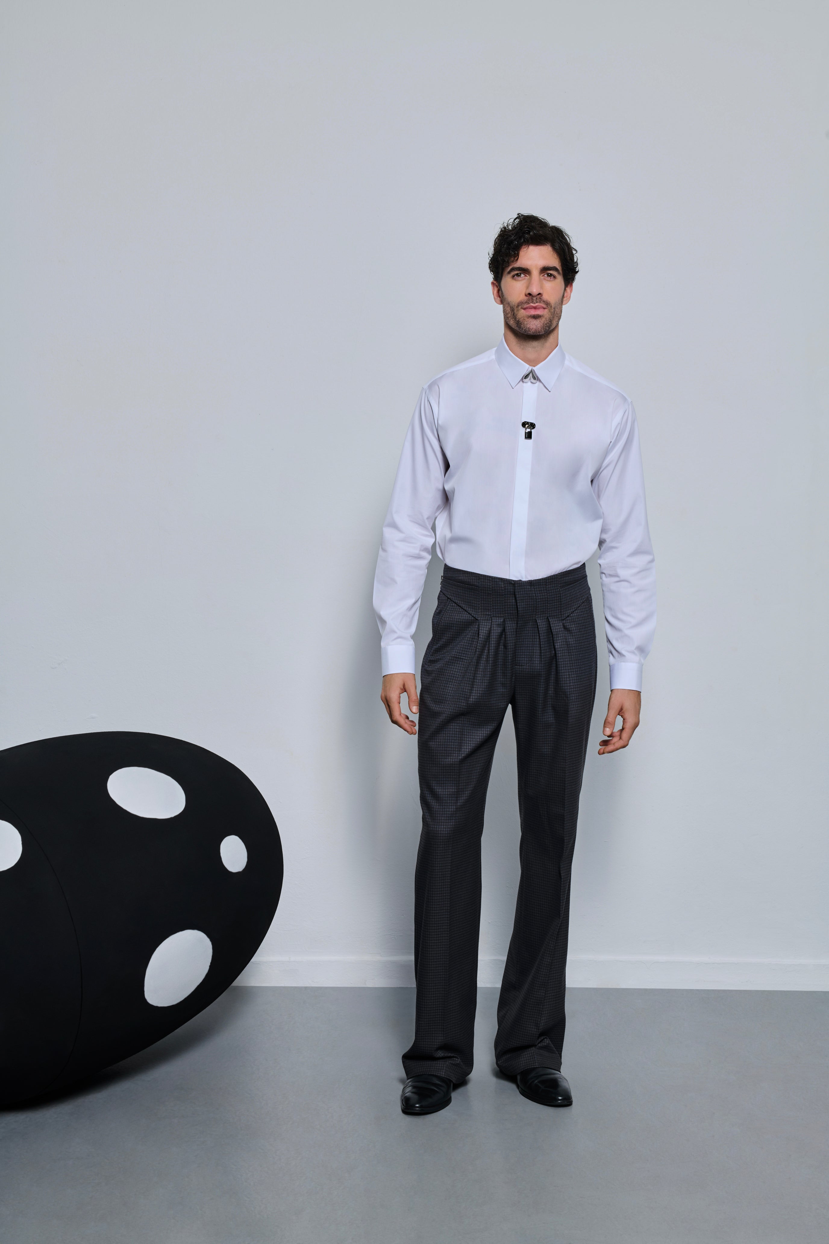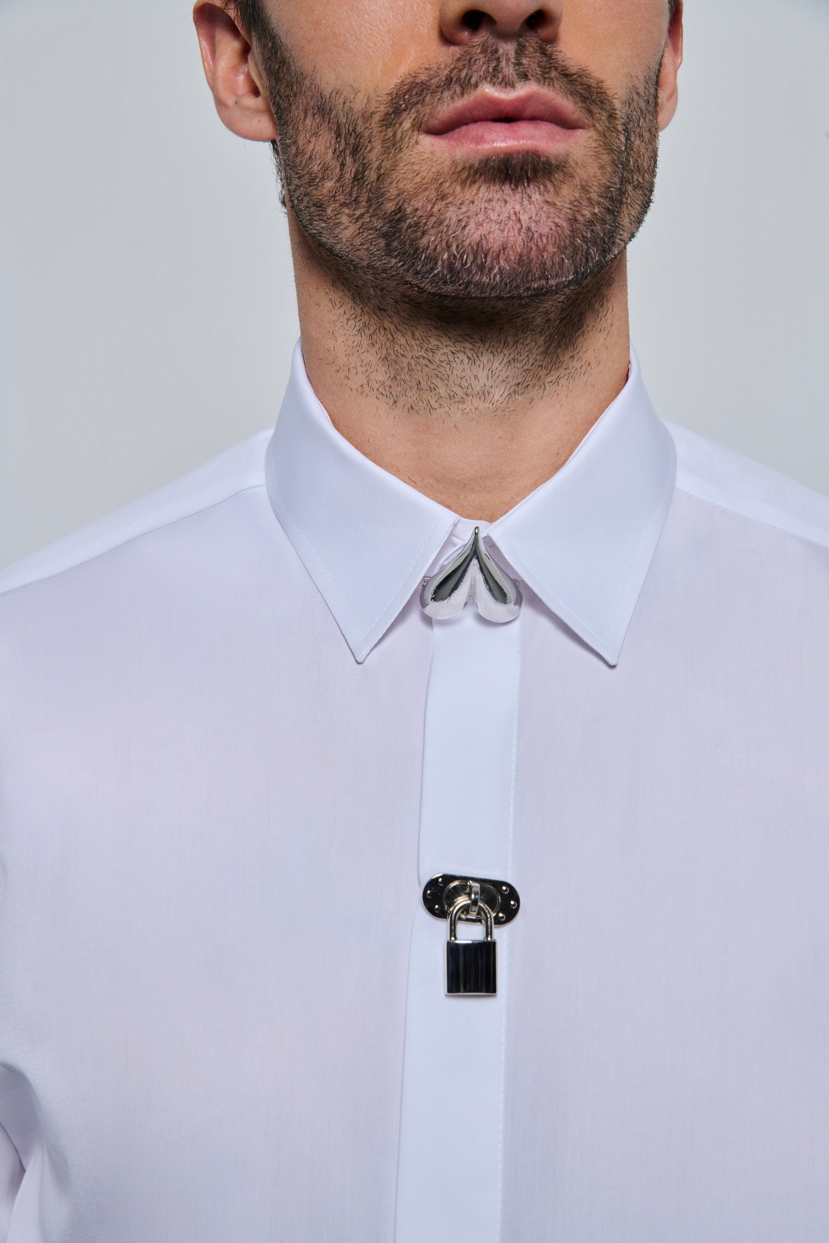 قميص بوبلين أبيض مصمم بدقة وبمقاس قياسي، مزود بقفل ومفتاح معدني فضي اللون على الصدر.