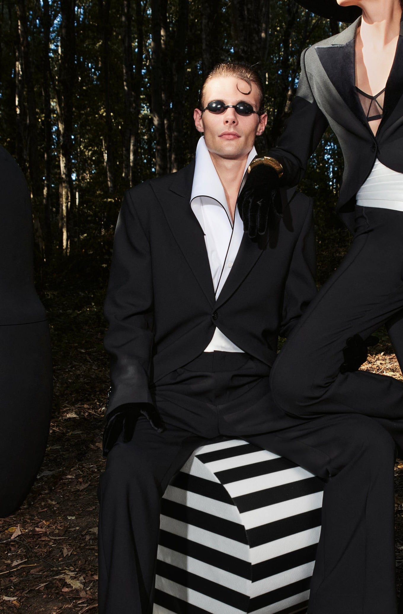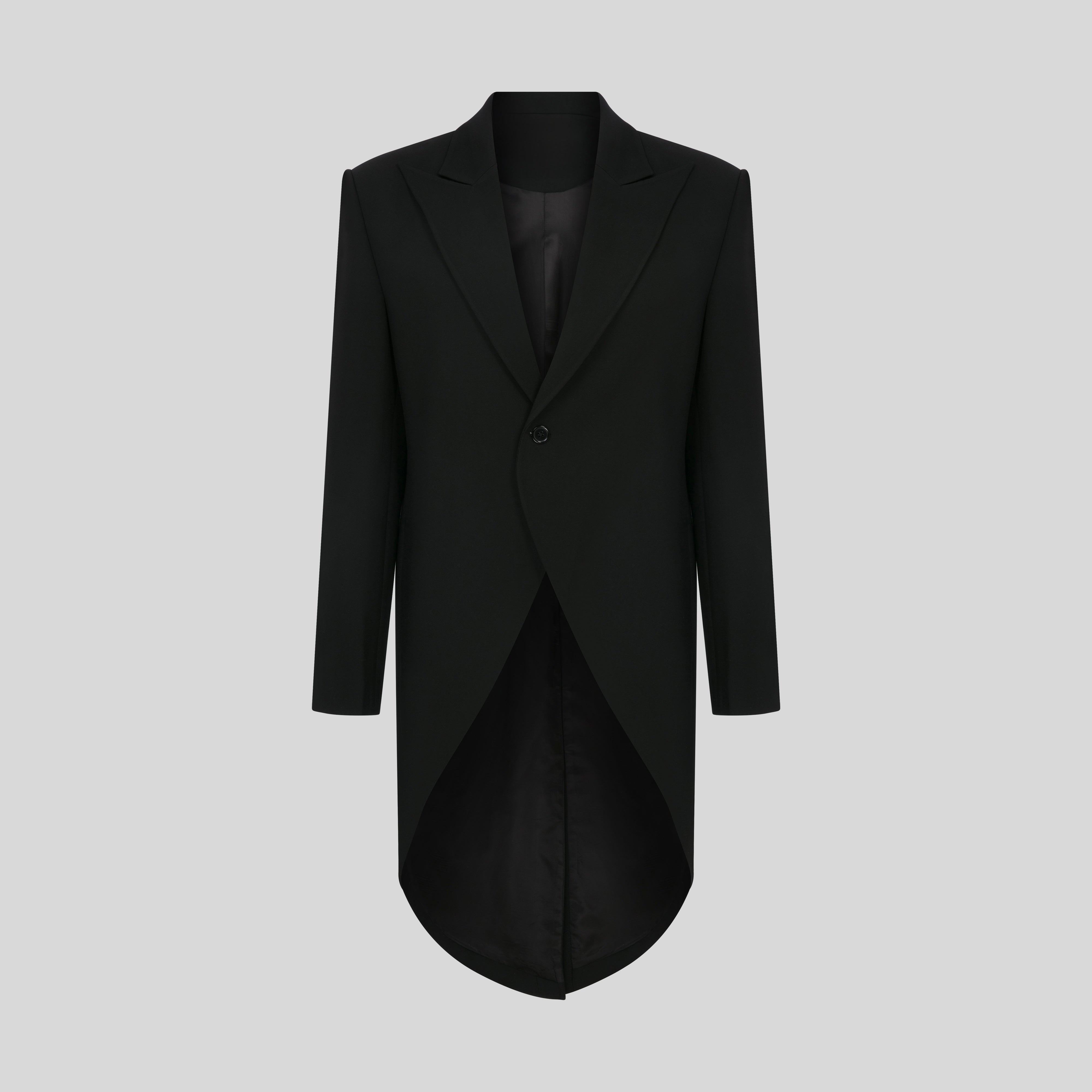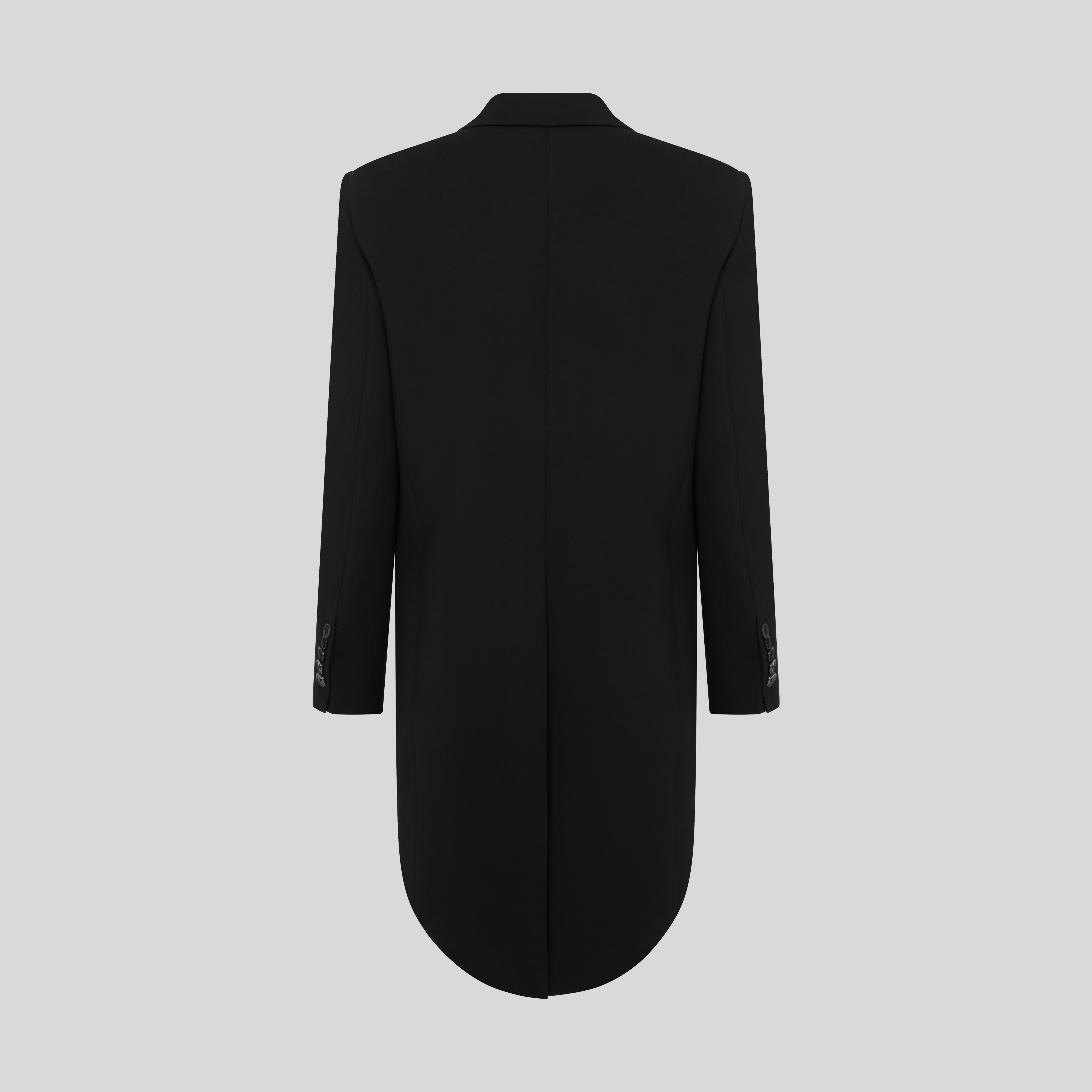 جاكيت مزدوج الصدر، بزر واحد مصنوع من صوف أسود مع قطع ظهر ممدود.