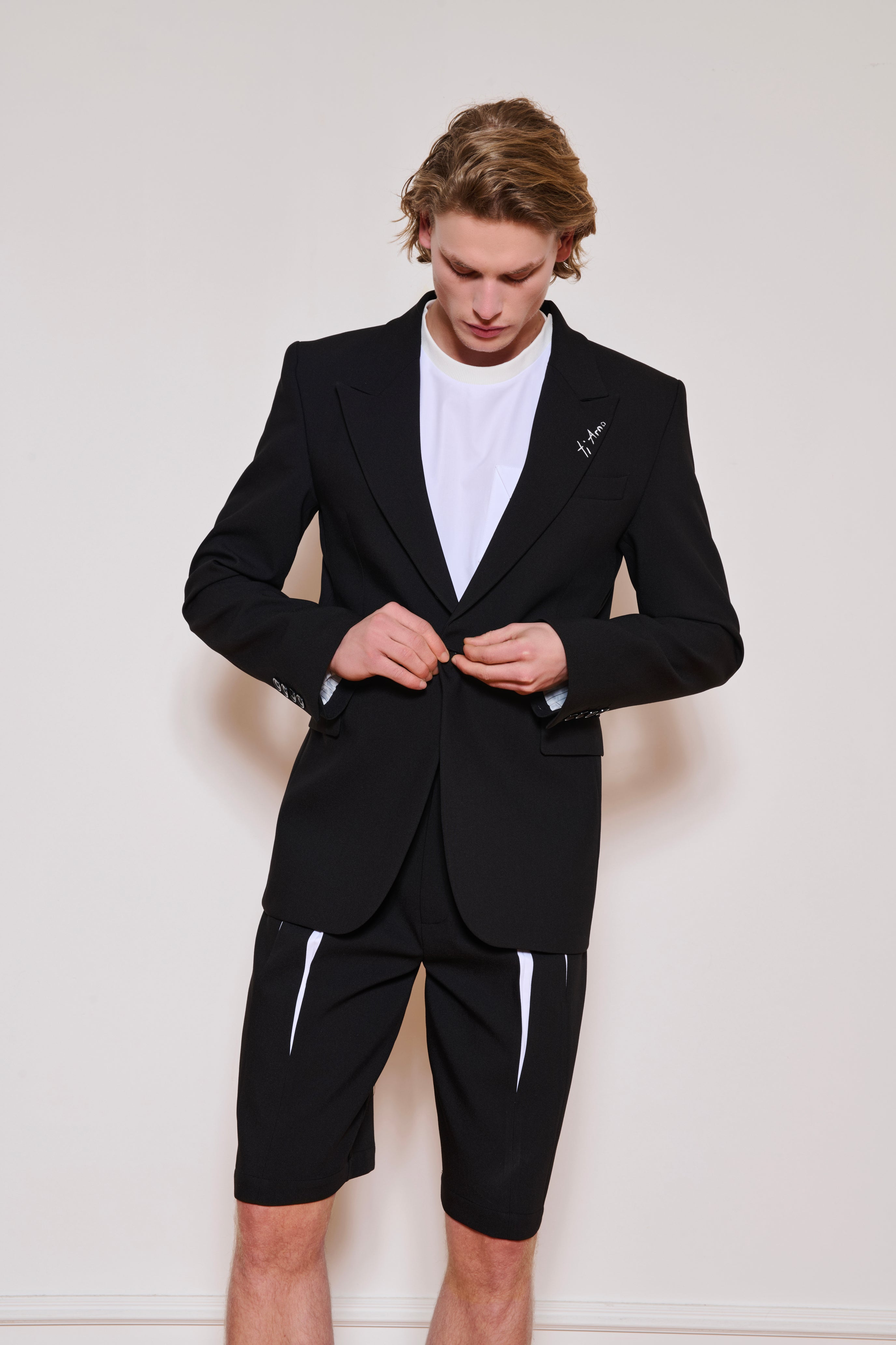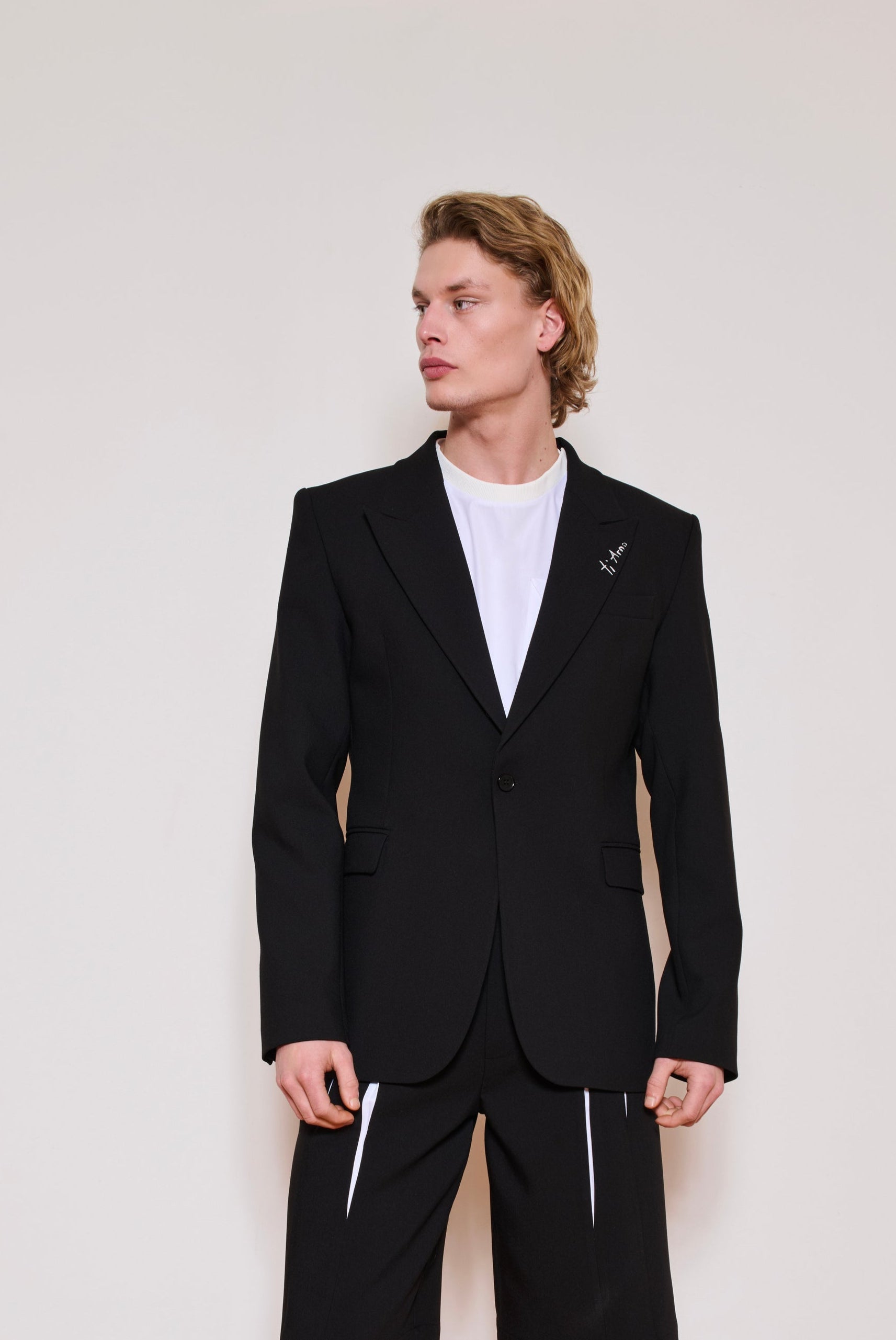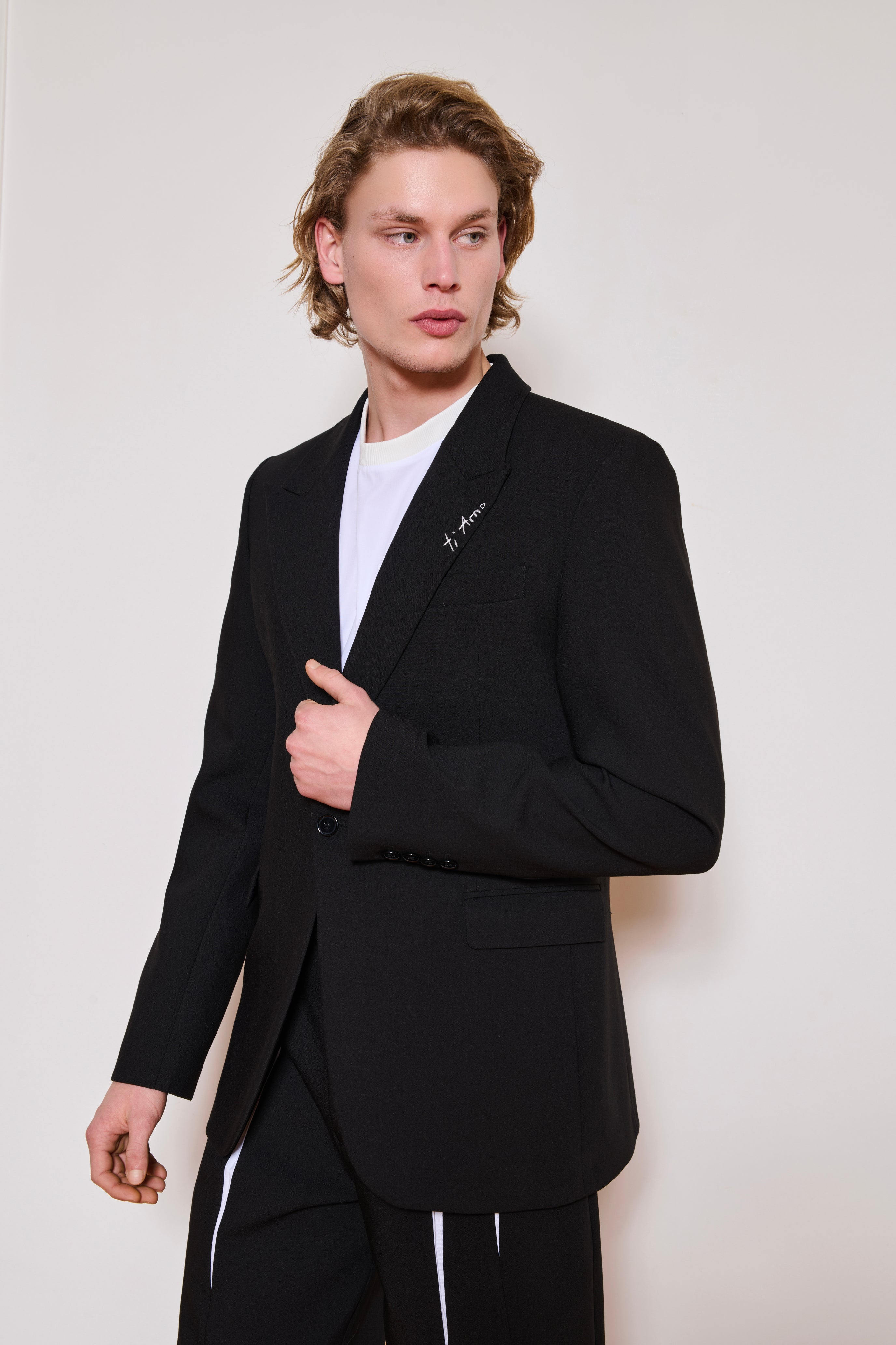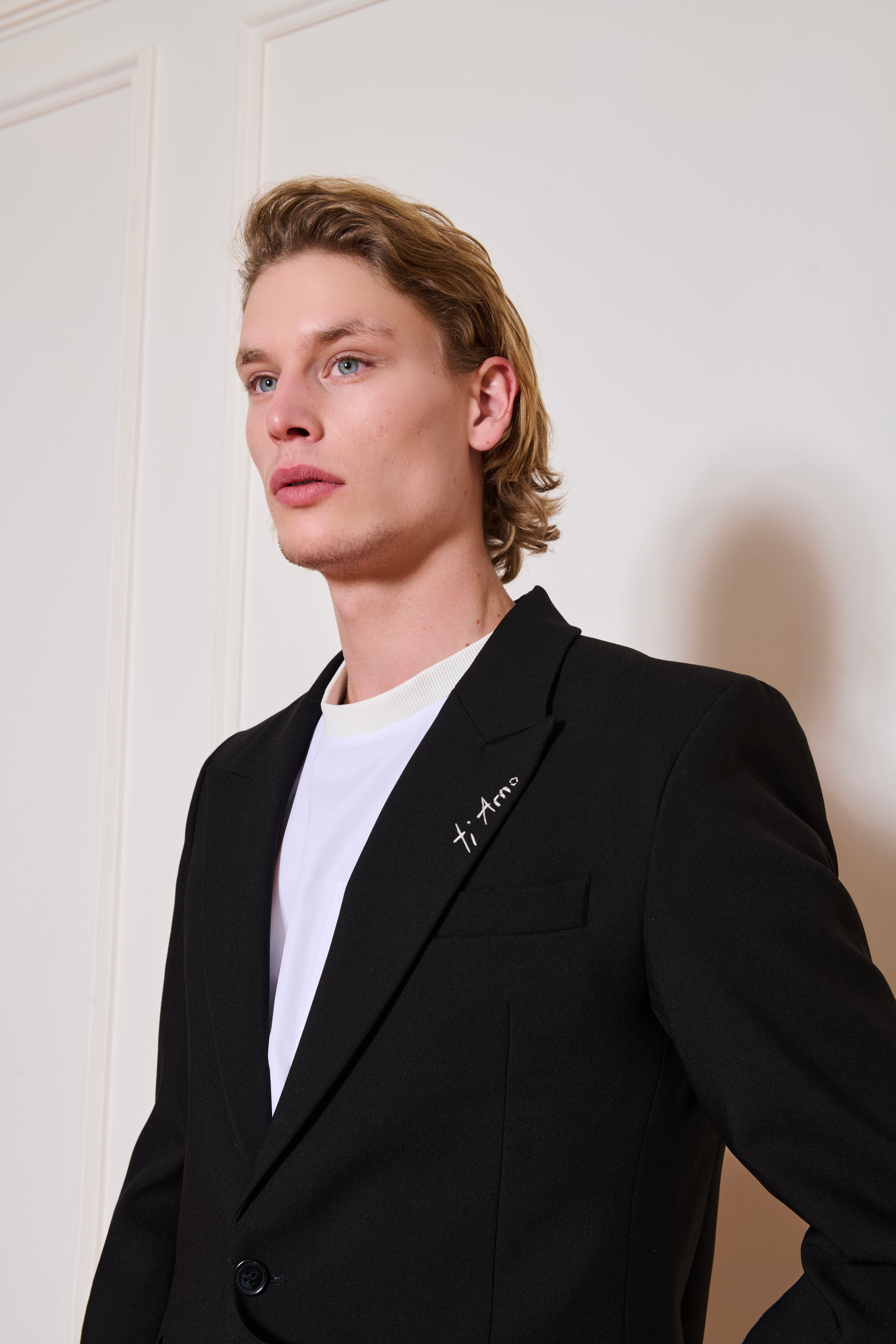 بليزر إيطالي أسود كبير الحجم مصنوع بحب على يد أفضل الخياطين مع تطريز أبيض مكتوب عليه بخط اليد "Tİ Amo" على الياقة.