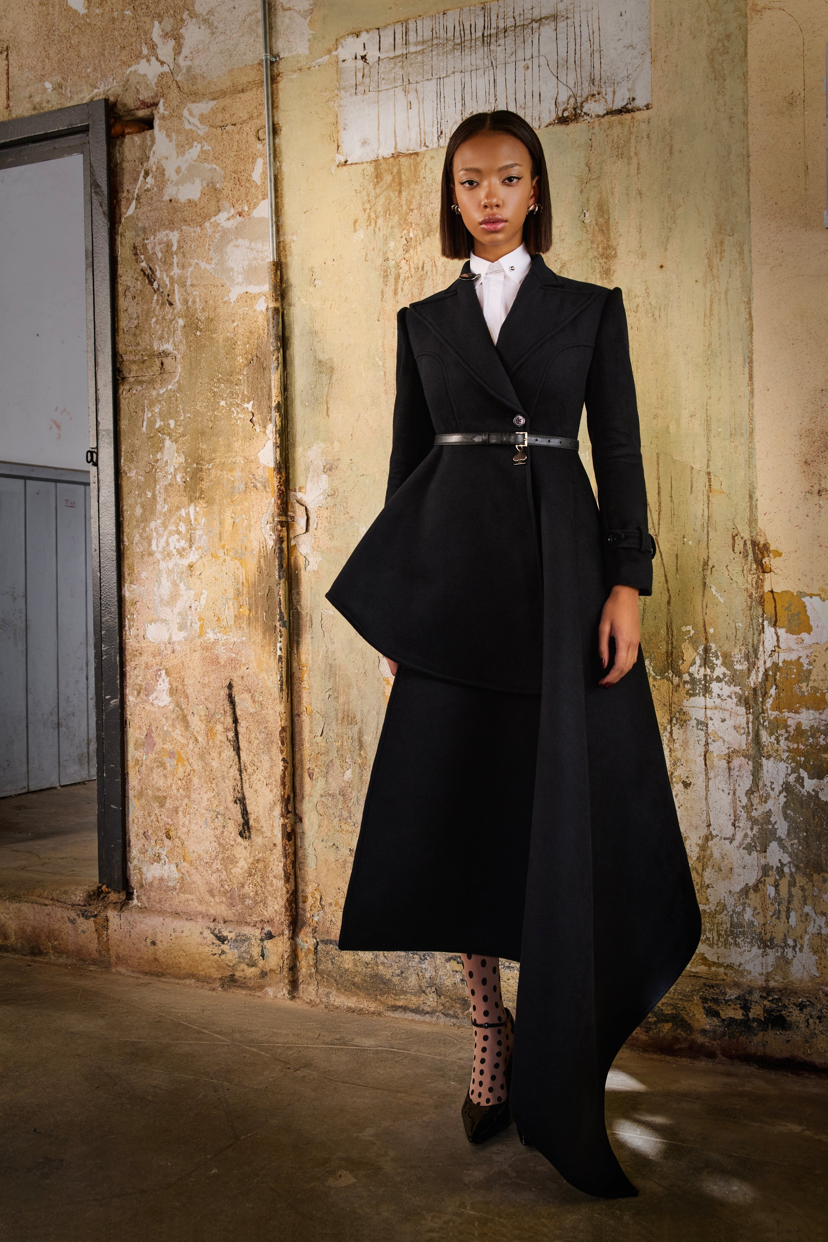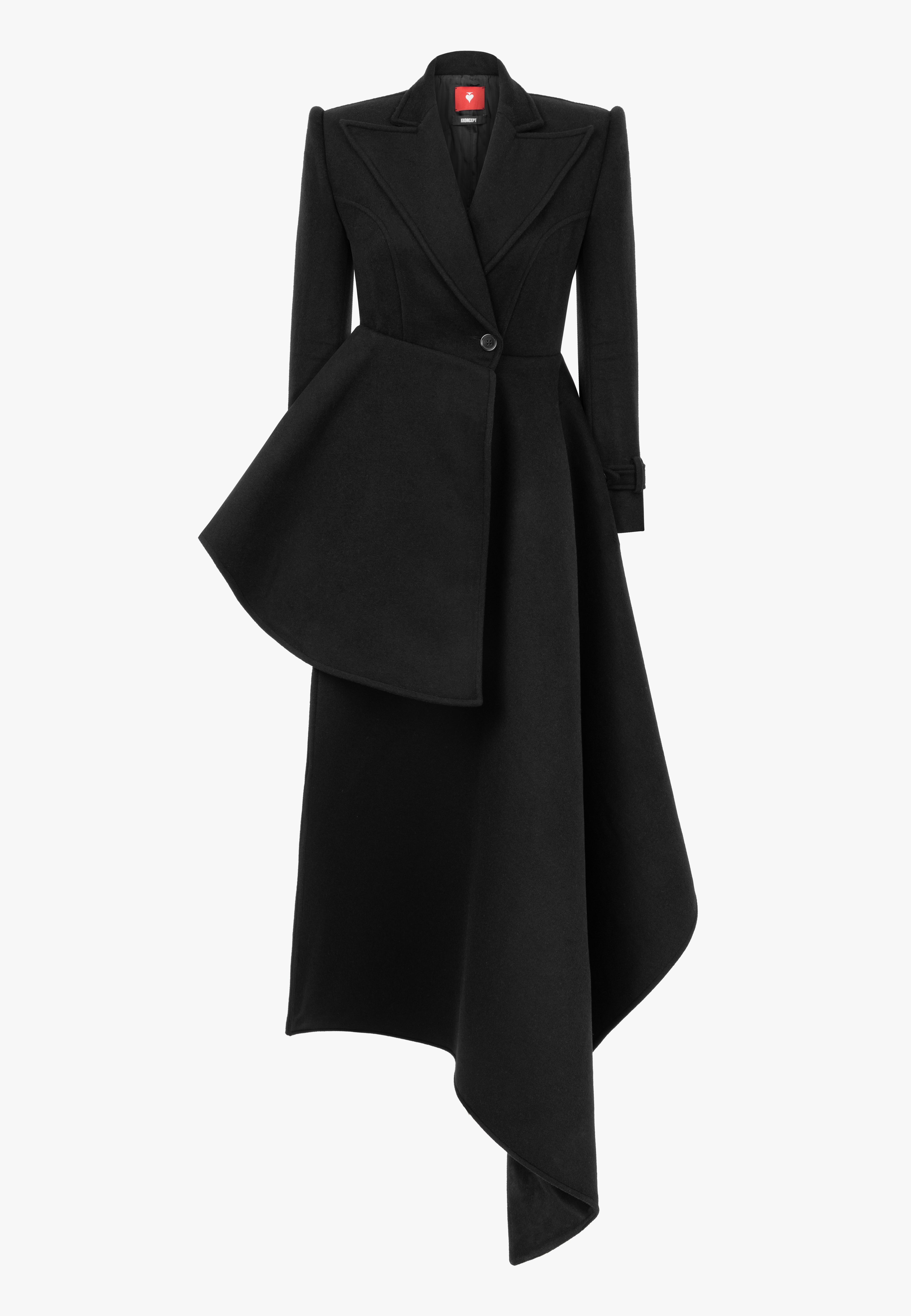 Asymmetrical Women Black coat, long on one side.