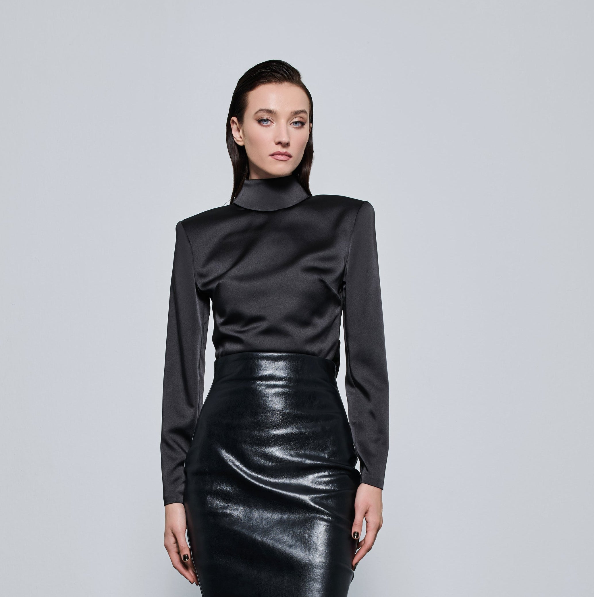 Standard fit Black Satin shirt with an open back cut and drapes on the sides.