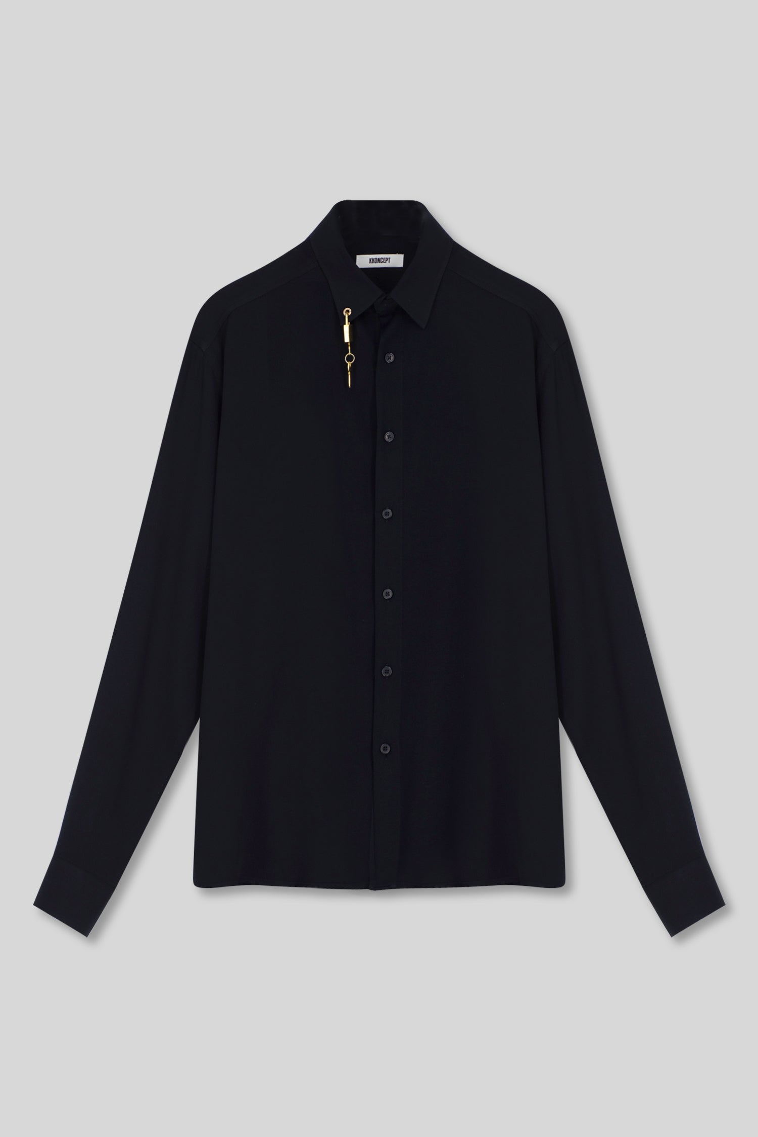 Loose fit tailored Twill black shirt with a golden lock and key attached to the collar.