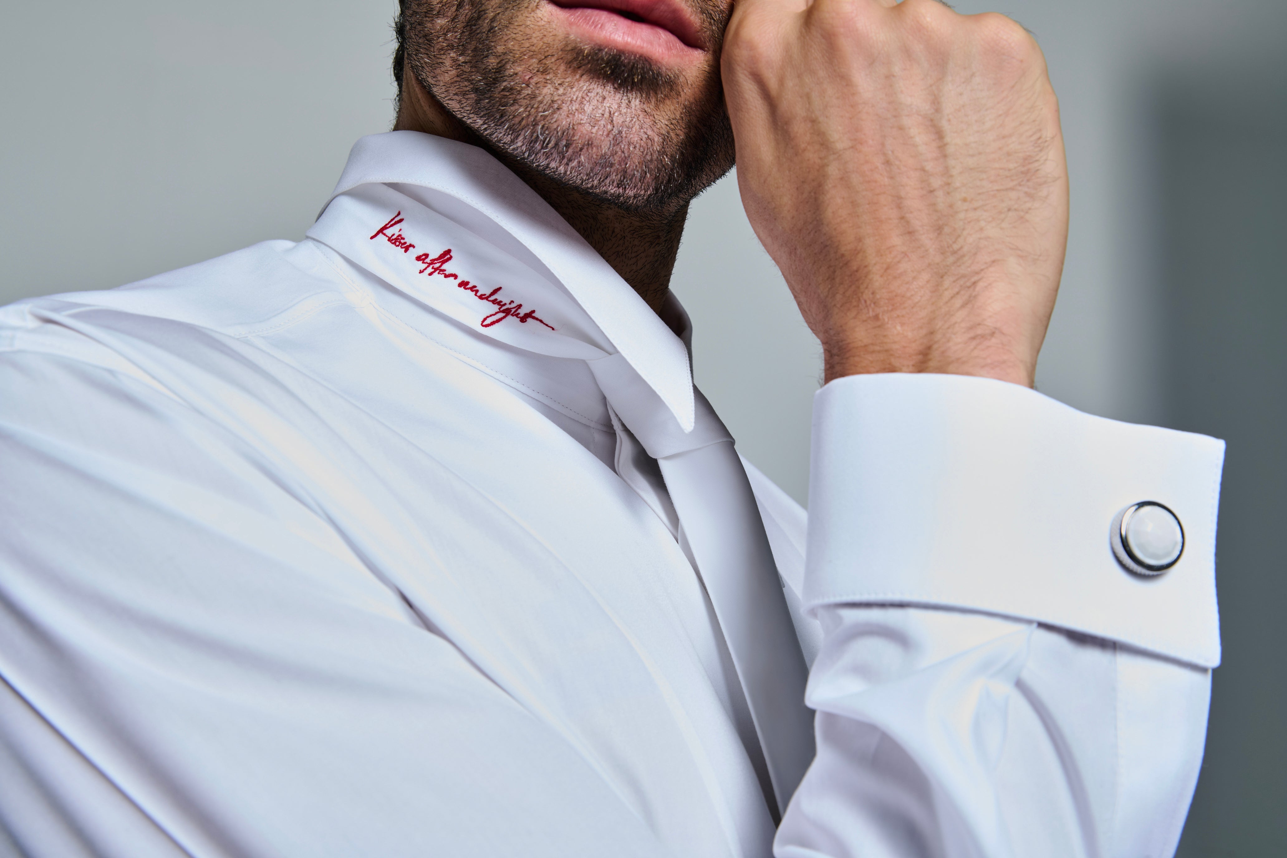 Under collar embedded with a handwritten embroidery saying 'Kisses after midnight.'