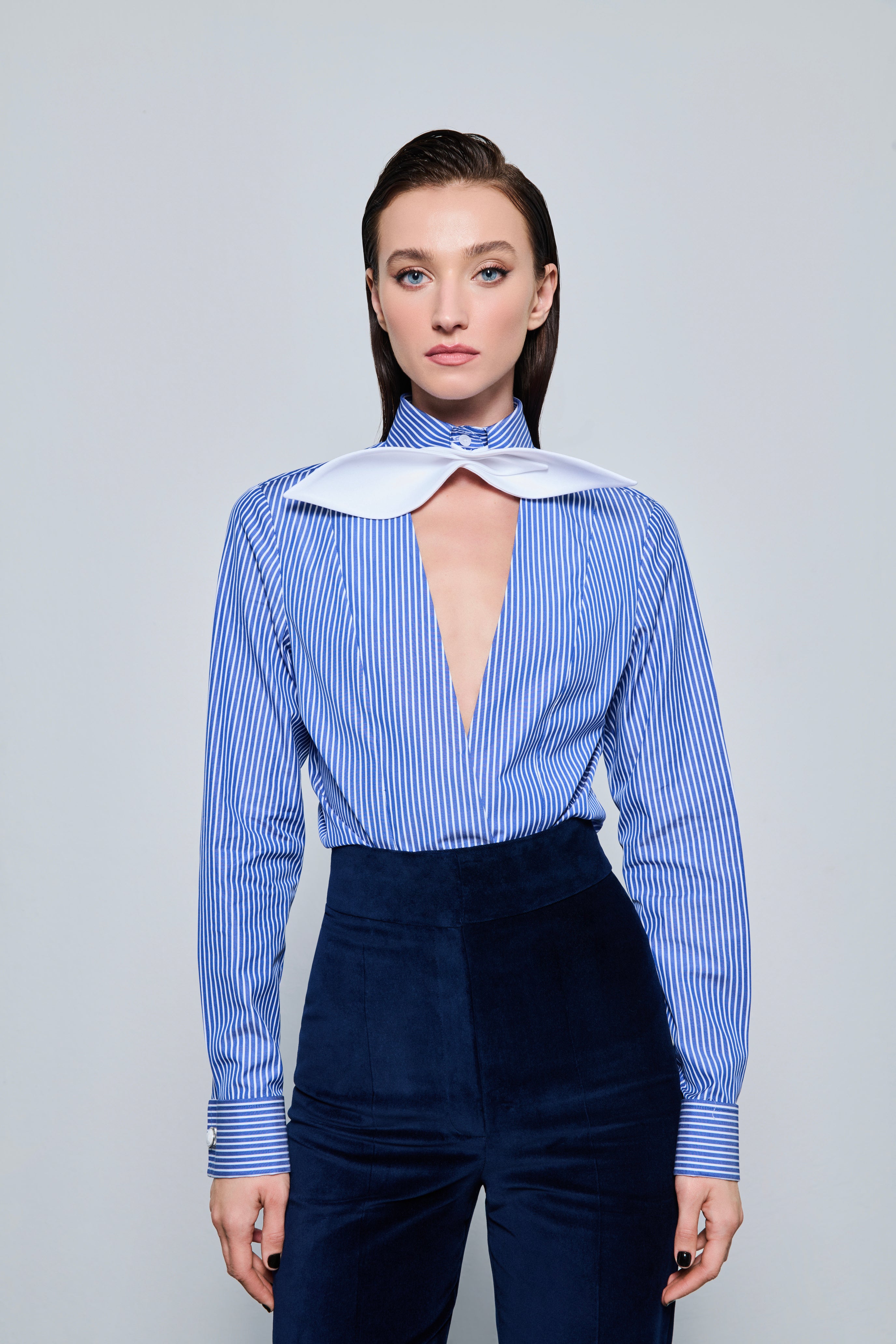 Slim fit Blue & White Striped poplin shirt made with 100 % cotton fabric with a V shaped opening on the chest.