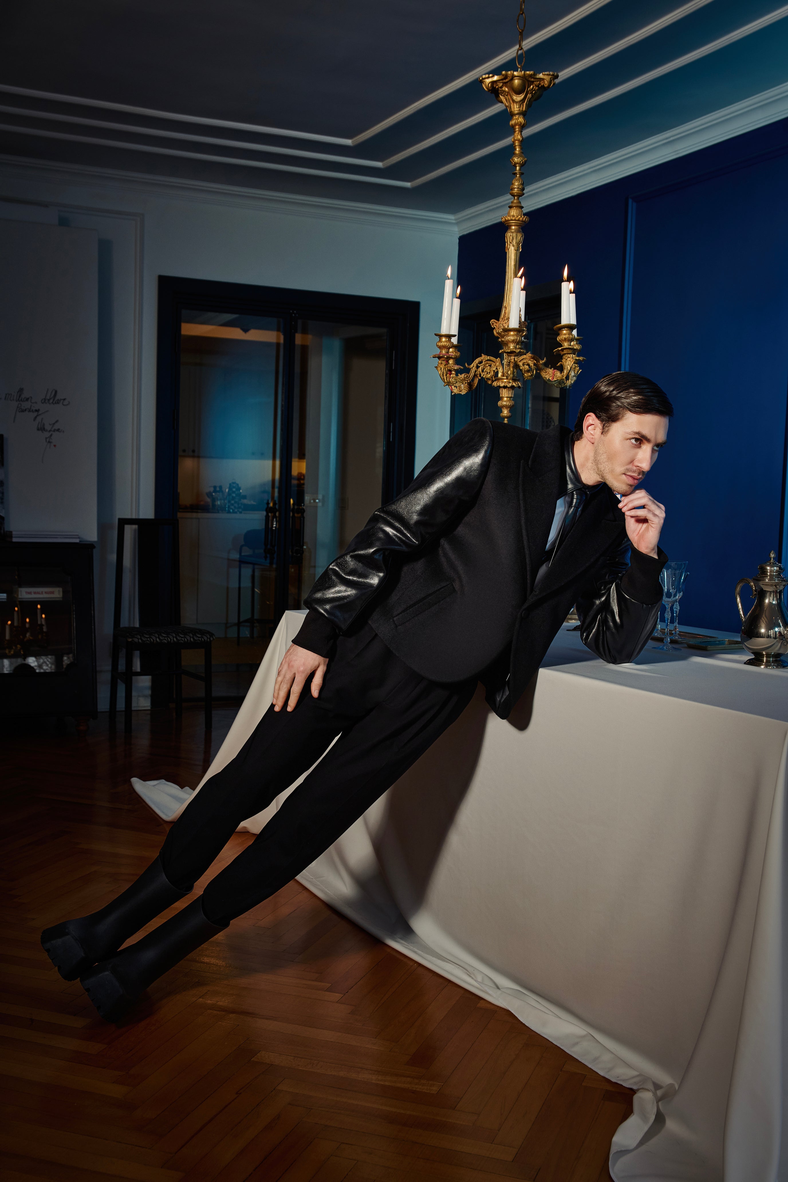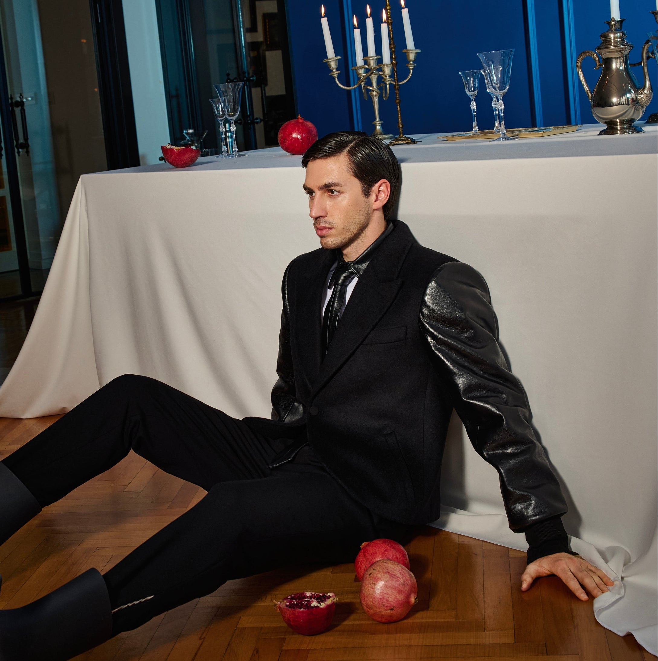 La Veste Noire is crafted from 100% wool, forming a sharp, timeless tailoring base that speaks to tradition and structure. In contrast, the calfskin leather sleeves—made from 100% calfskin leather—introduce strength, rebellion, and protection, transforming the blazer into a statement of duality.