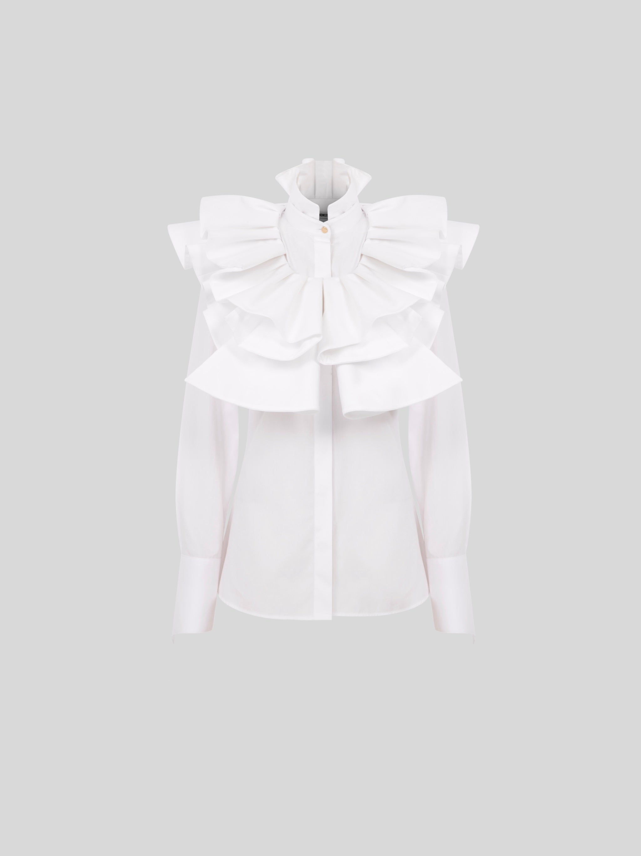 Finely tailored White Poplin shirt with ruffles on the collar and a long neck.