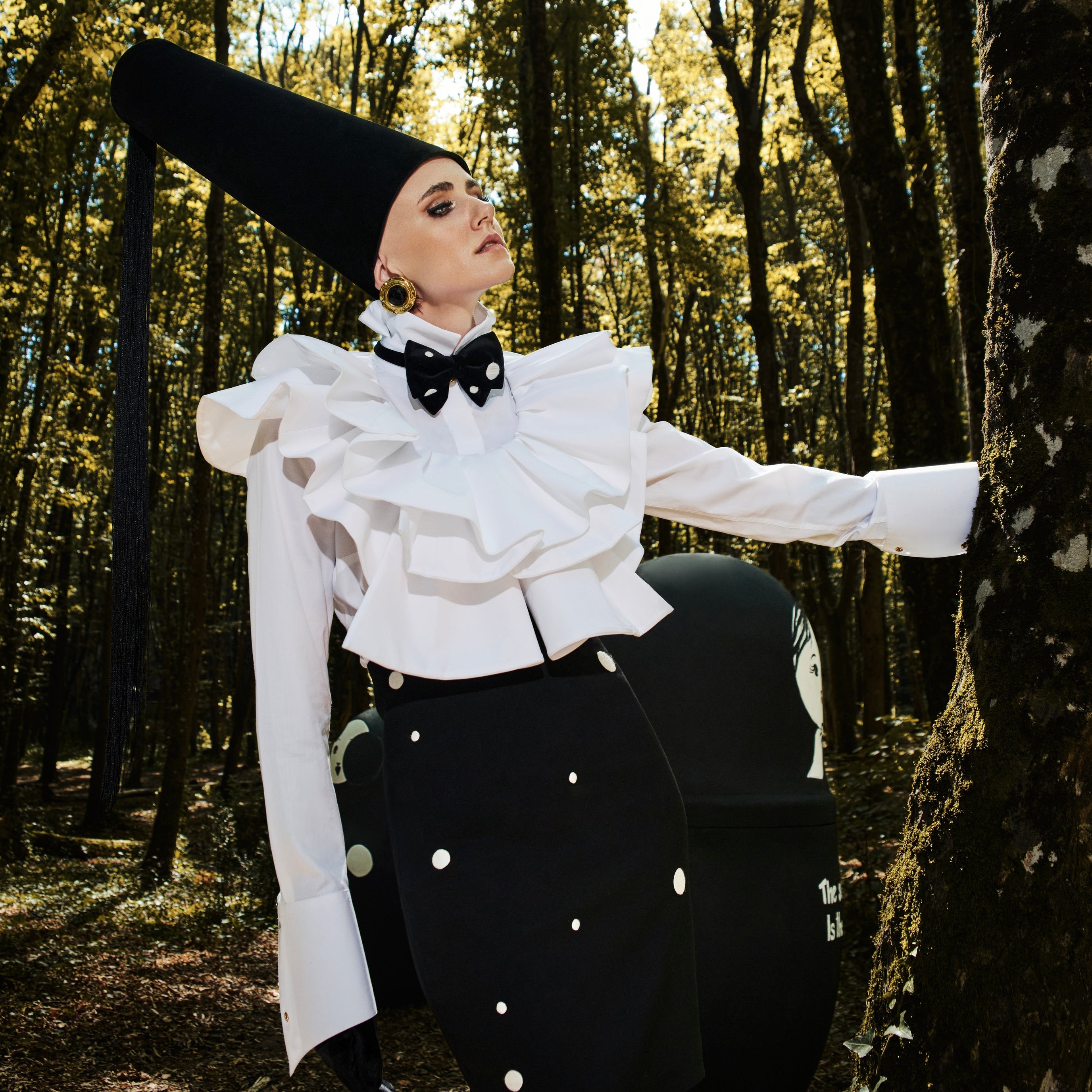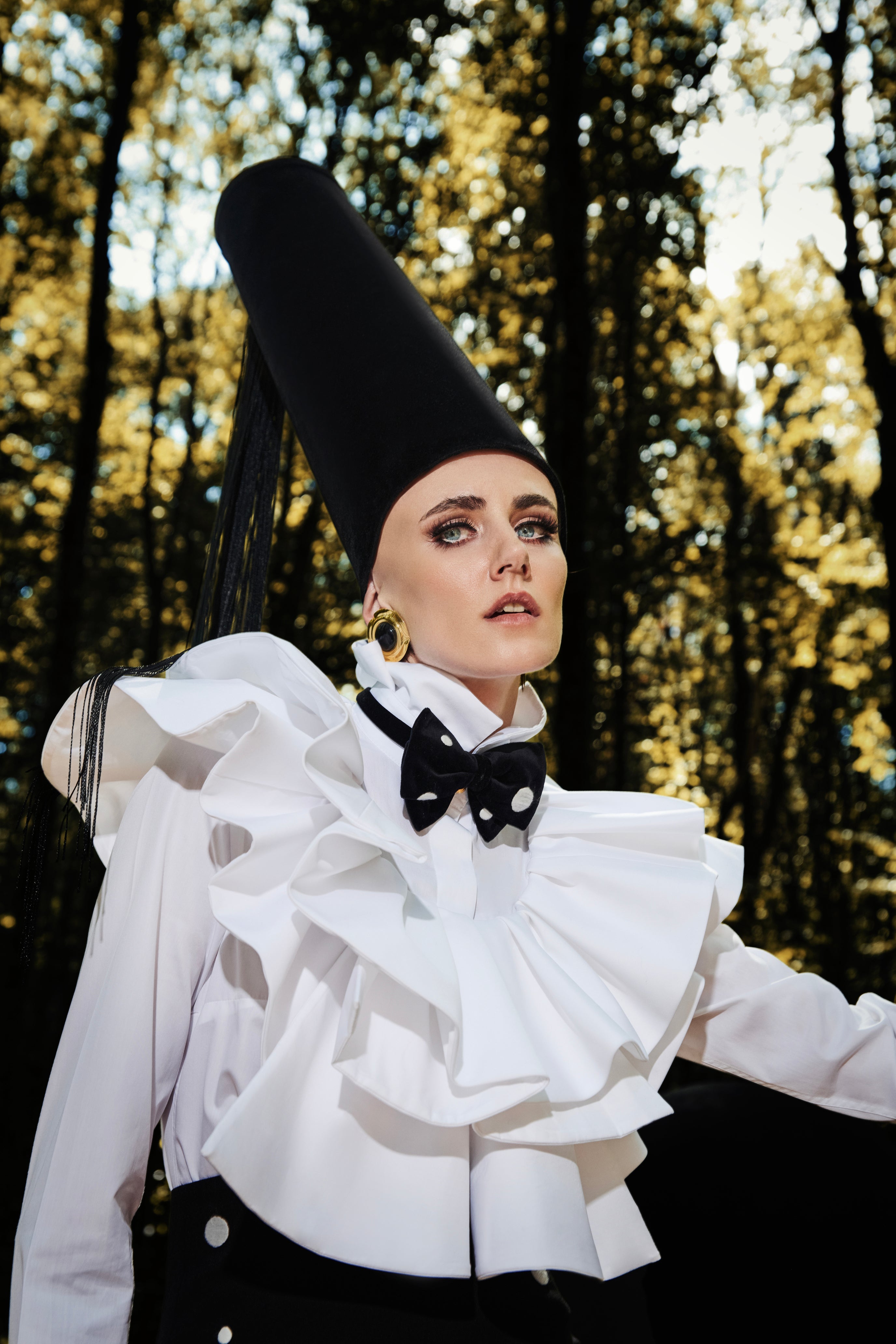 Finely tailored White Poplin shirt with ruffles on the collar and a long neck.