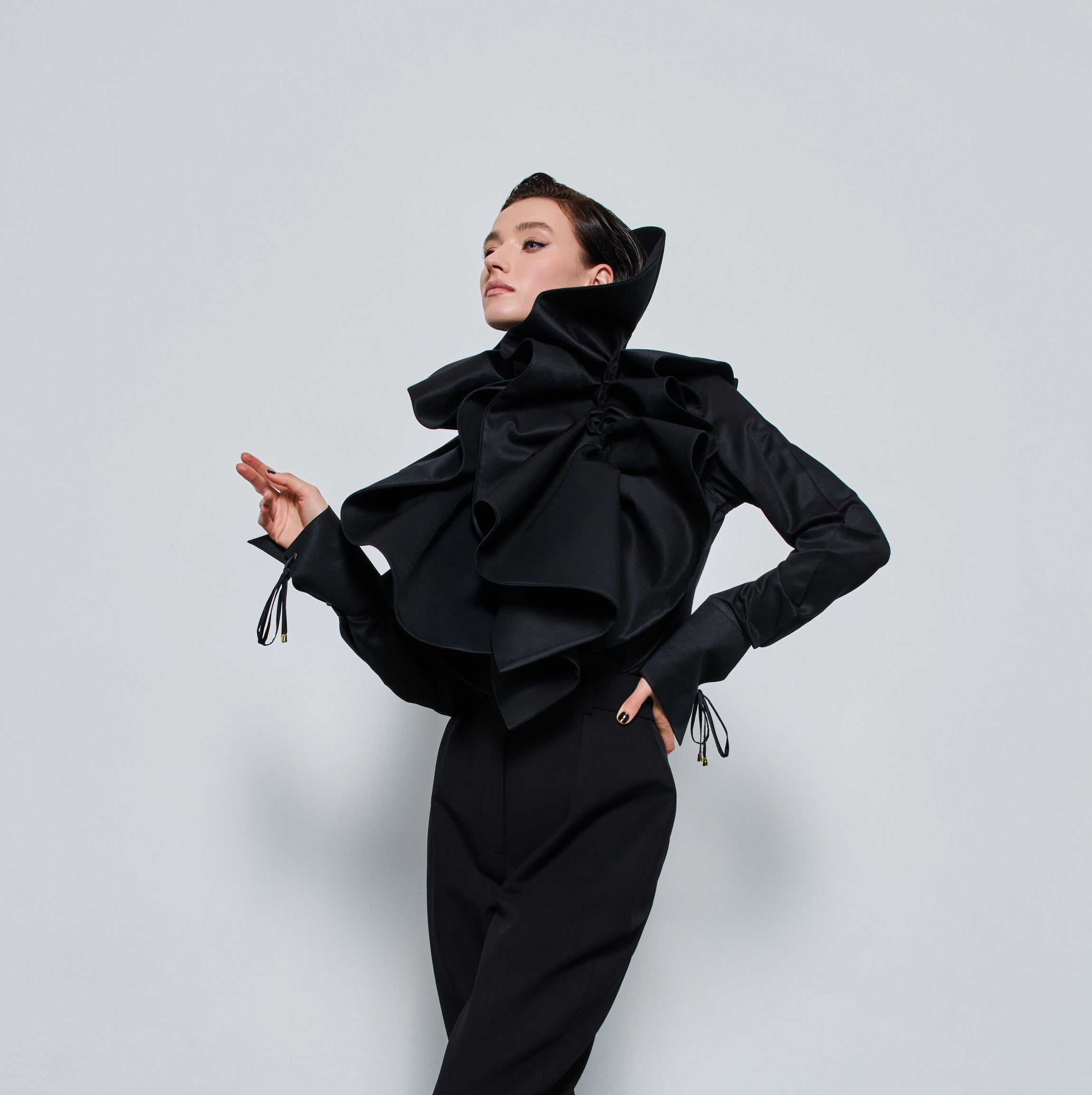 Finely tailored Black Satin shirt with ruffles on the collar and a long neck.