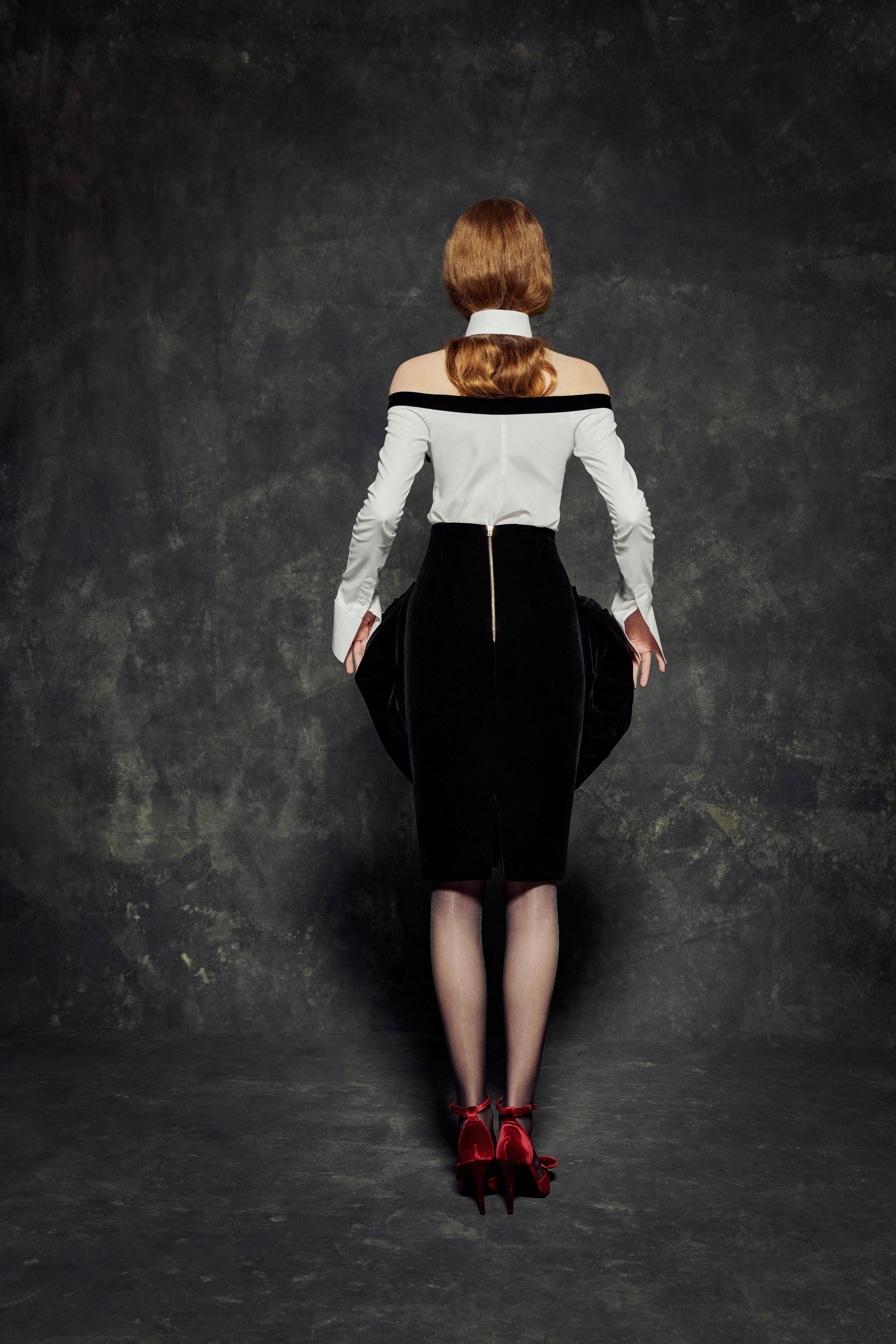 Off-shoulder slim-fit shirt crafted from a cotton and Lycra blend, designed to sculpt the body with a smooth, flexible fit. Detailed with a certified velvet bow that adds a refined, couture-inspired accent. Finished with detachable collars, allowing for versatile styling from classic to expressive.