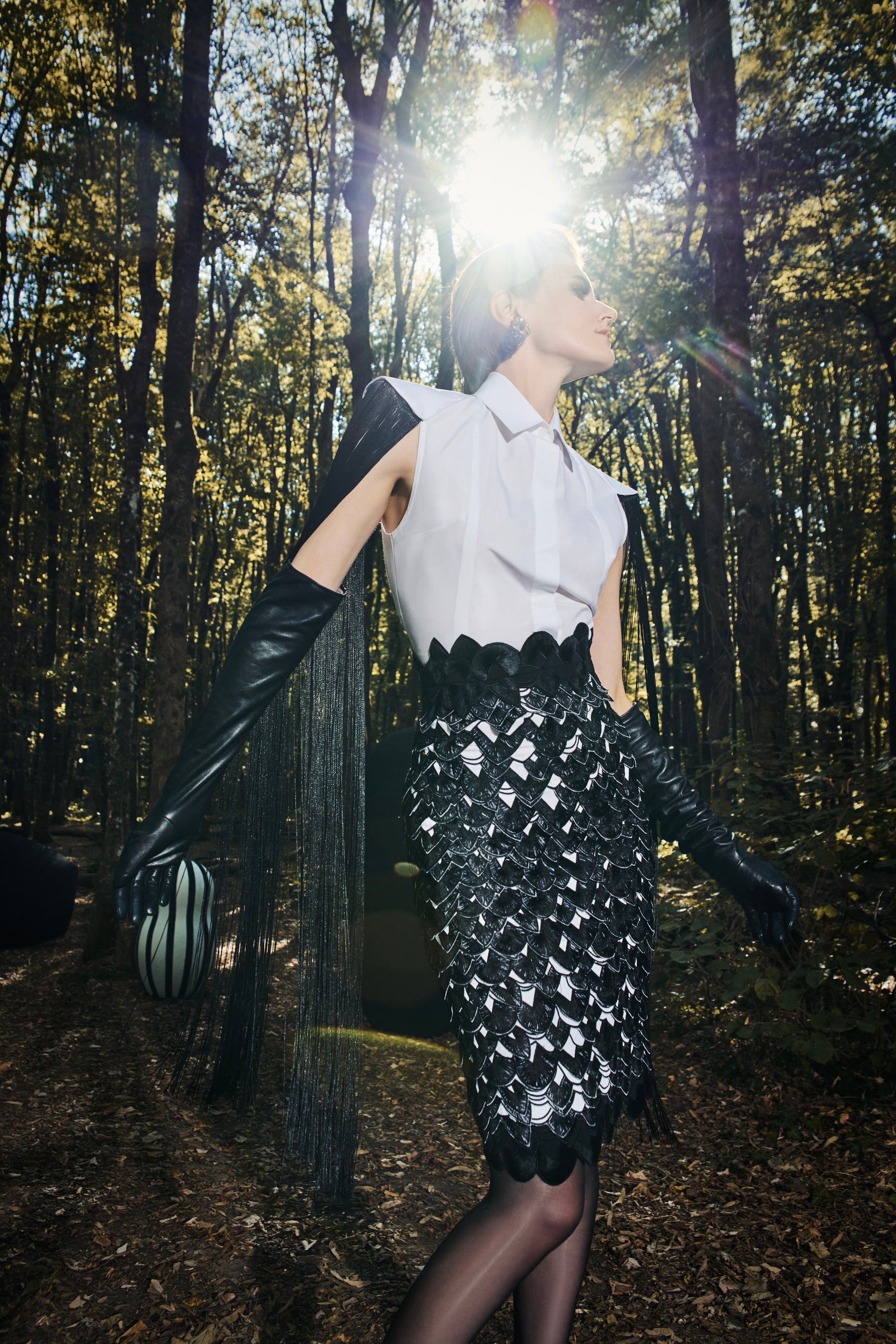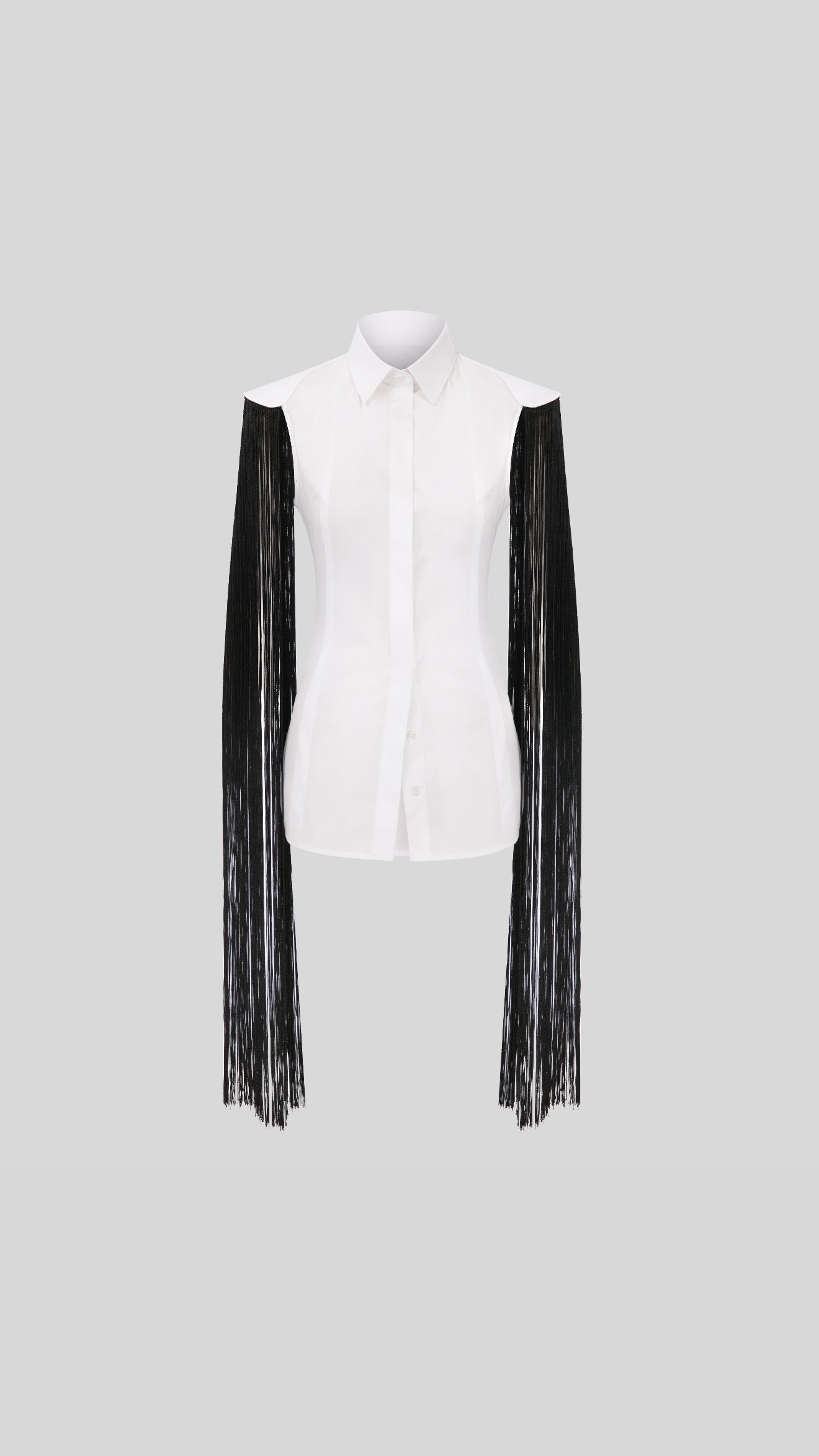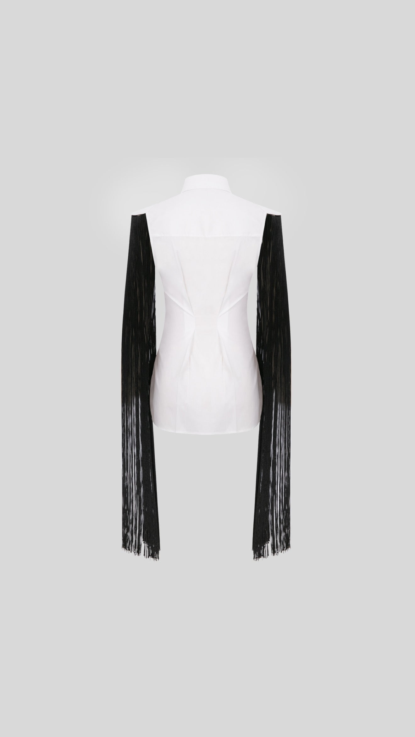 Fit classic sleeveless White Gabardine shirt with an uplifted shoulder cut and long falling black stringed sleeves.