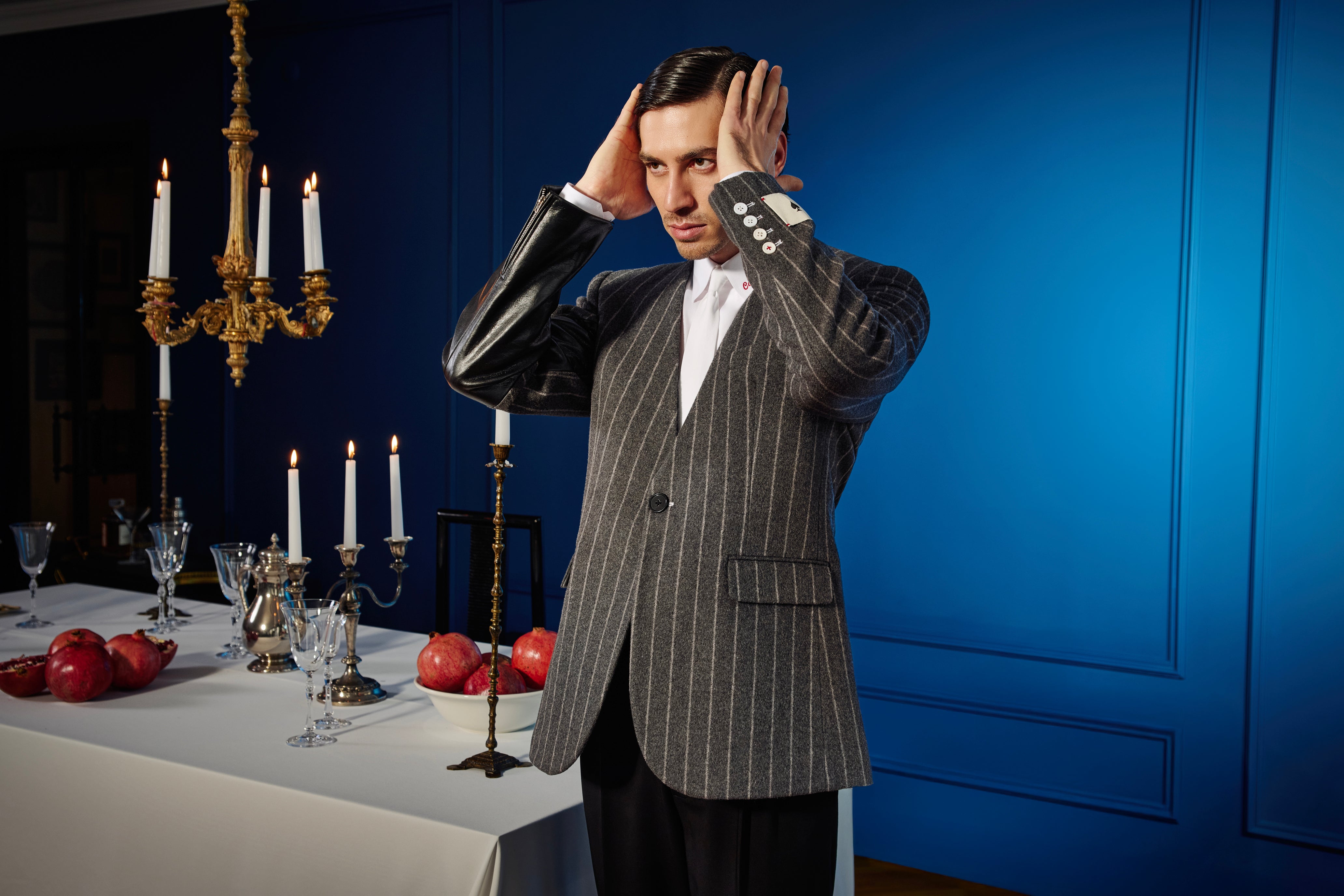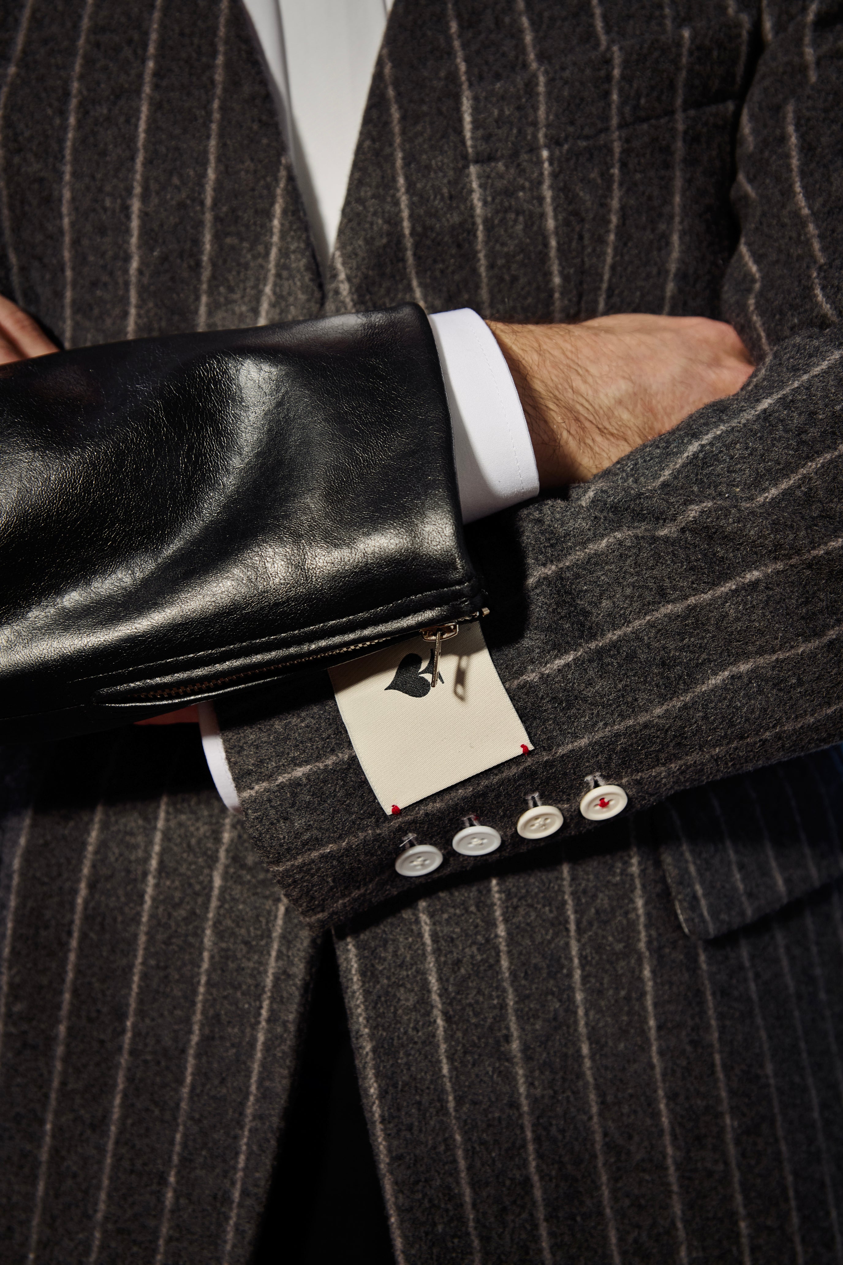 The Grey Blazer is crafted from 100% striped wool, offering structure, precision, and a timeless tailoring foundation. A single asymmetrical sleeve in 100% calfskin leather disrupts the classic silhouette, introducing tension between tradition and rebellion.