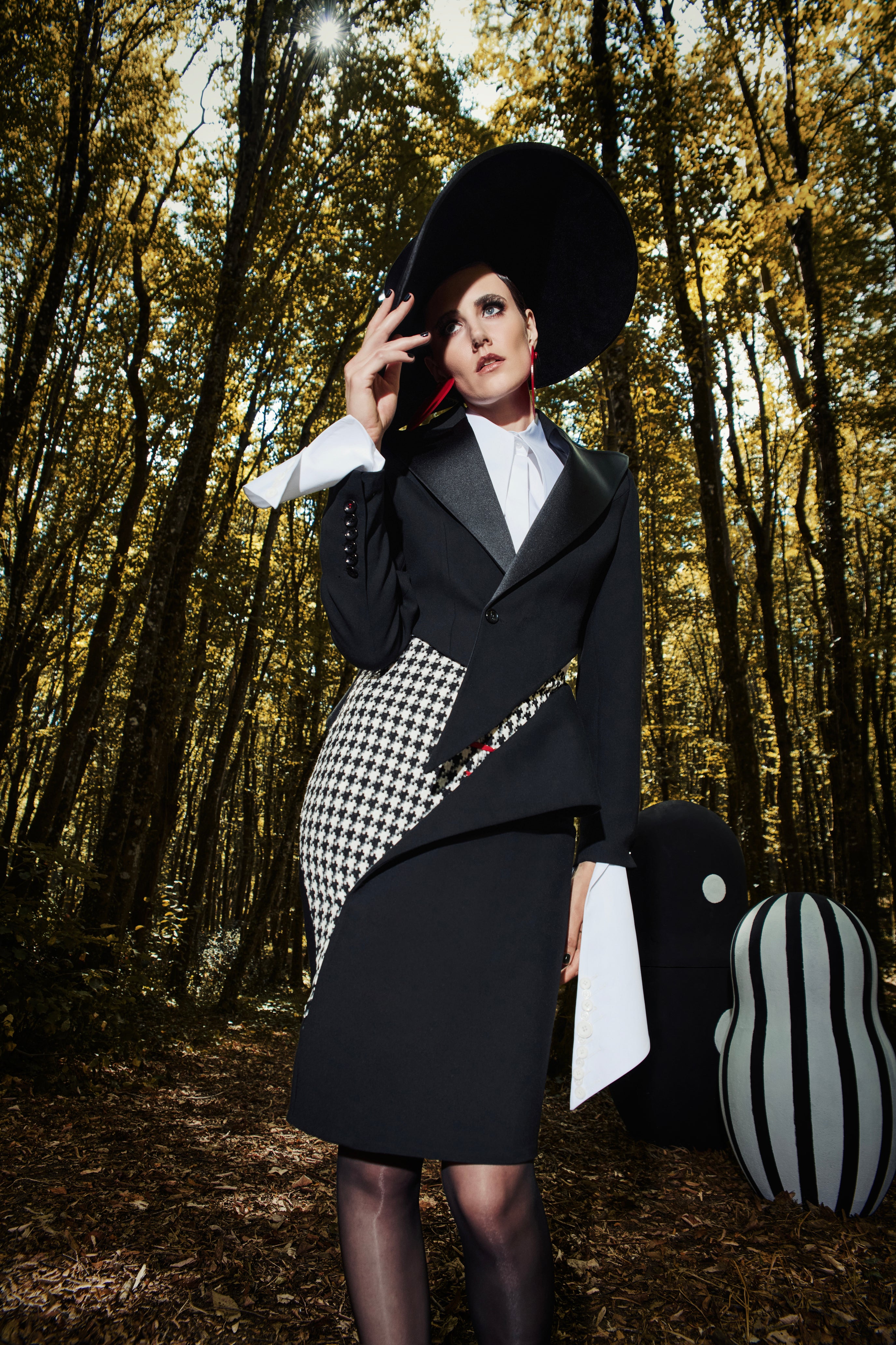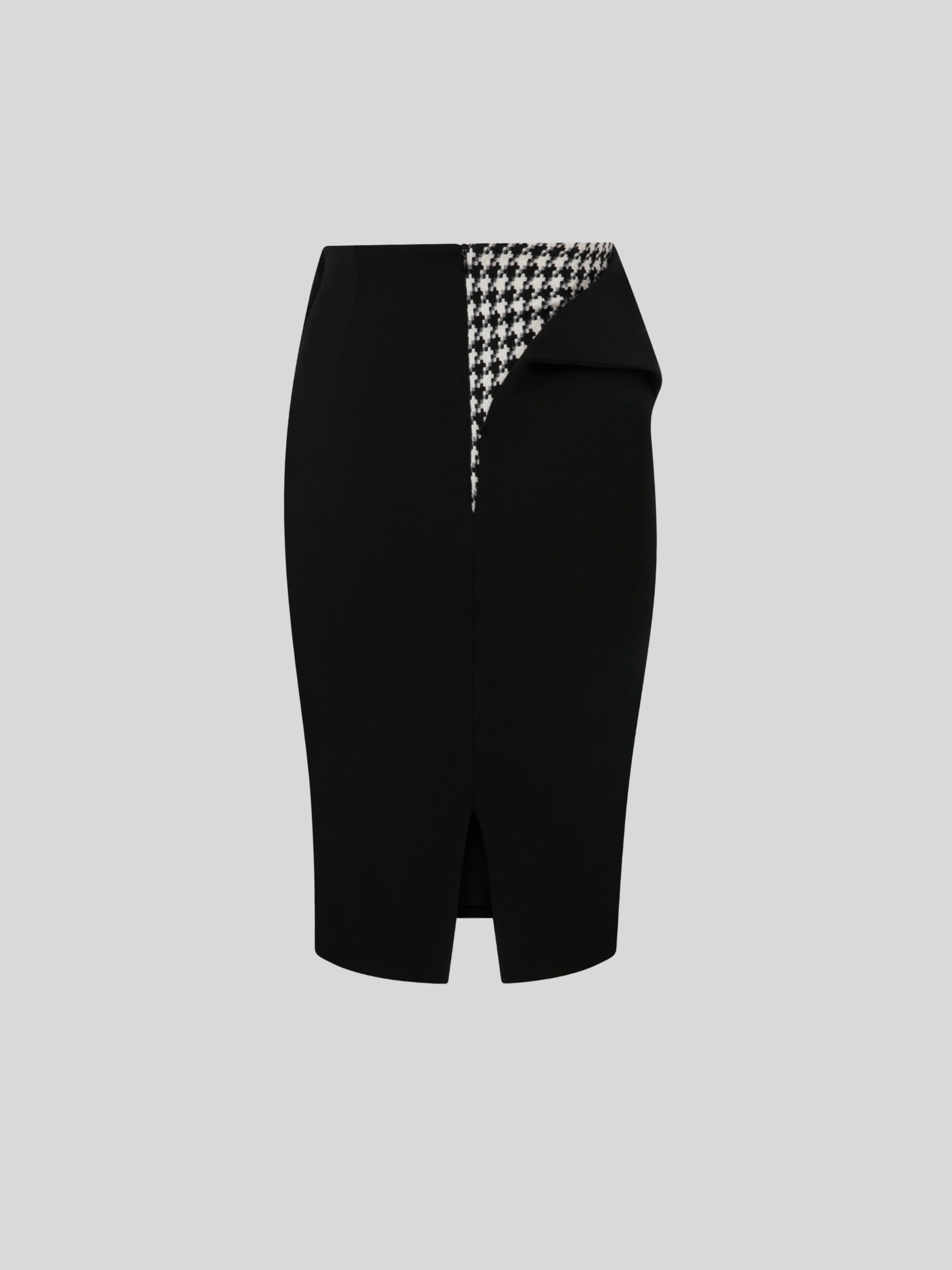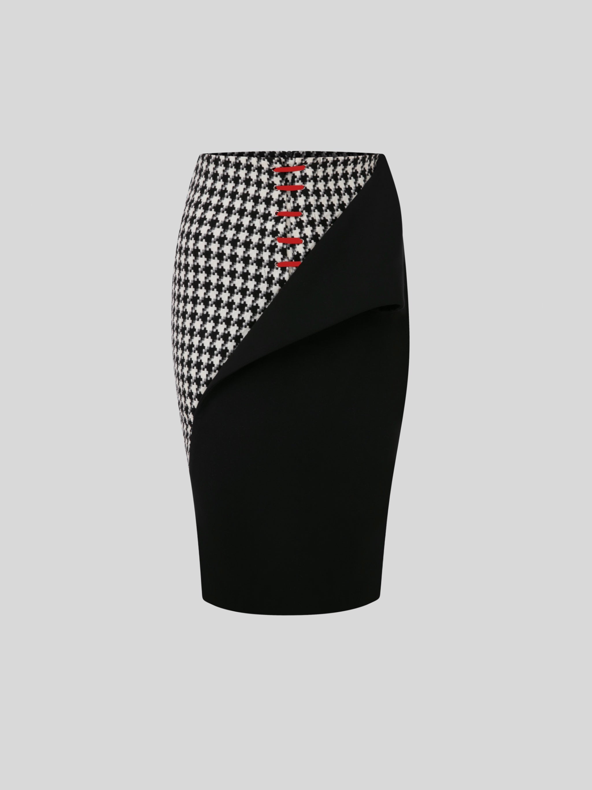 HIGH-WAISTED PENCIL SKIRT MADE WITH VISCOSE , FEATURING AN INTERIOR WOOL HOUNDSTOOTH FABRIC FINISHED WITH RED CORSET LACING TAPE AND A BACK ZIP.