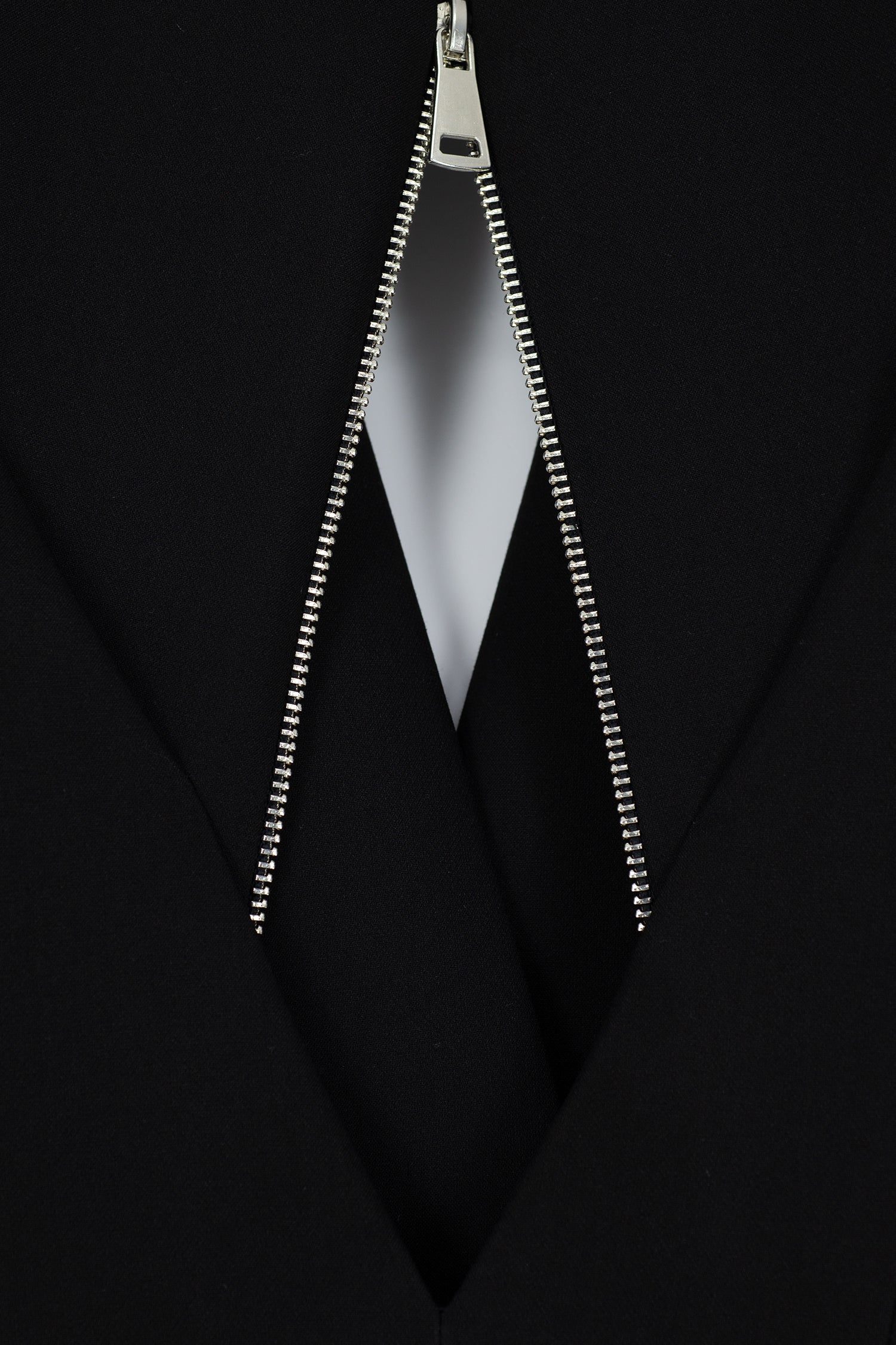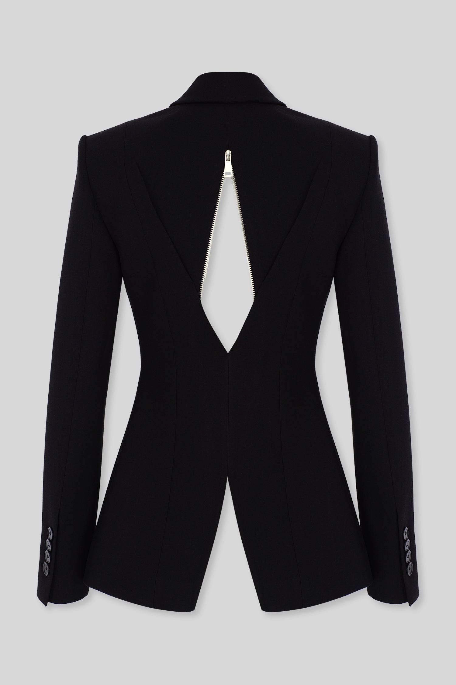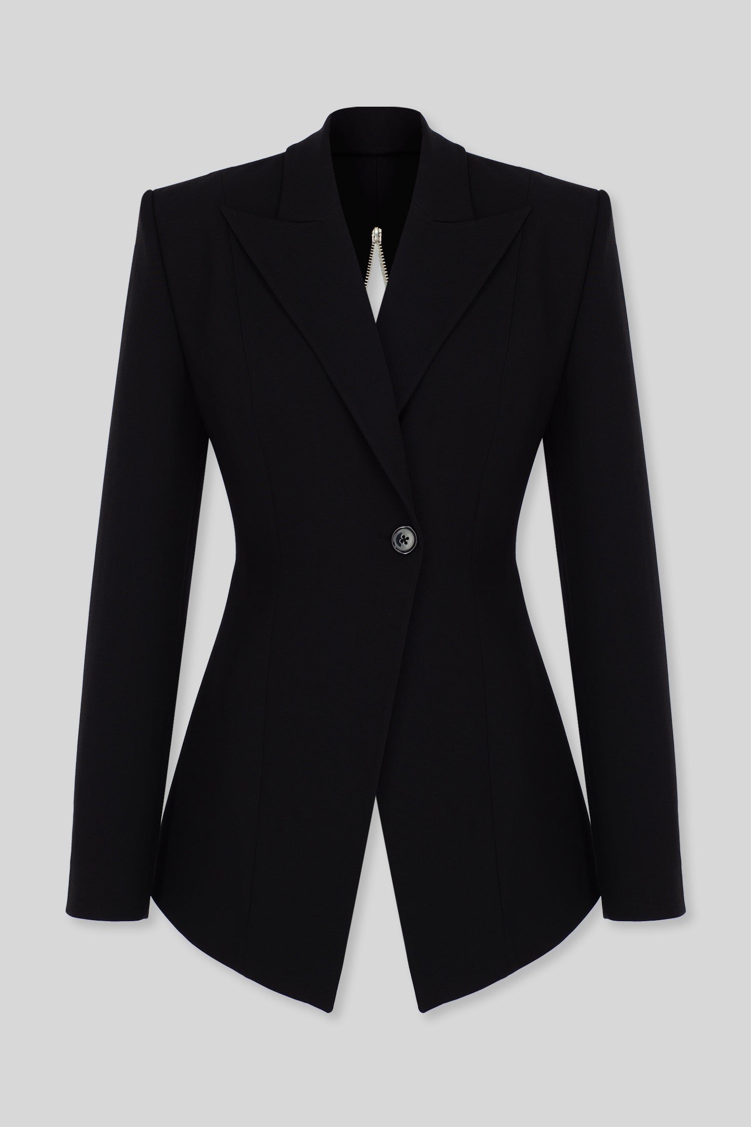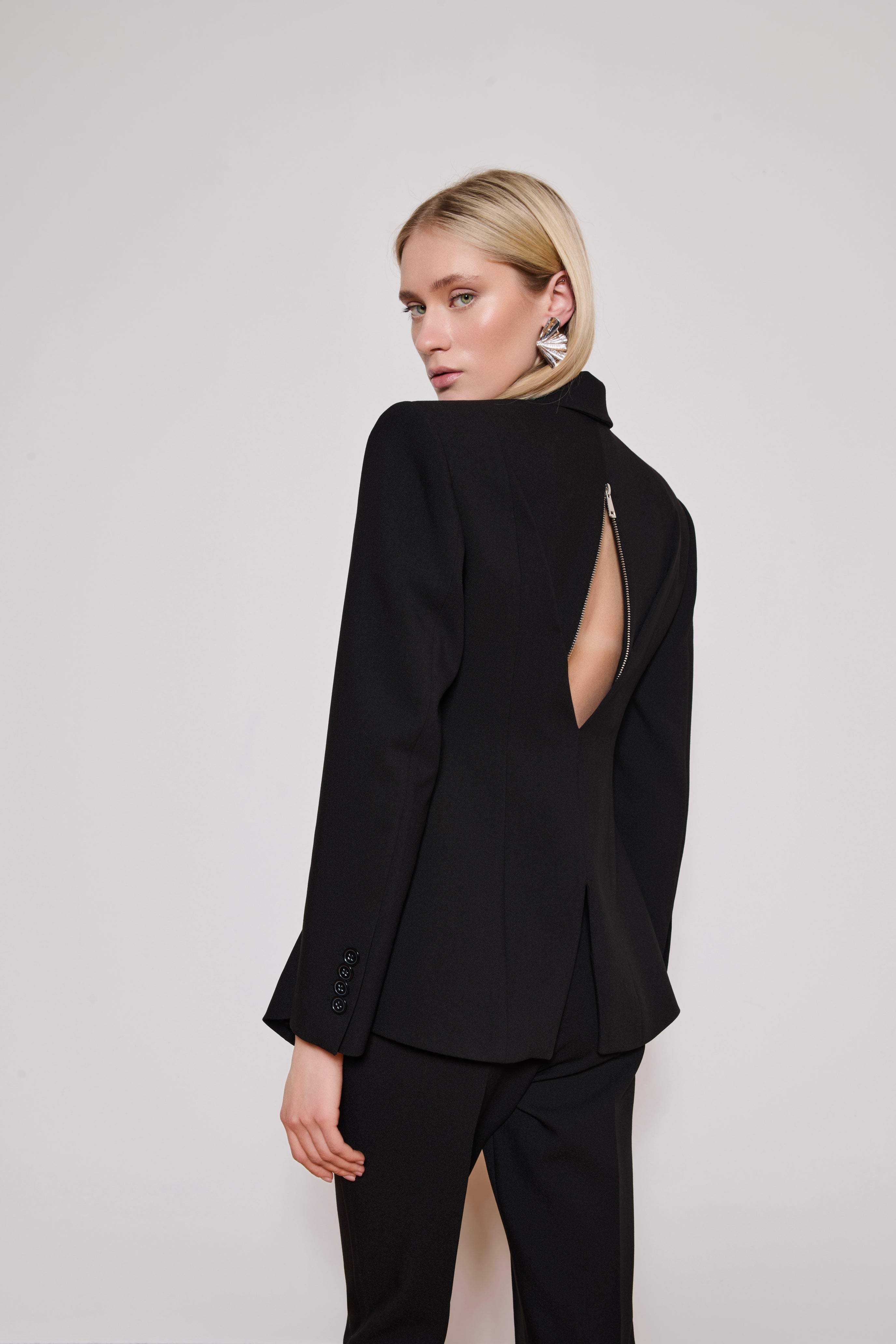 Tailored fit black blazer made with love by the finest tailors with an opening from the back detailed with a zipper giving the illusion of a tie.