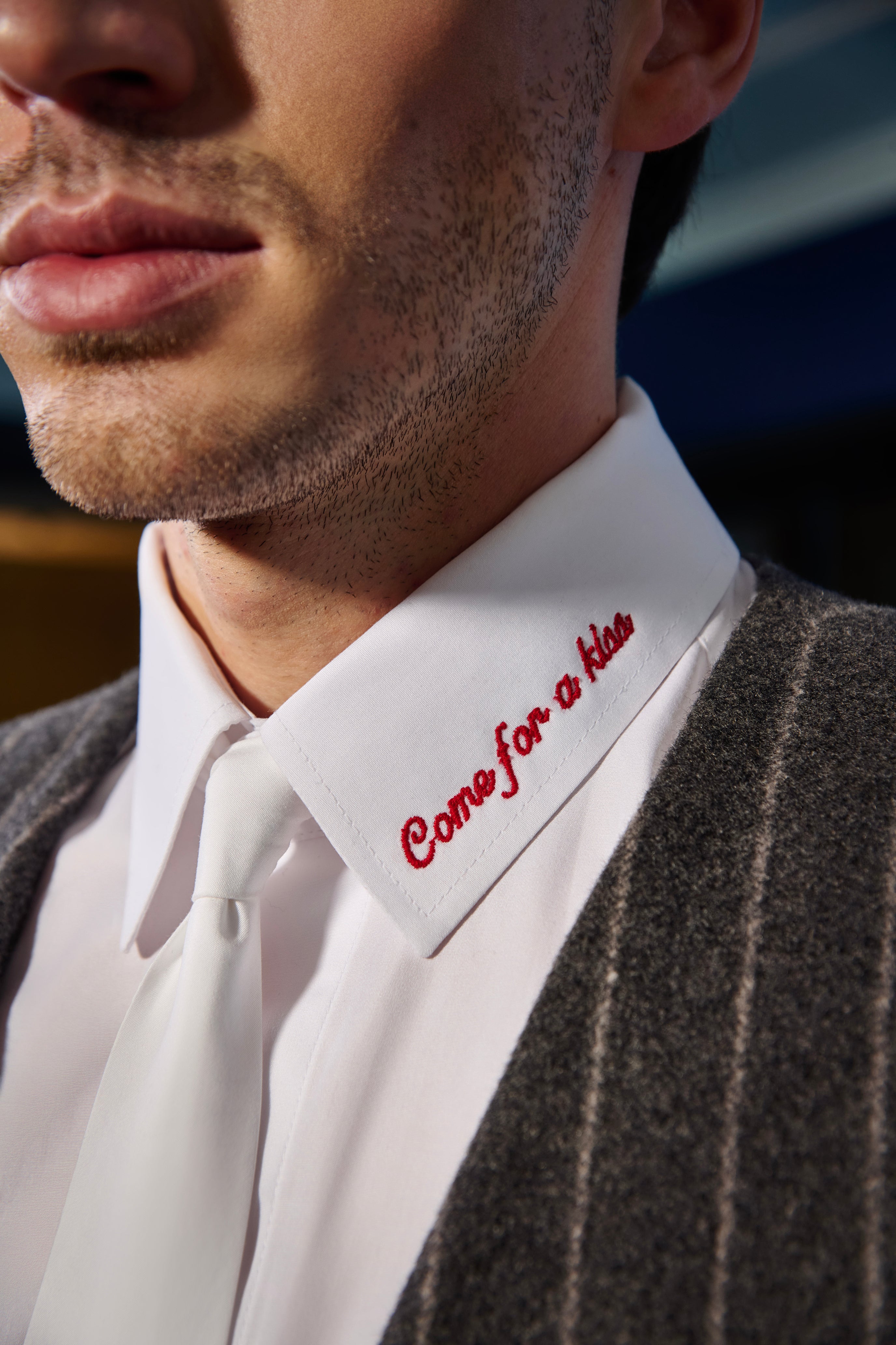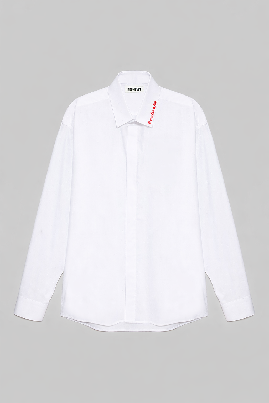 Standard fit white poplin shirt made with 100 % cotton fabric with a collar embedded with a handwritten Red embroidery saying 'Come for a kiss.'