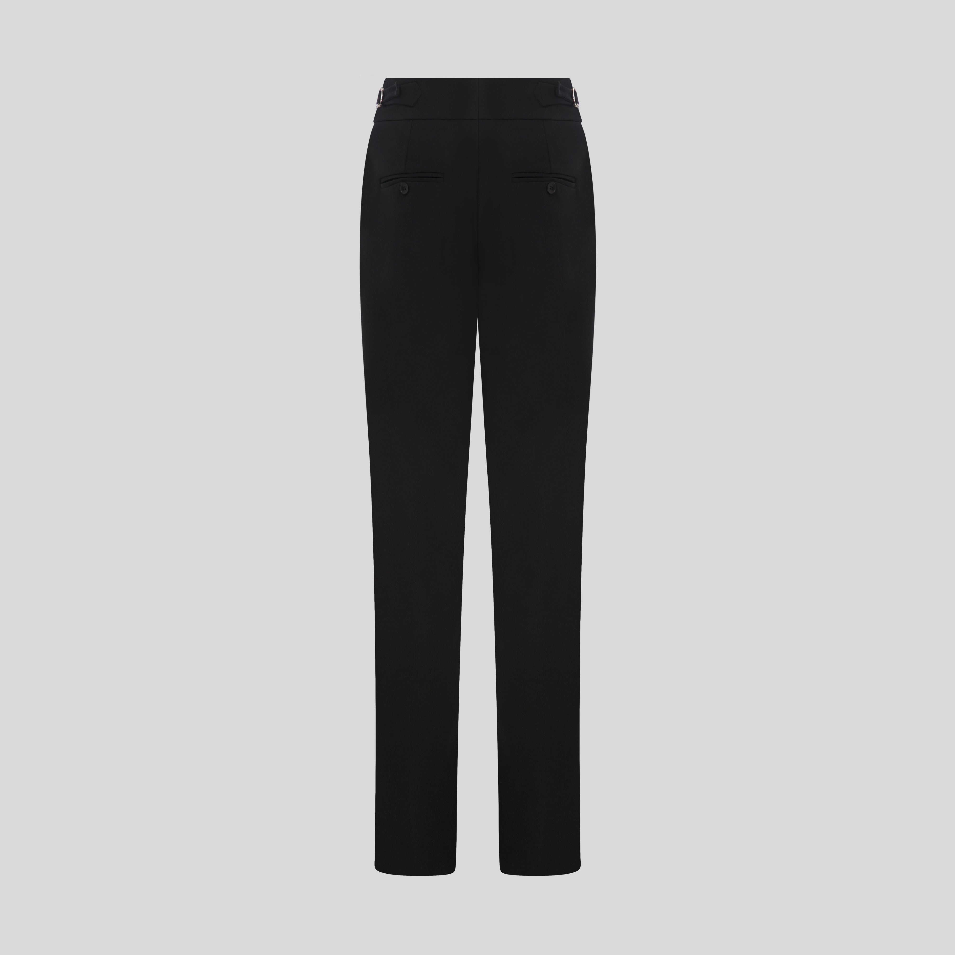 Uniquely cut classic Black pants embellished with a high waist cut and brown real leather pleats.