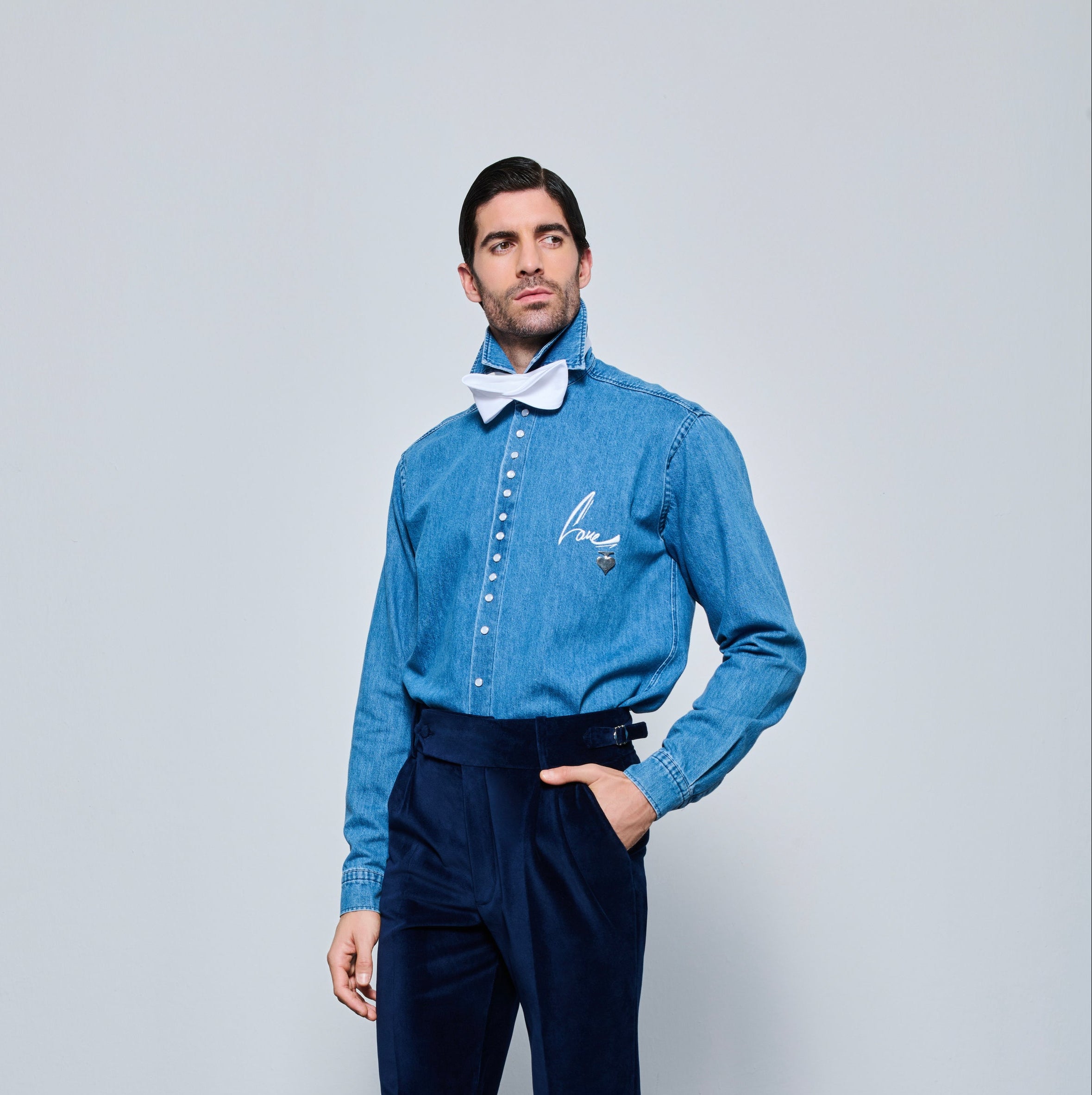 Tailored fit washed denim men shirt with a double collar design and White Love embroidery on the chest with a Kkoncept classic metallic spade.