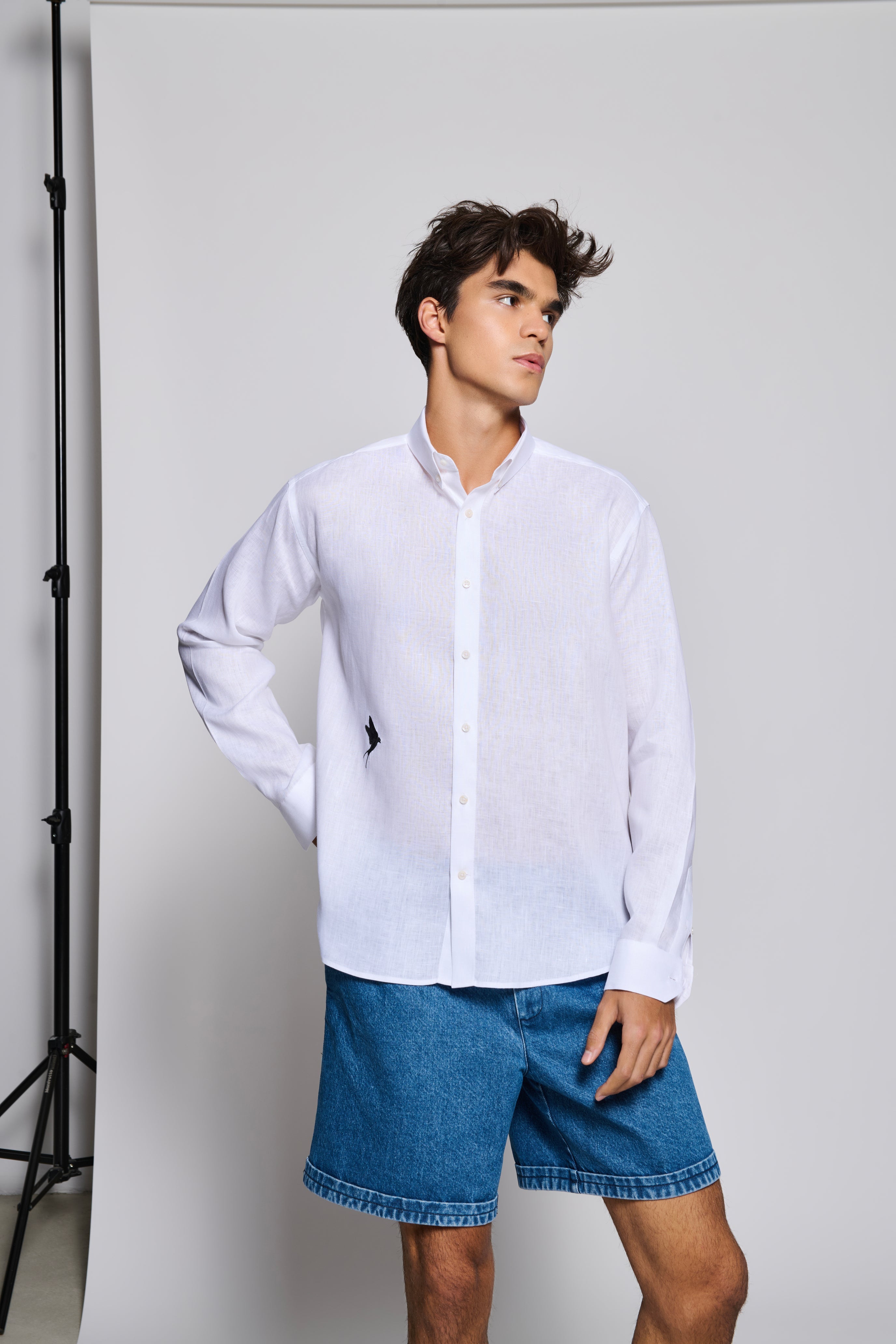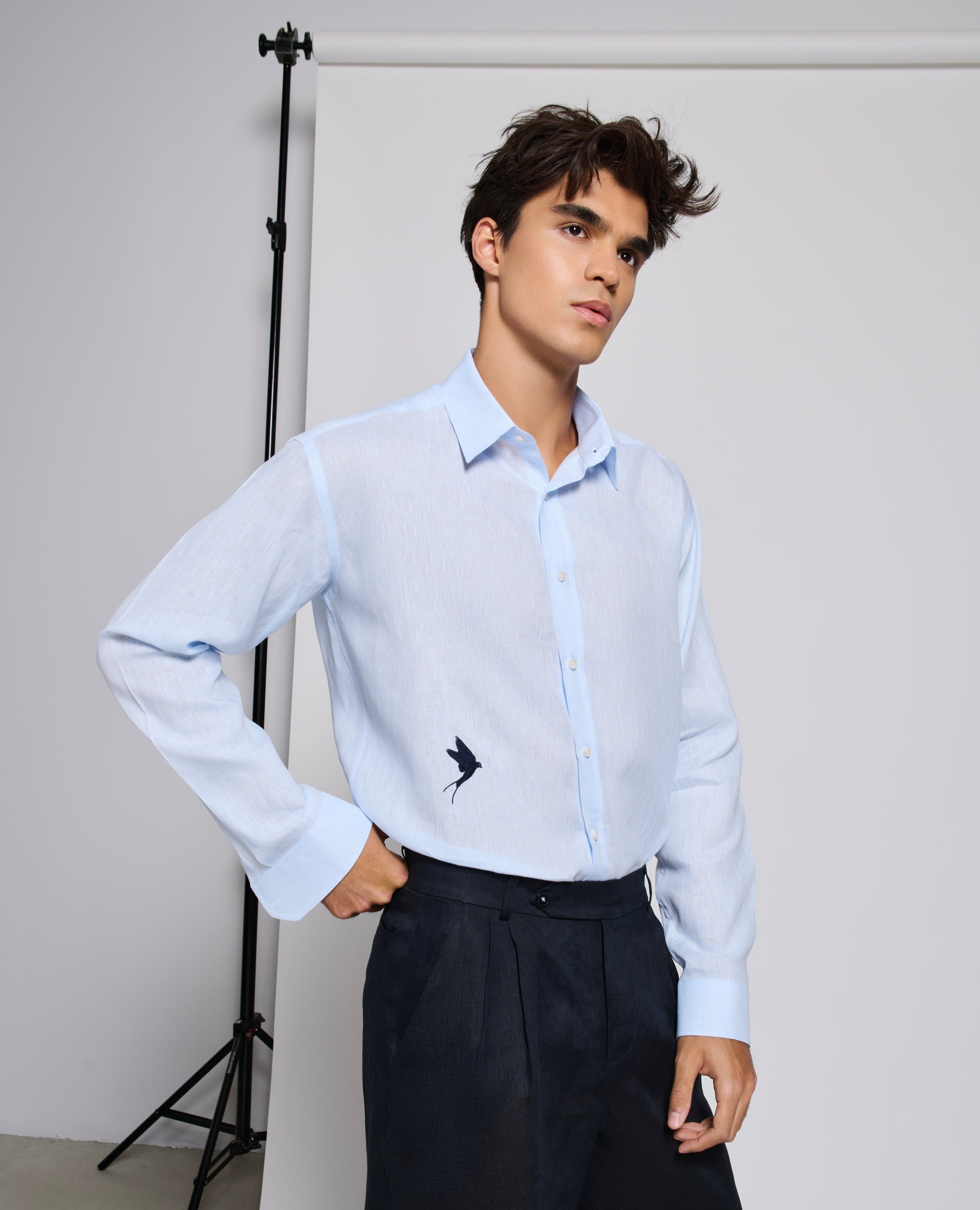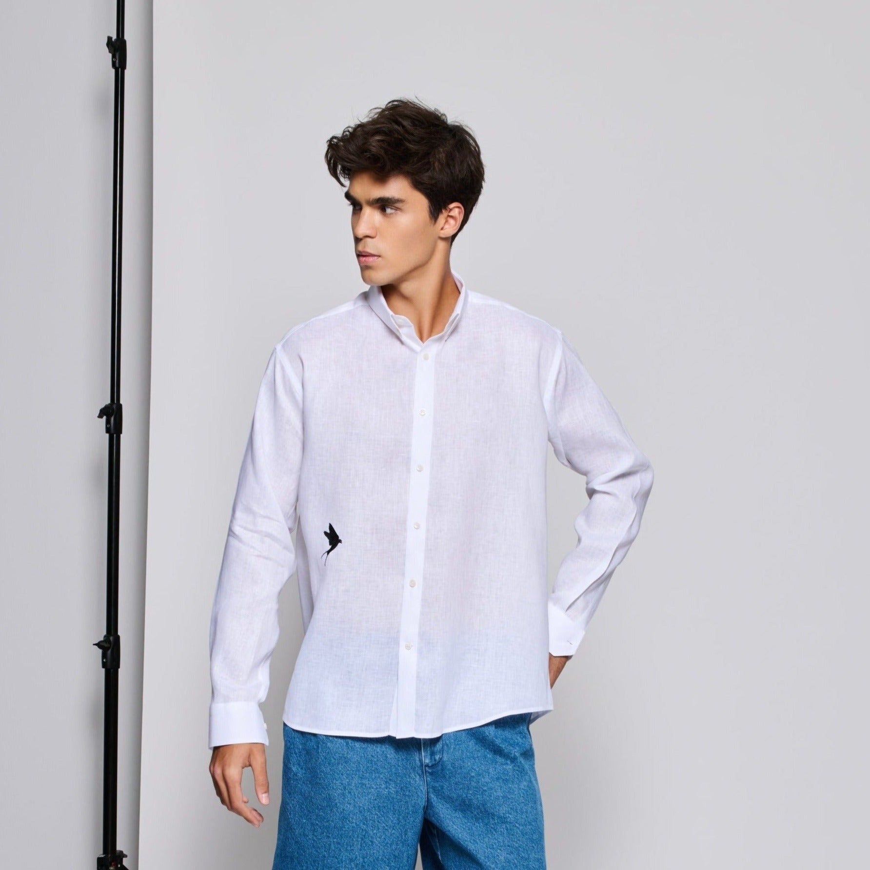 Tailored fit White 100% fine Linen men shirt with a Black bird embroidery on the bottom.