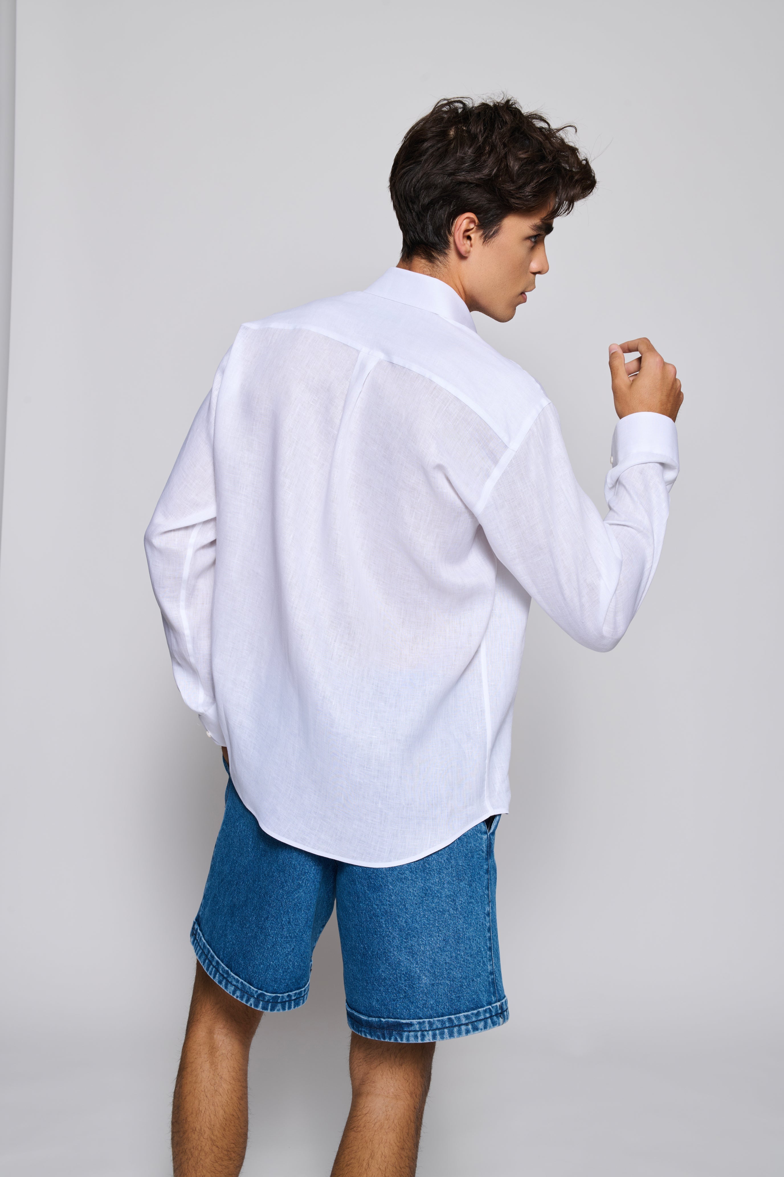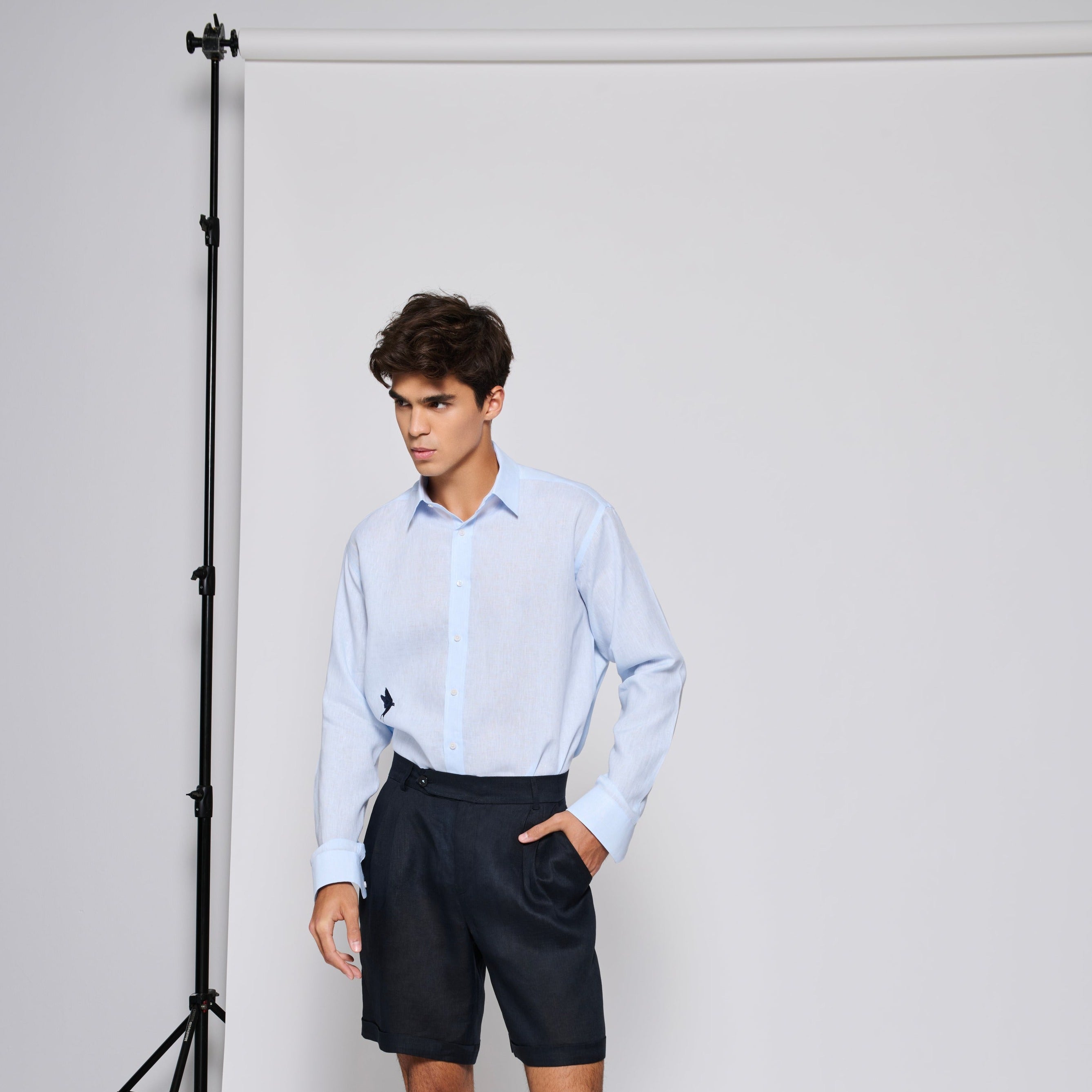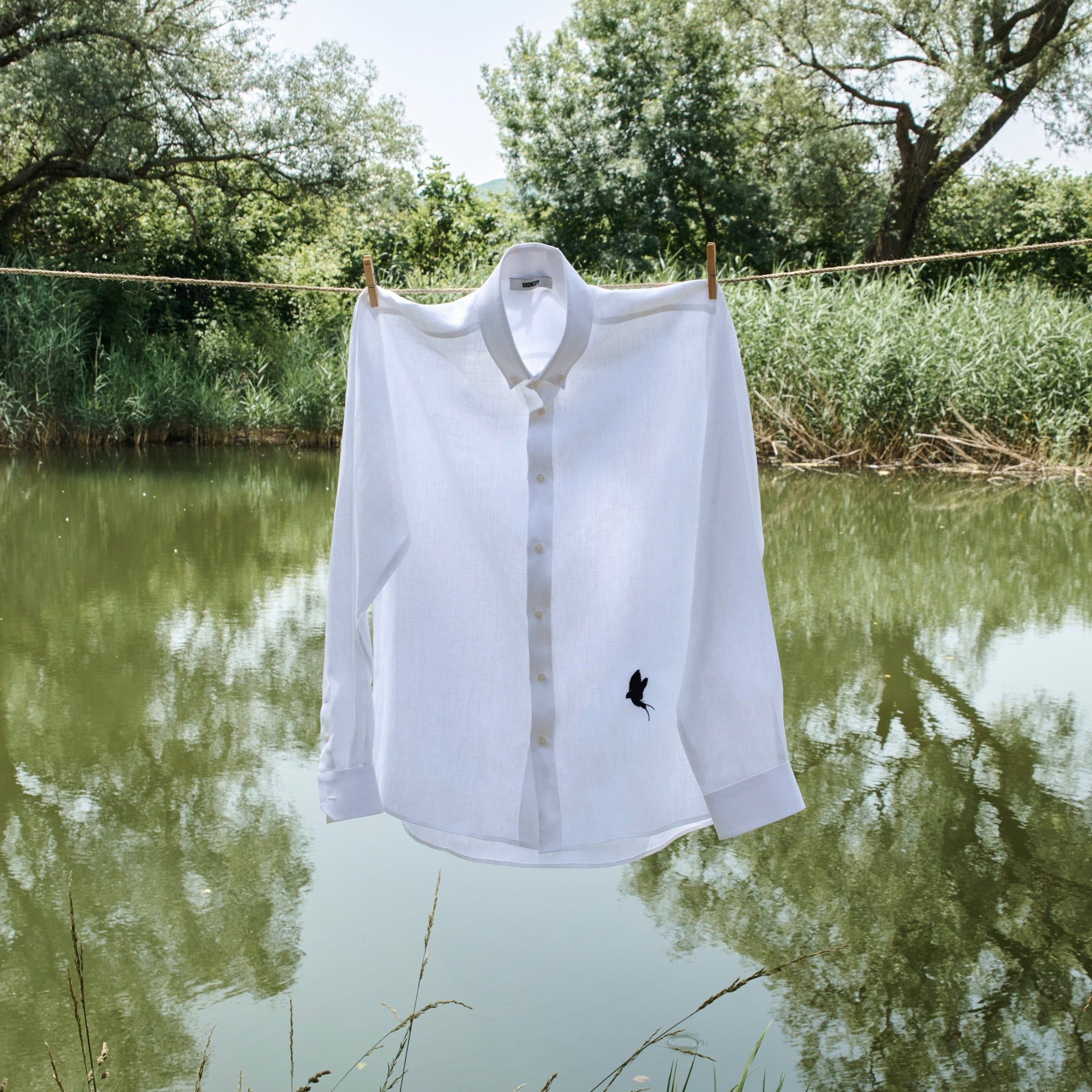 Tailored fit White 100% fine Linen men shirt with a Black bird embroidery on the bottom.