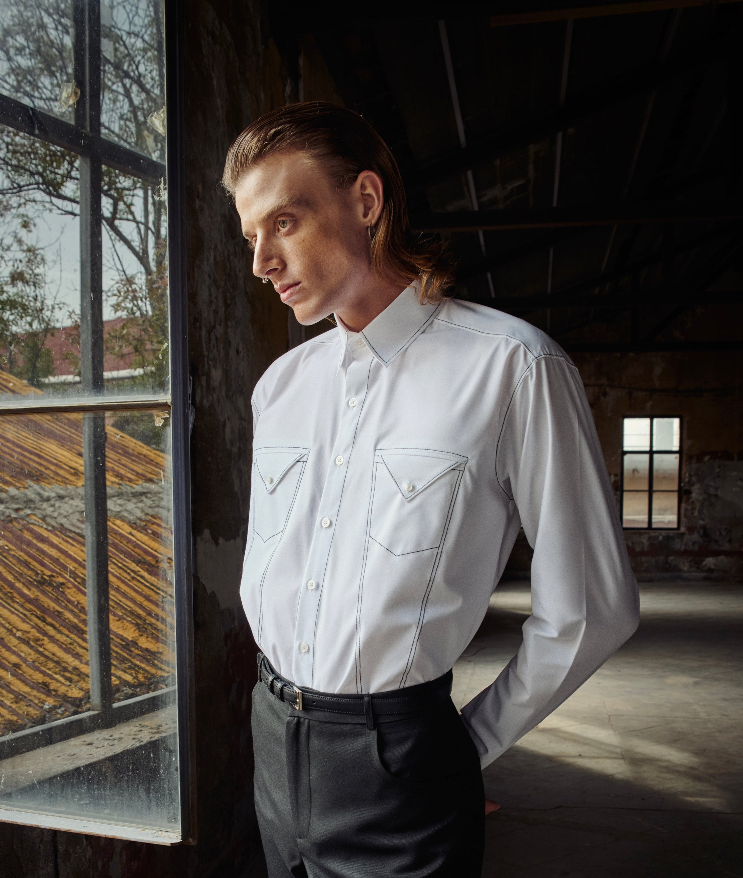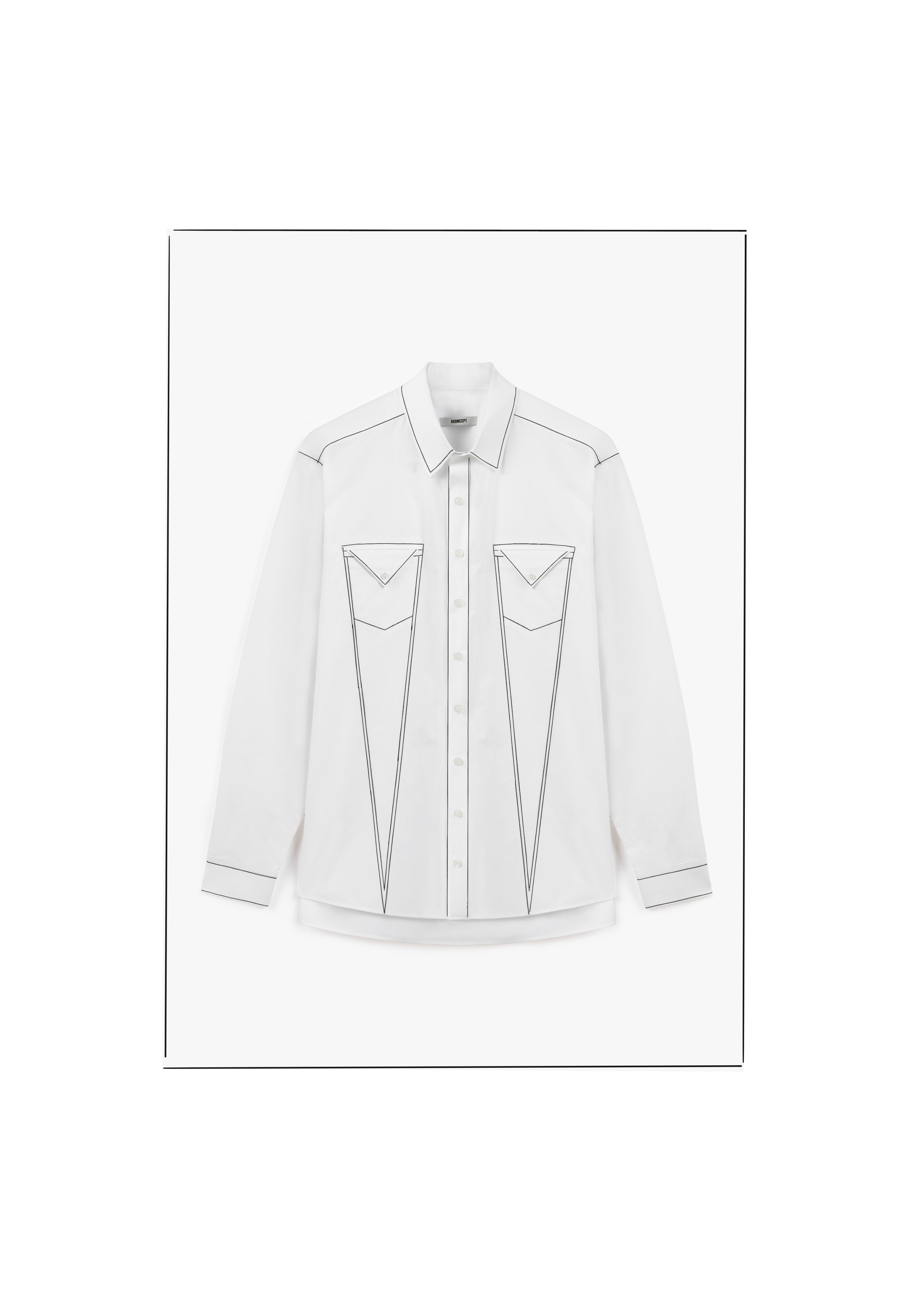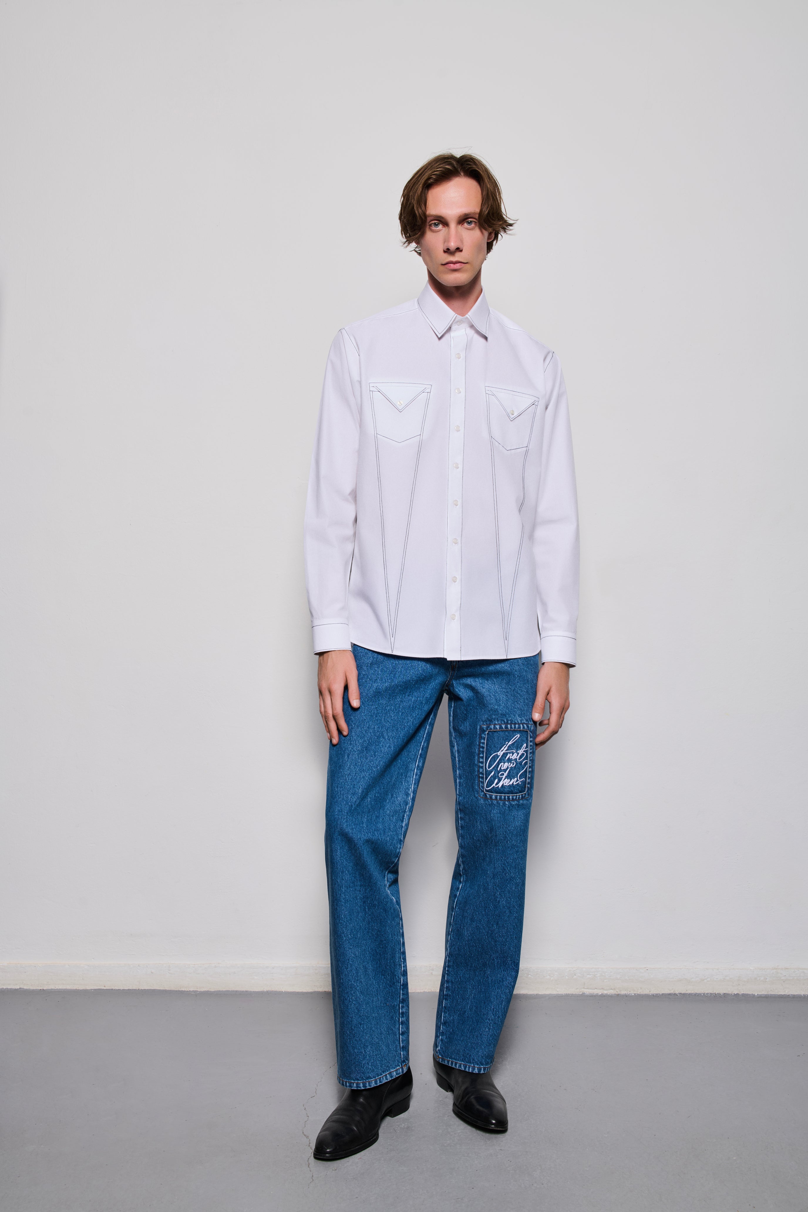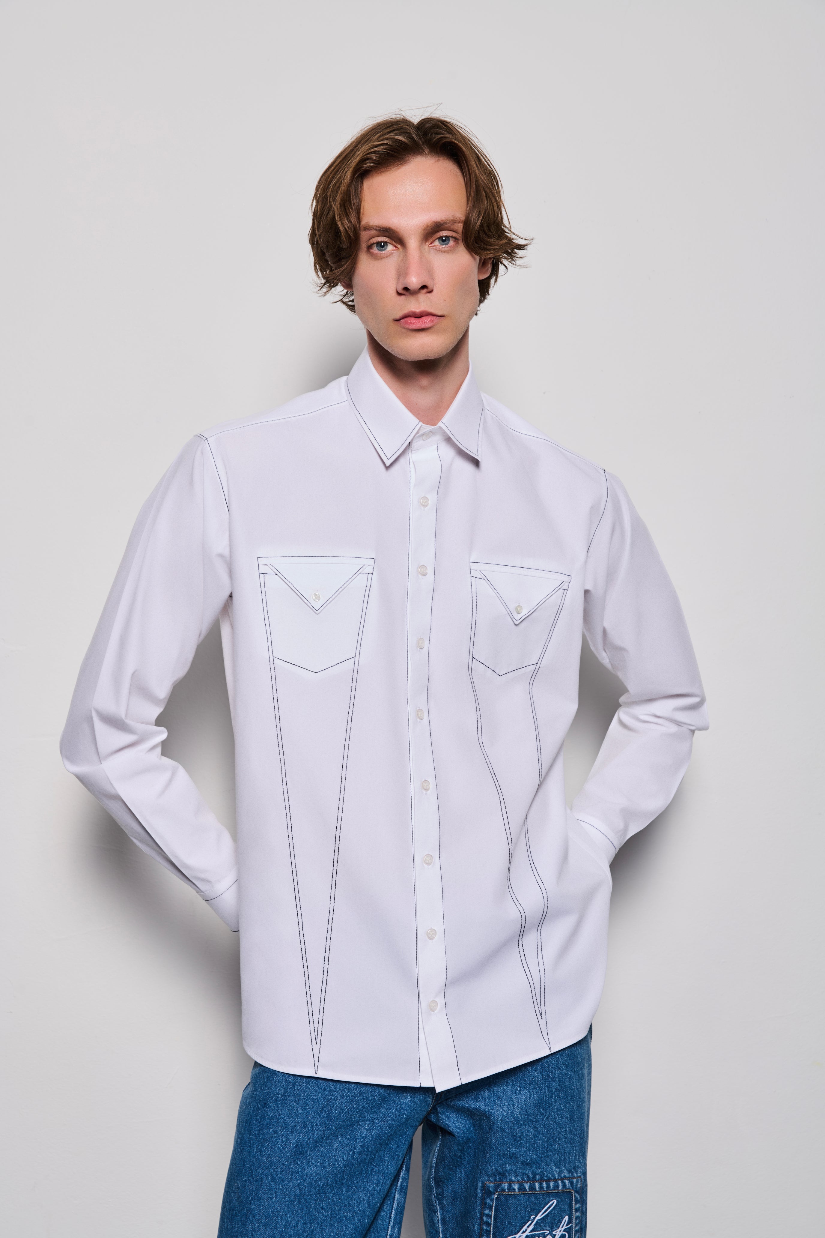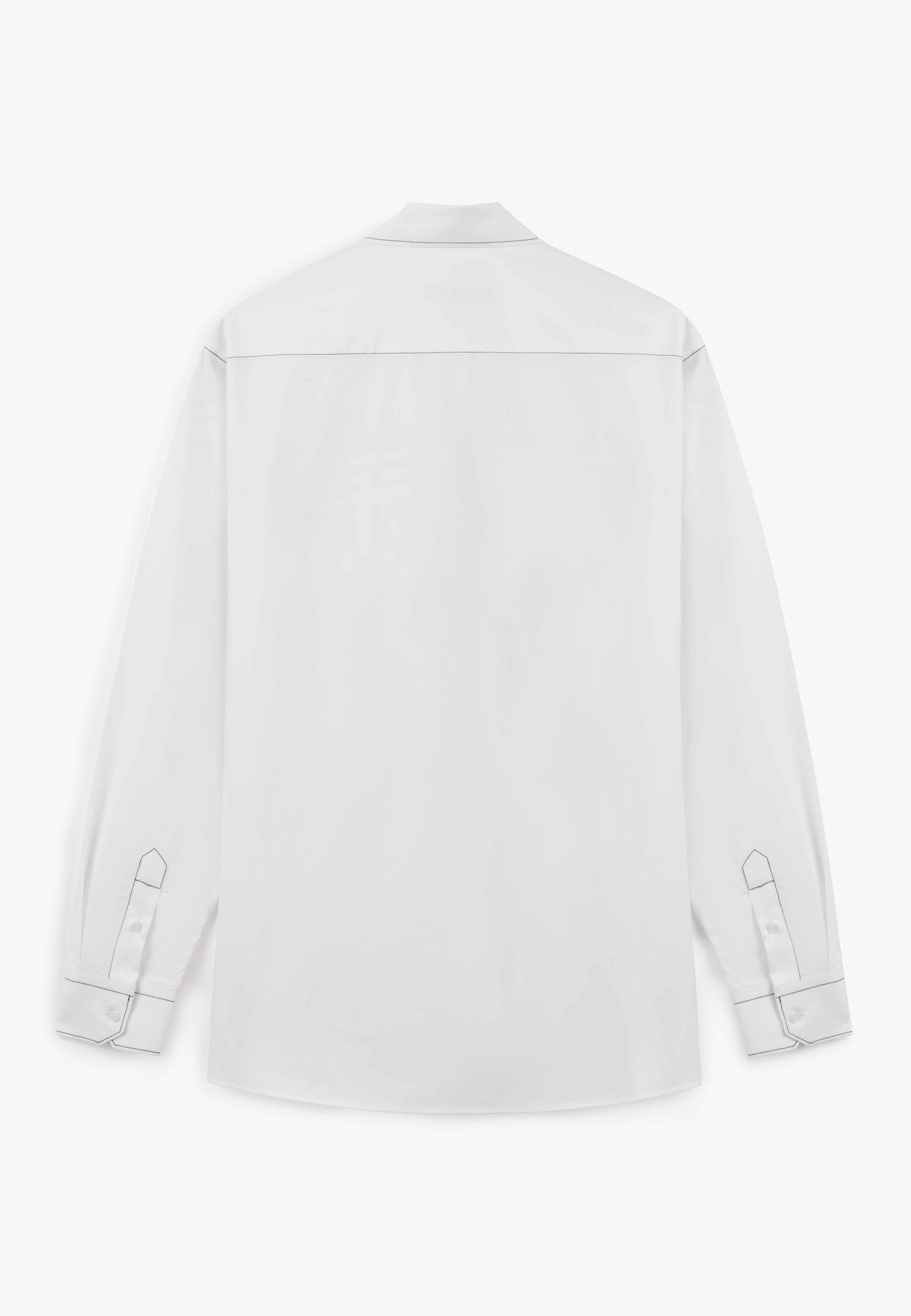 Tailored fit white Poplin men shirt with black thread sewn design.
