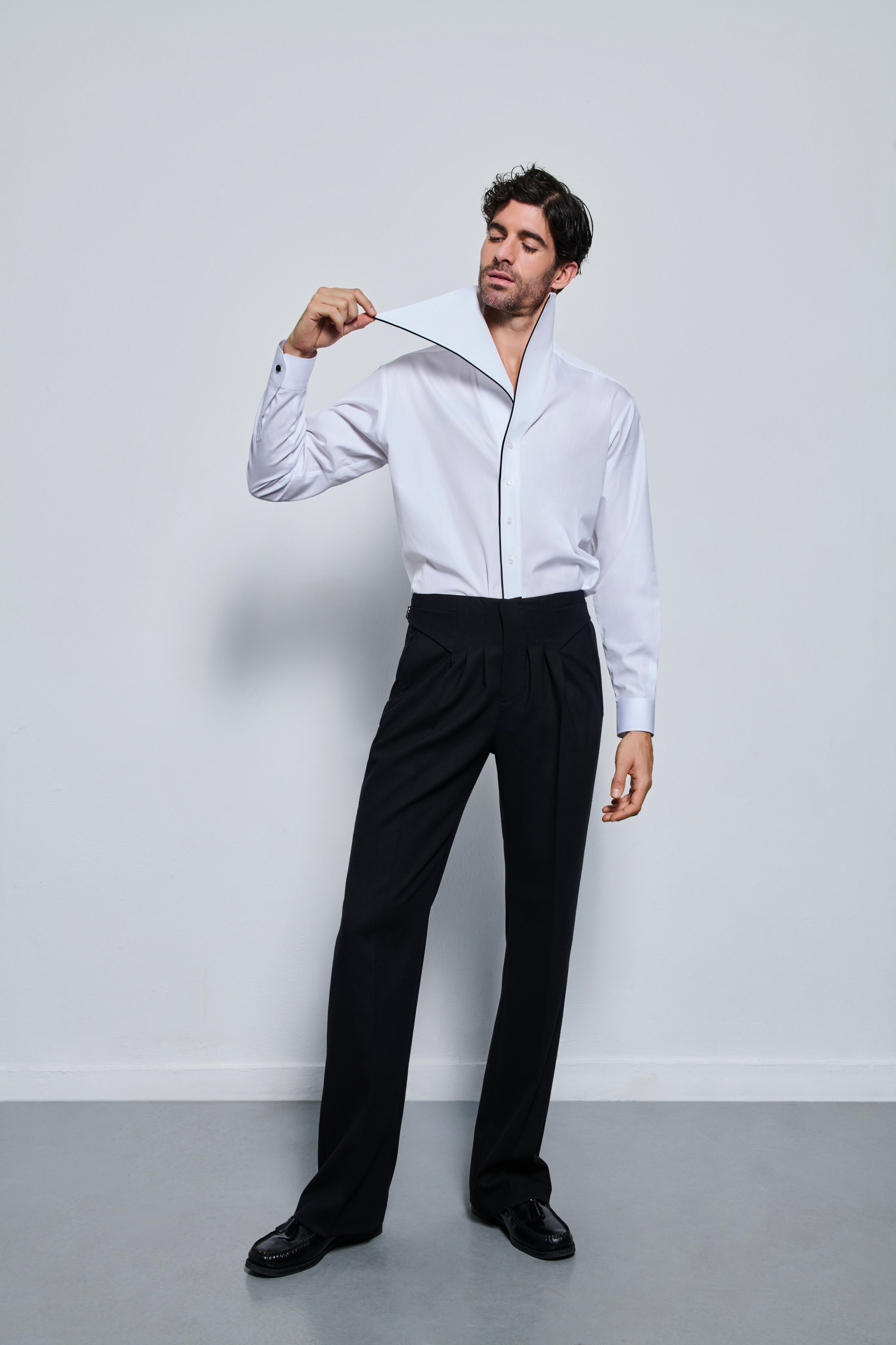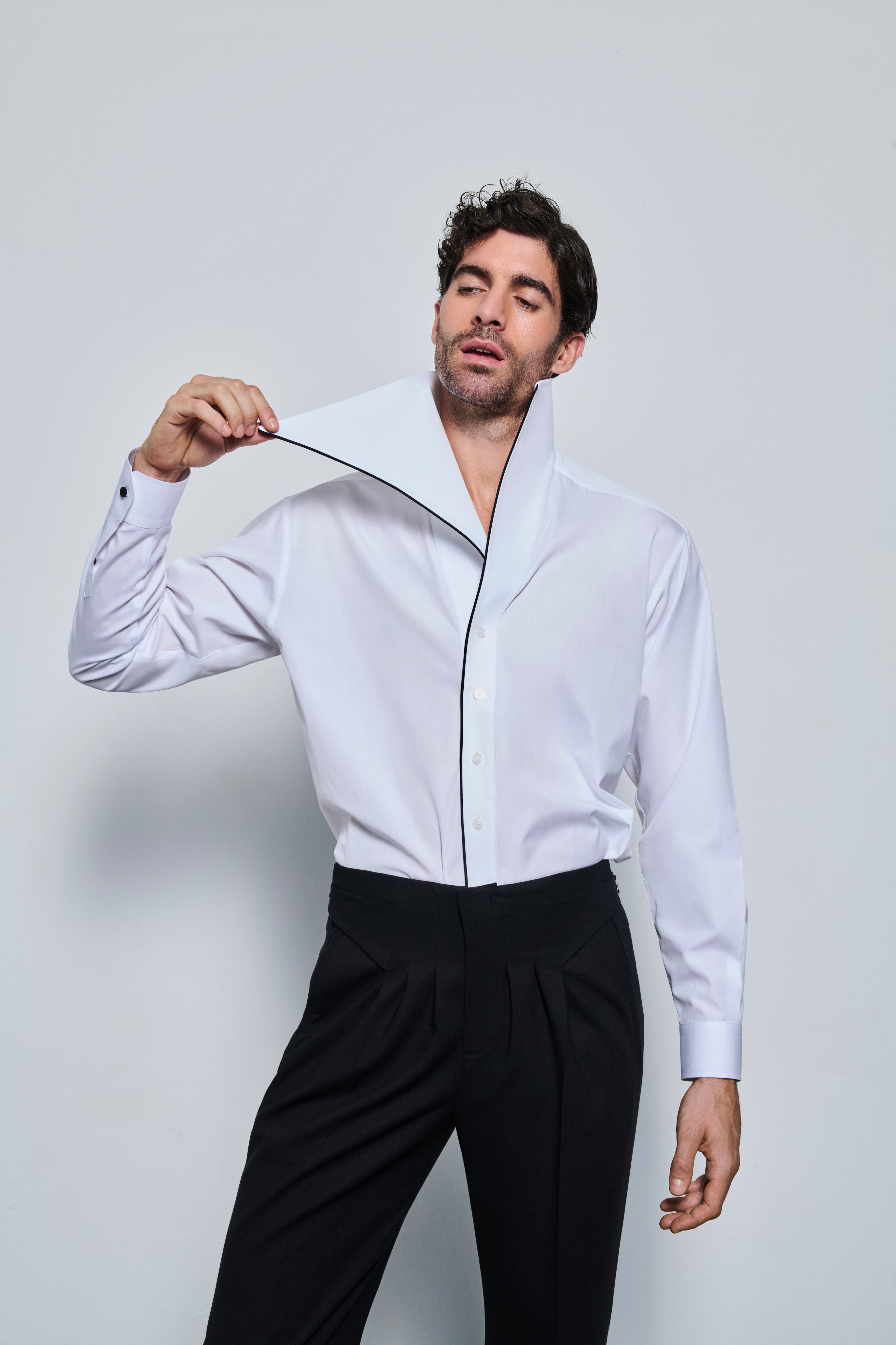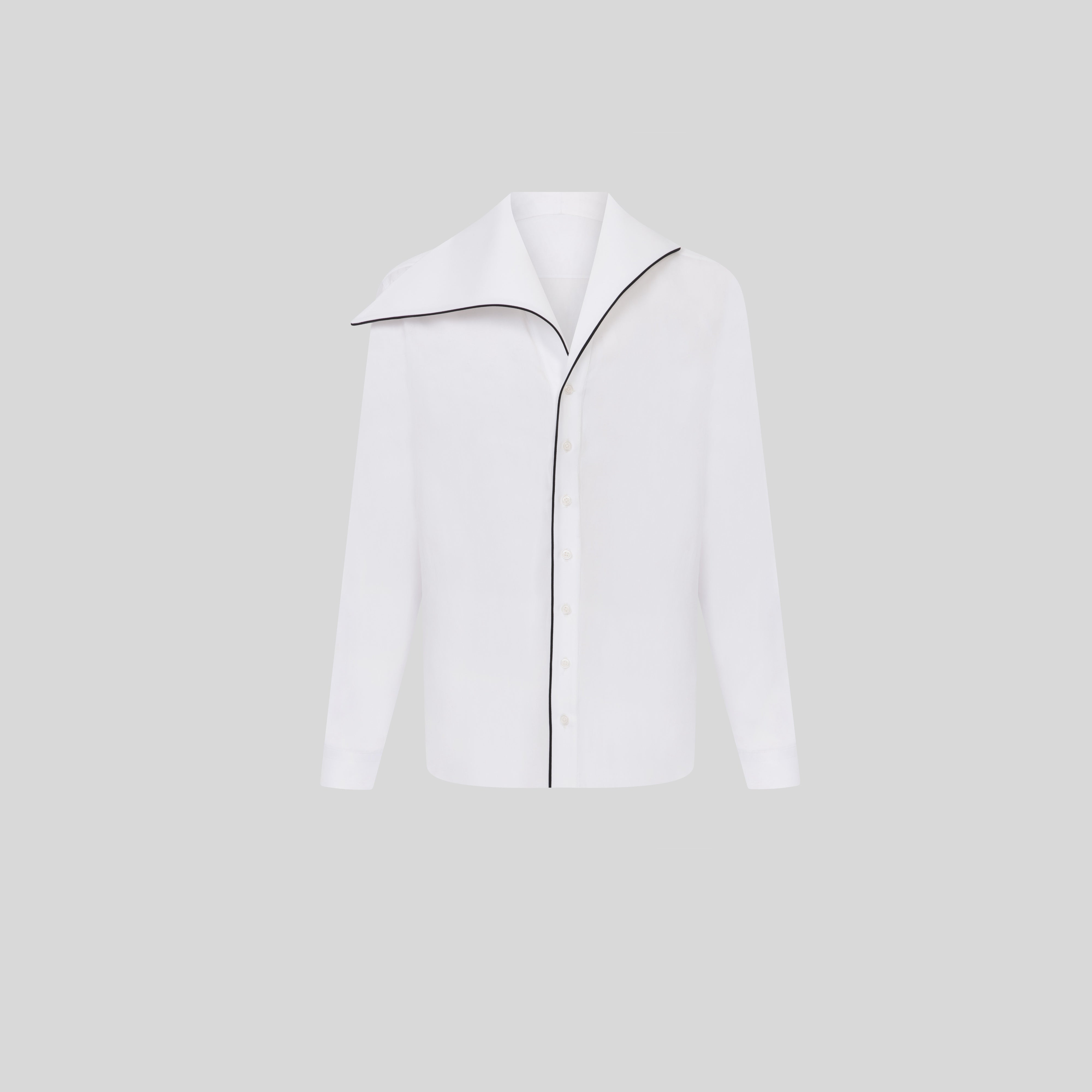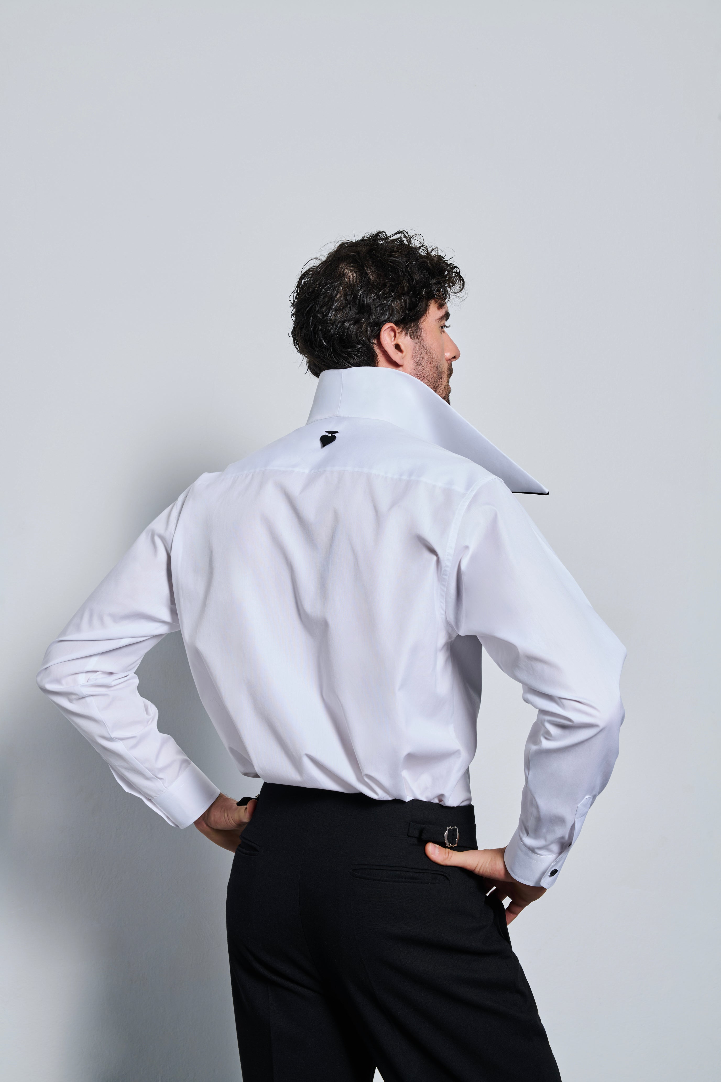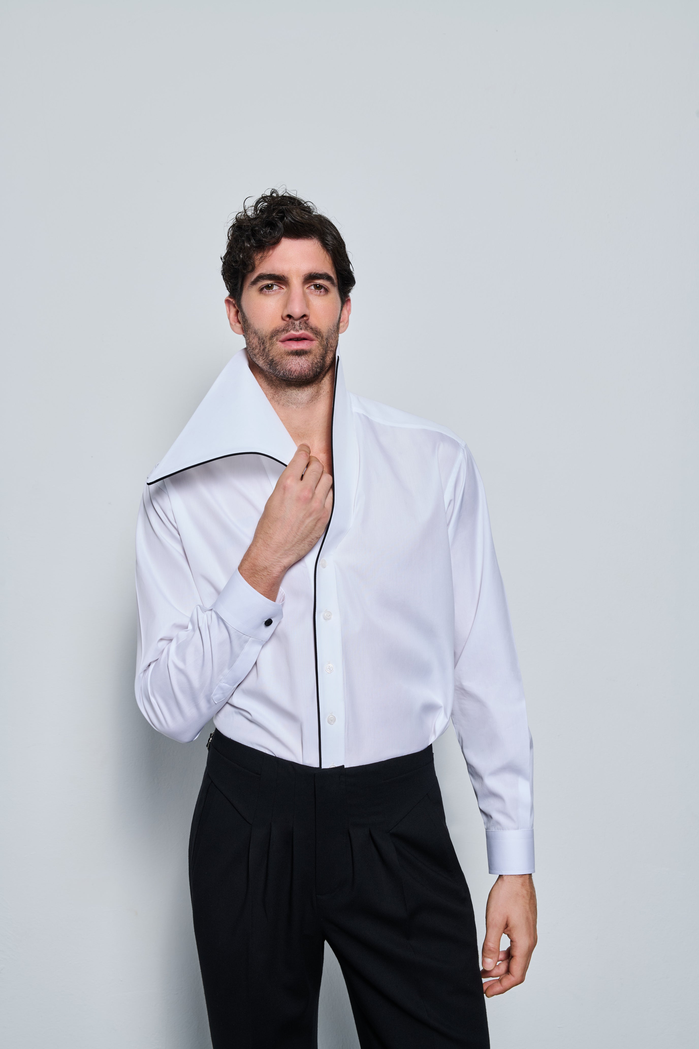 Standard fit white poplin shirt made with 100 % cotton fabric with a one sided long collar details.