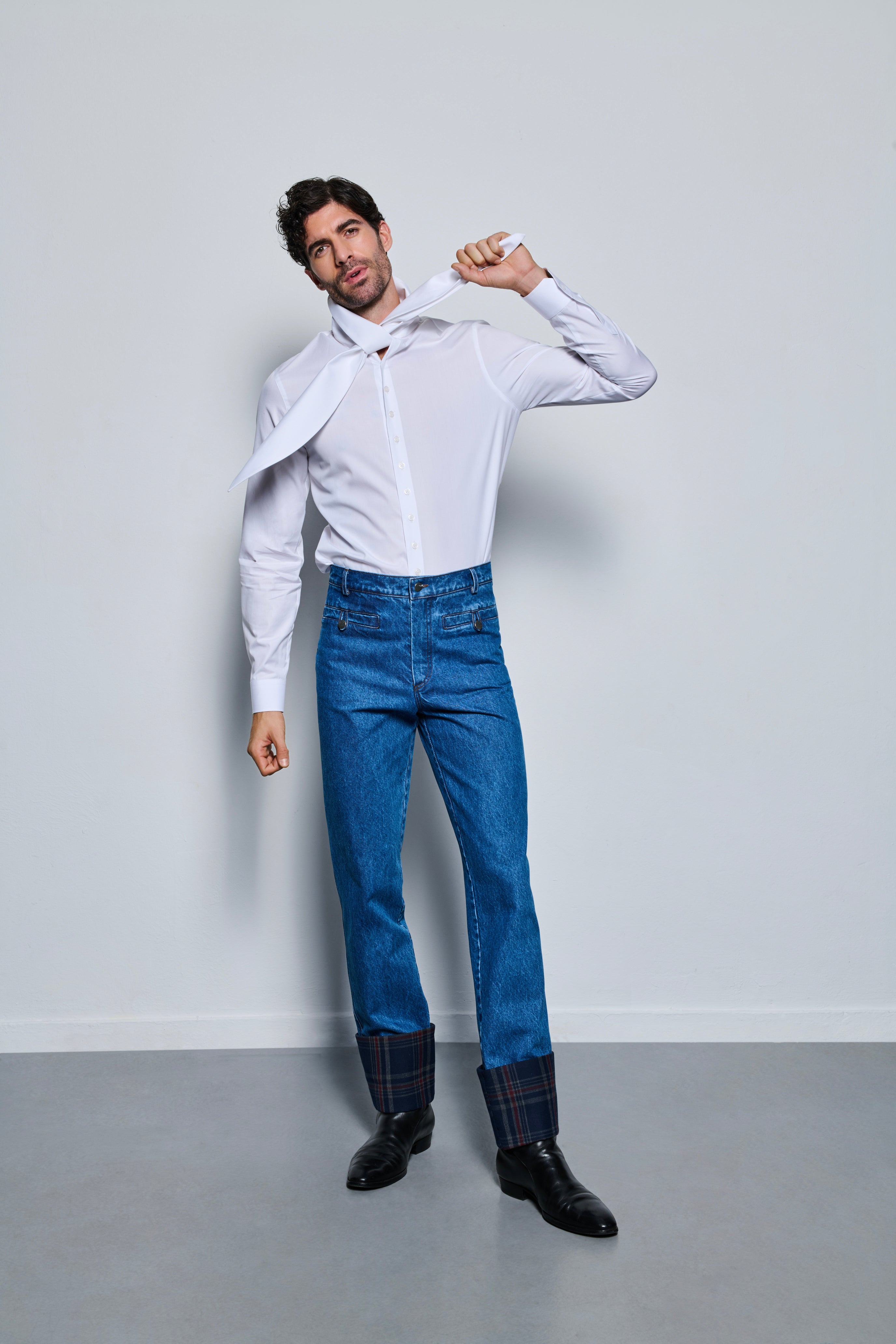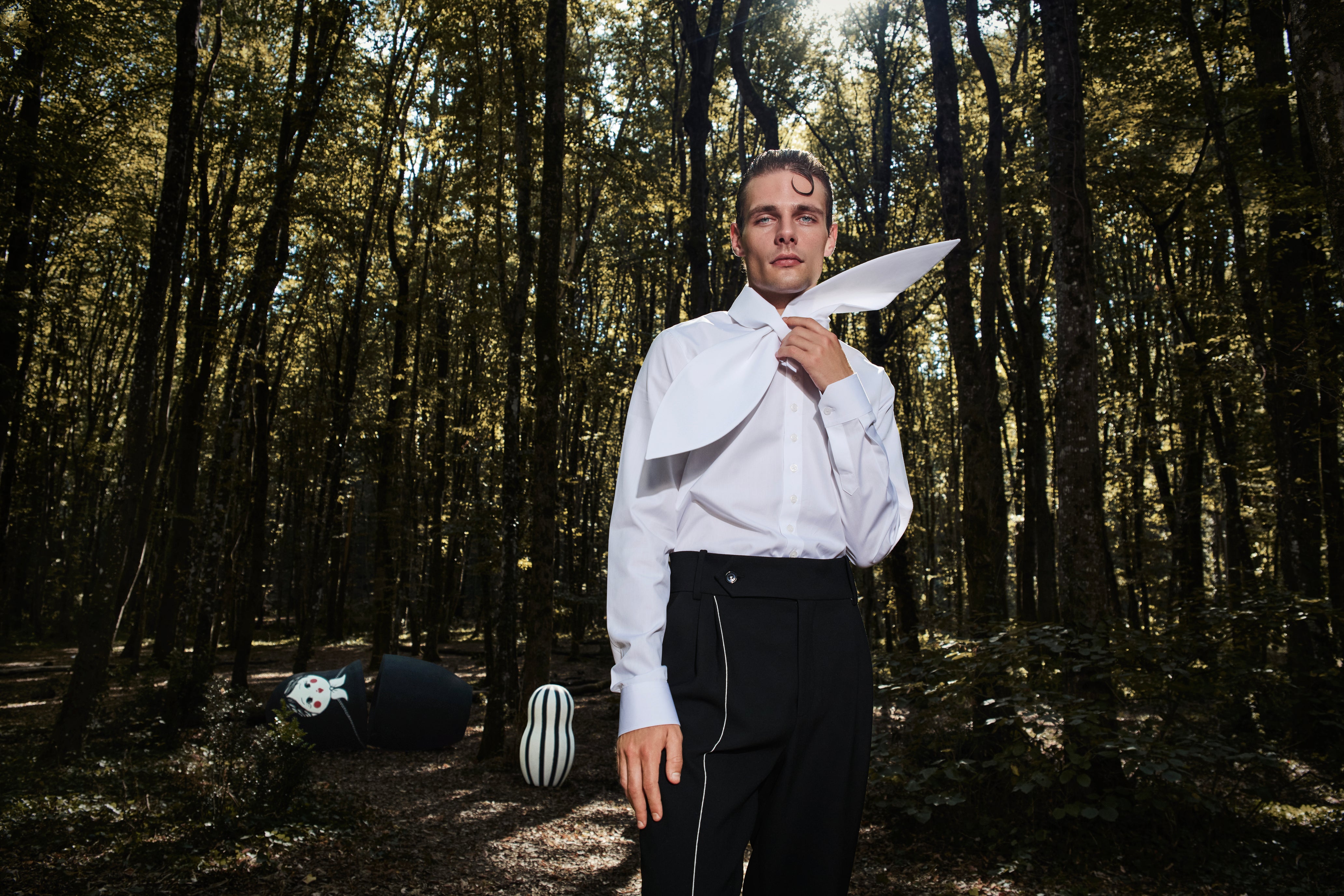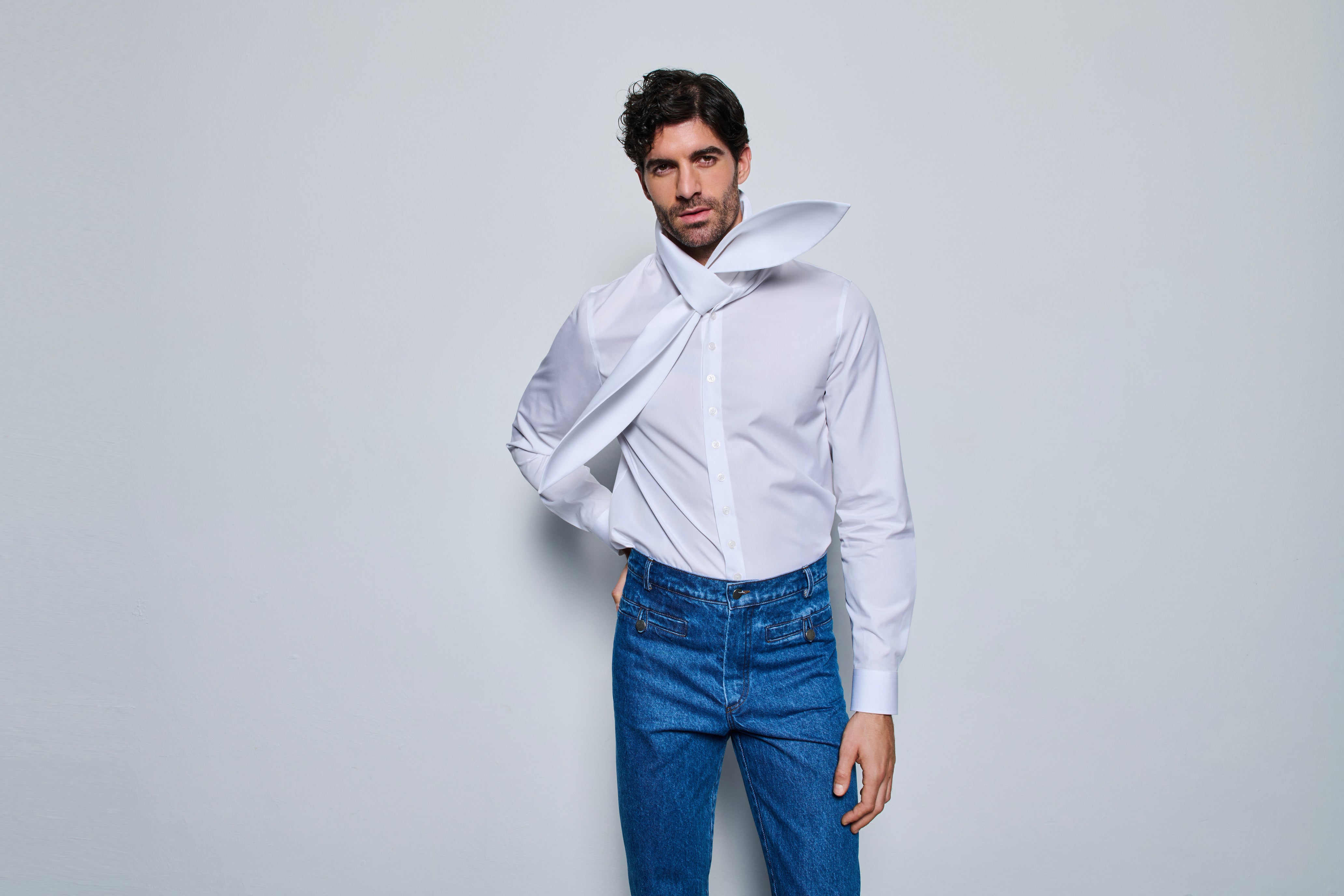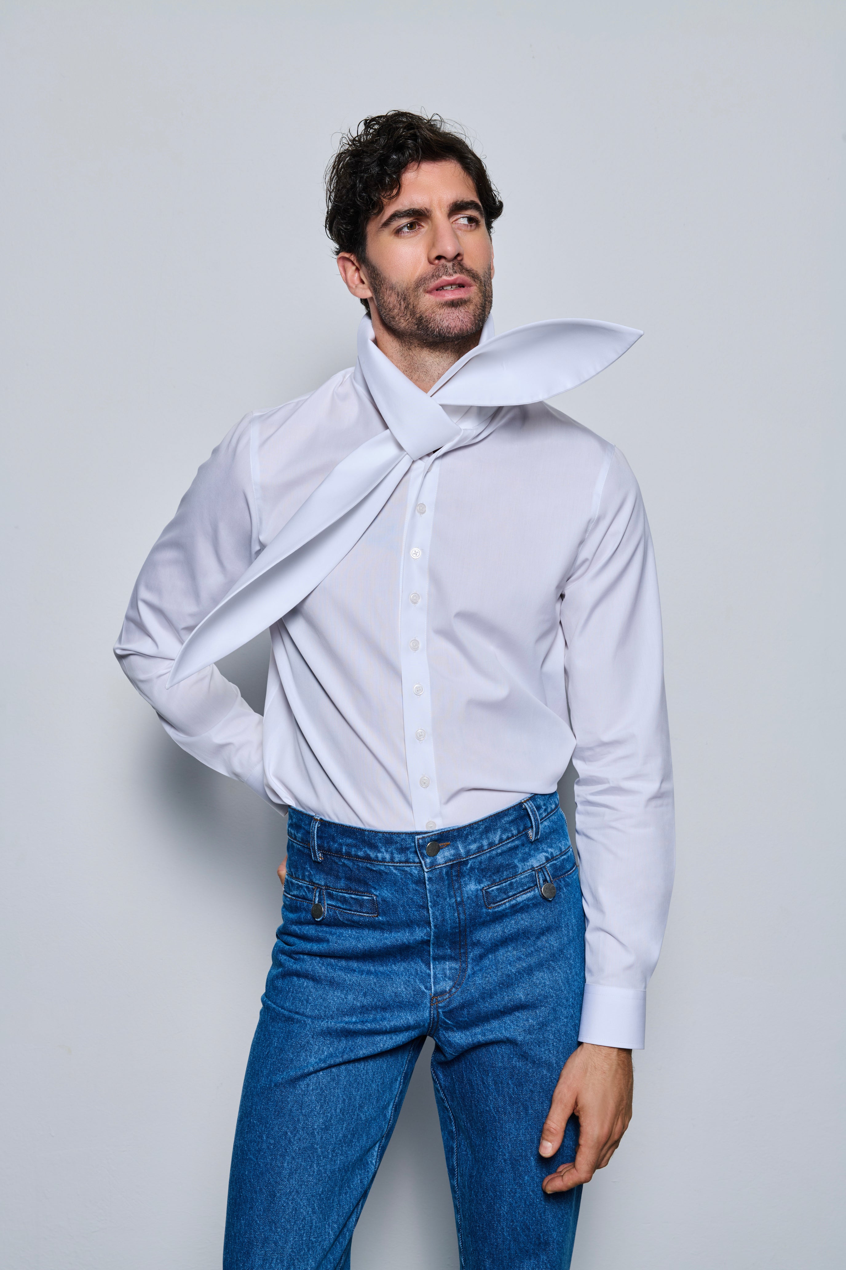 Standard fit white poplin shirt made with 100 % cotton fabric with an elongated fabric nod.