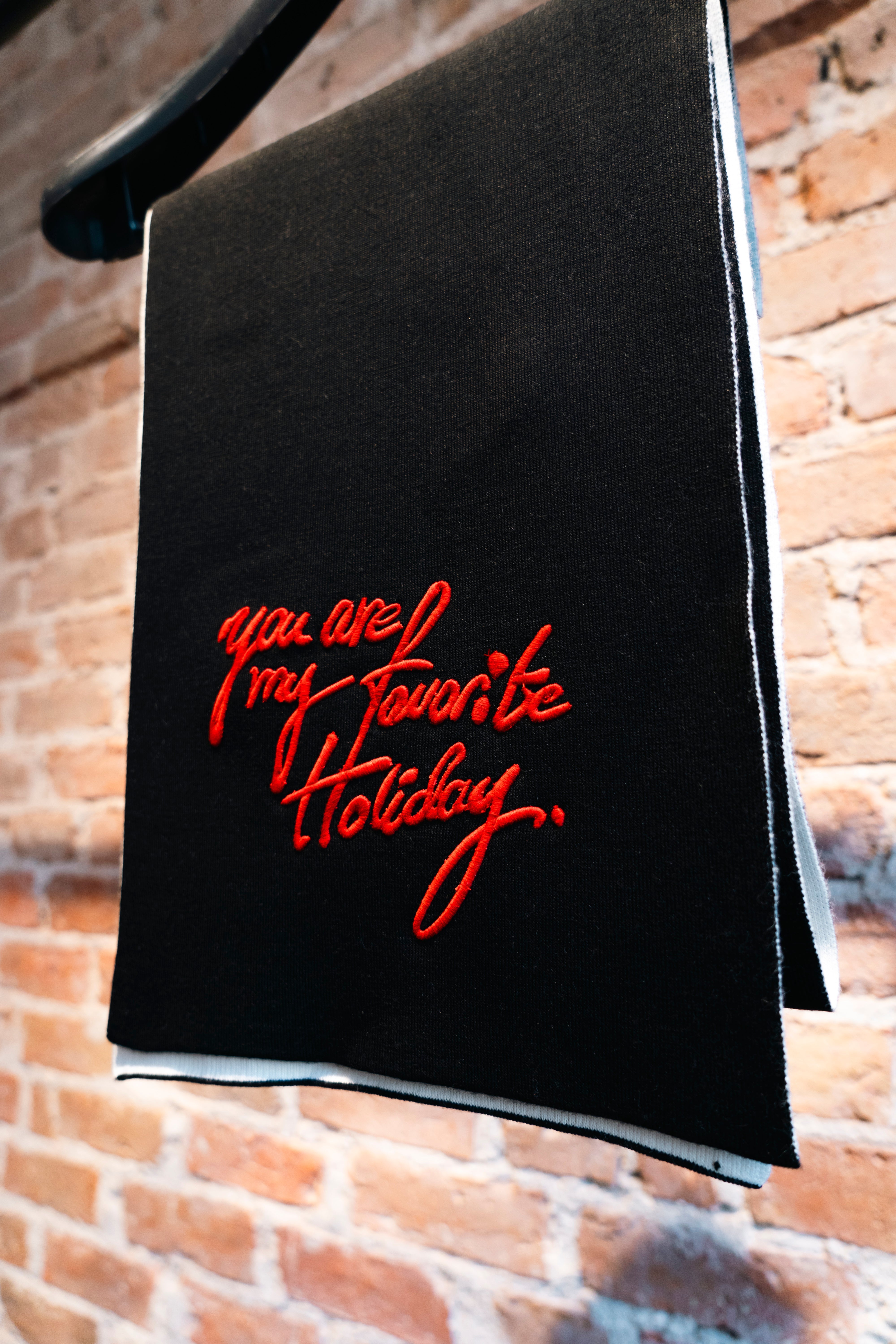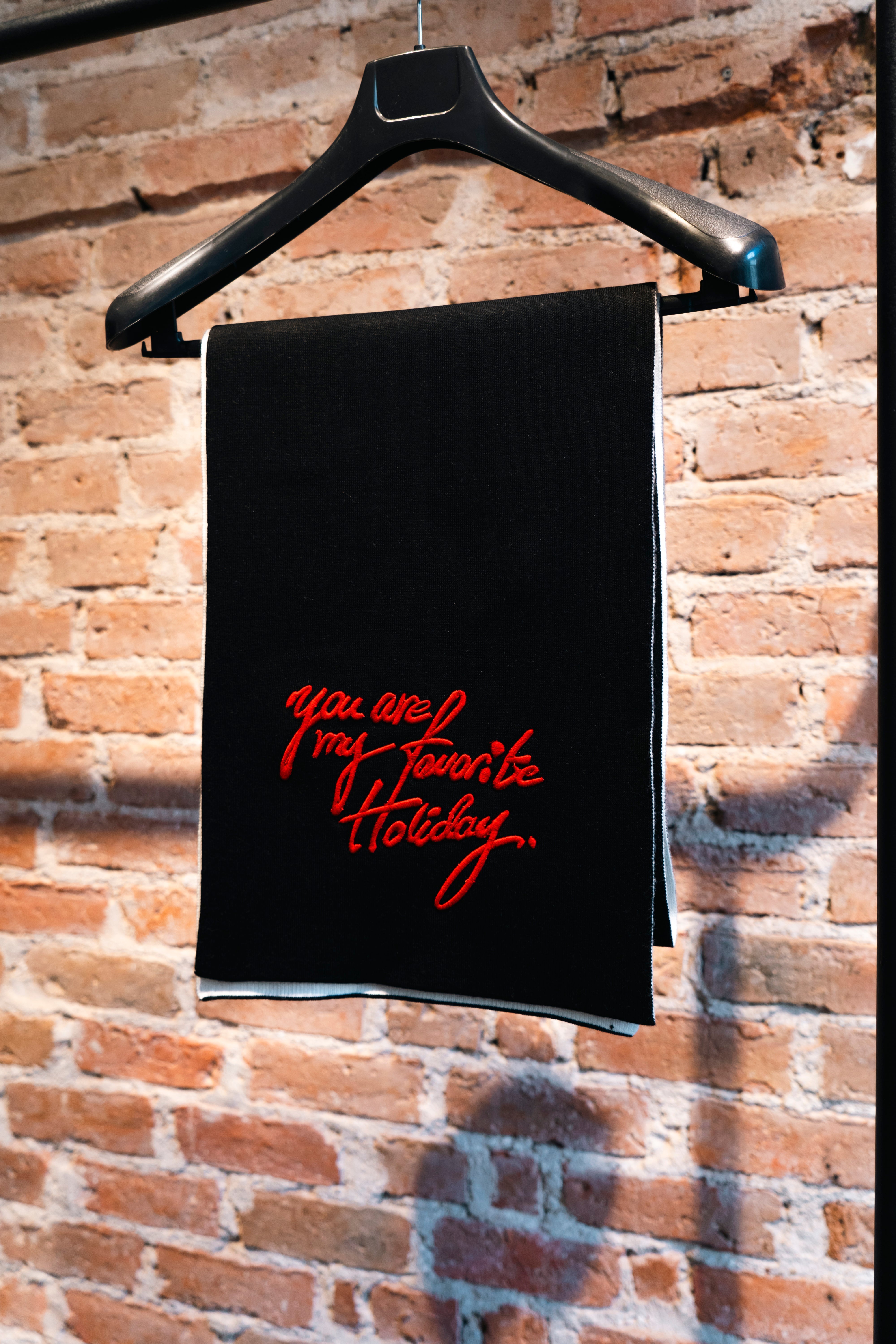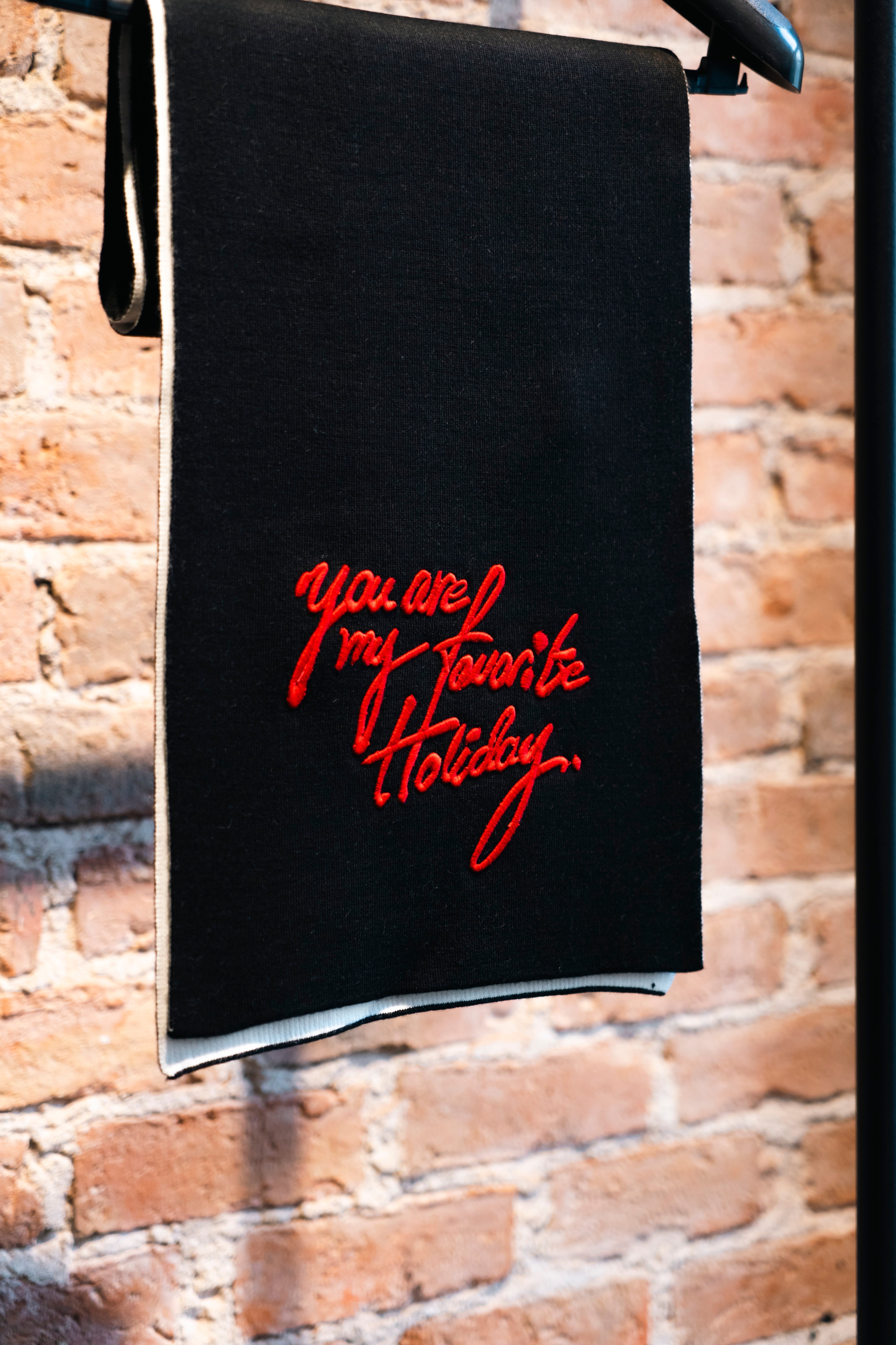 Fine knit Black & White scarf in a wool blend with a vibrant Red embroidery writing "You are my favorite holiday."
