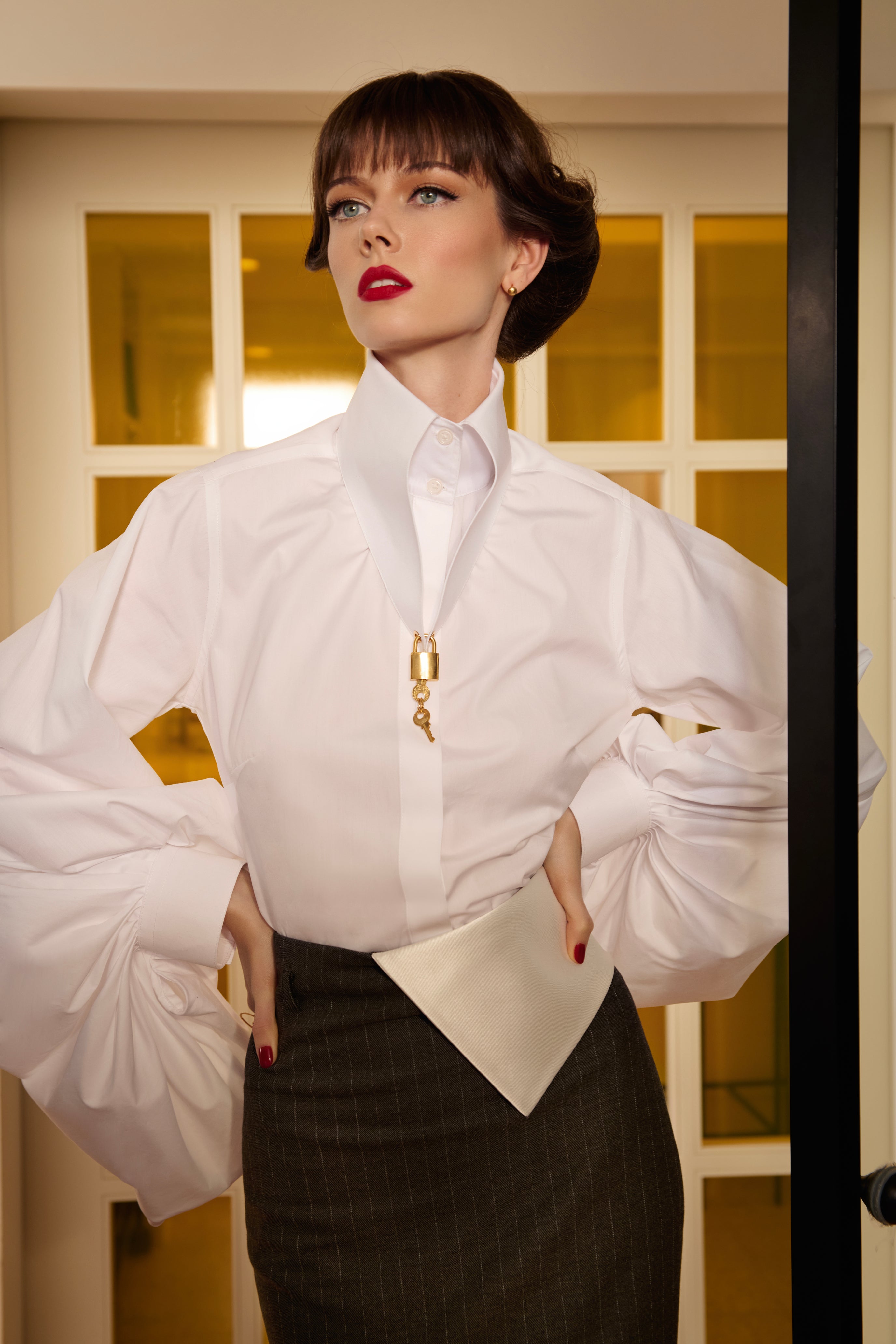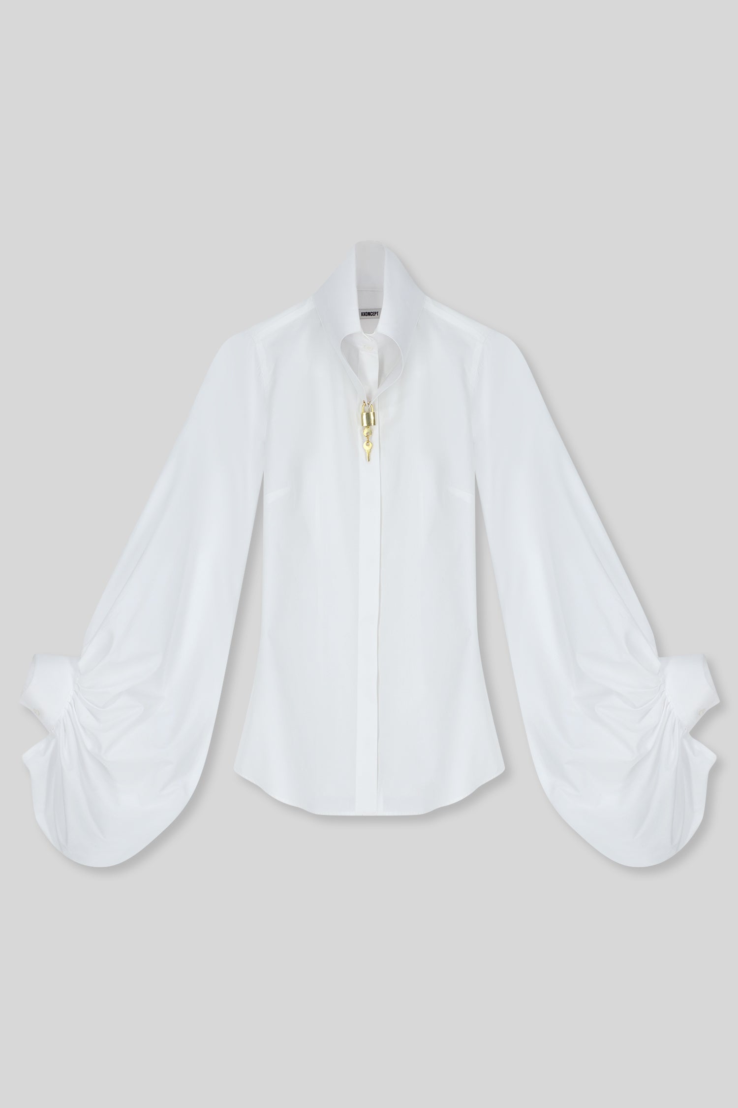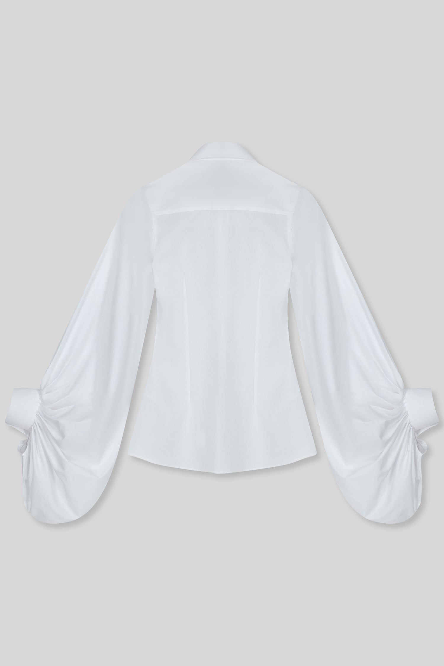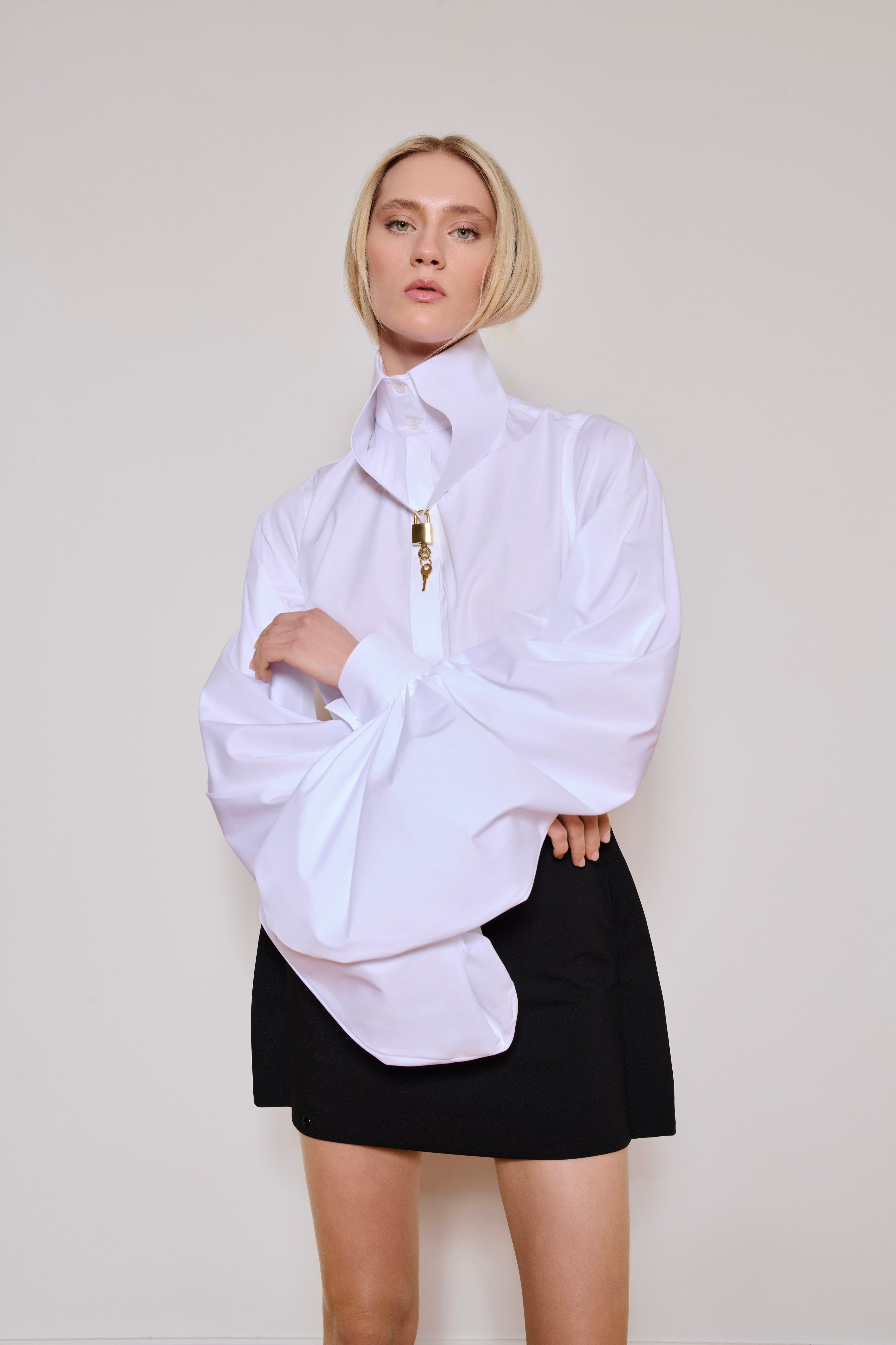 100% Cotton white Poplin shirt detailed with oversized Avant-Garde with pleated cuff sleeves.