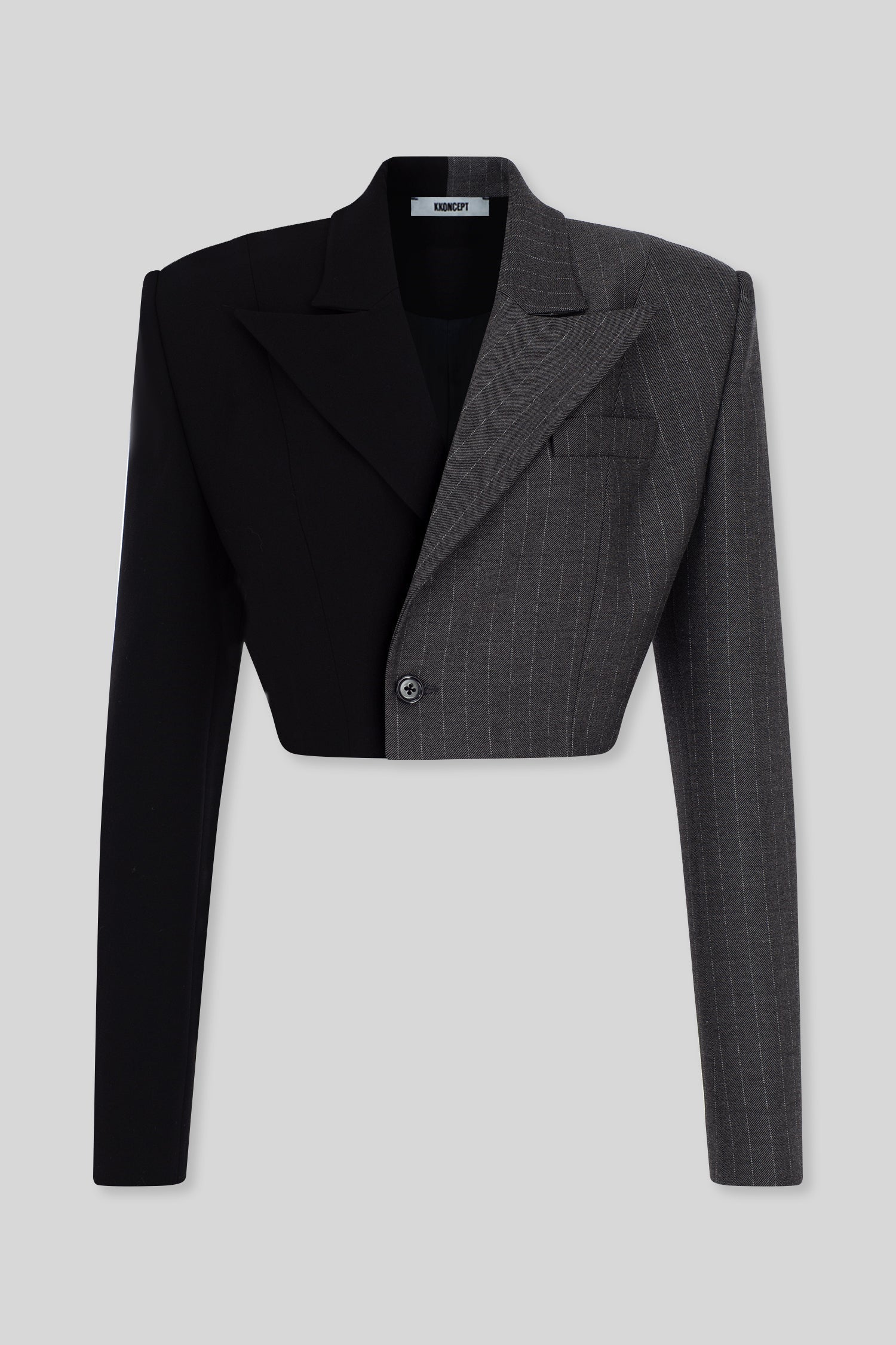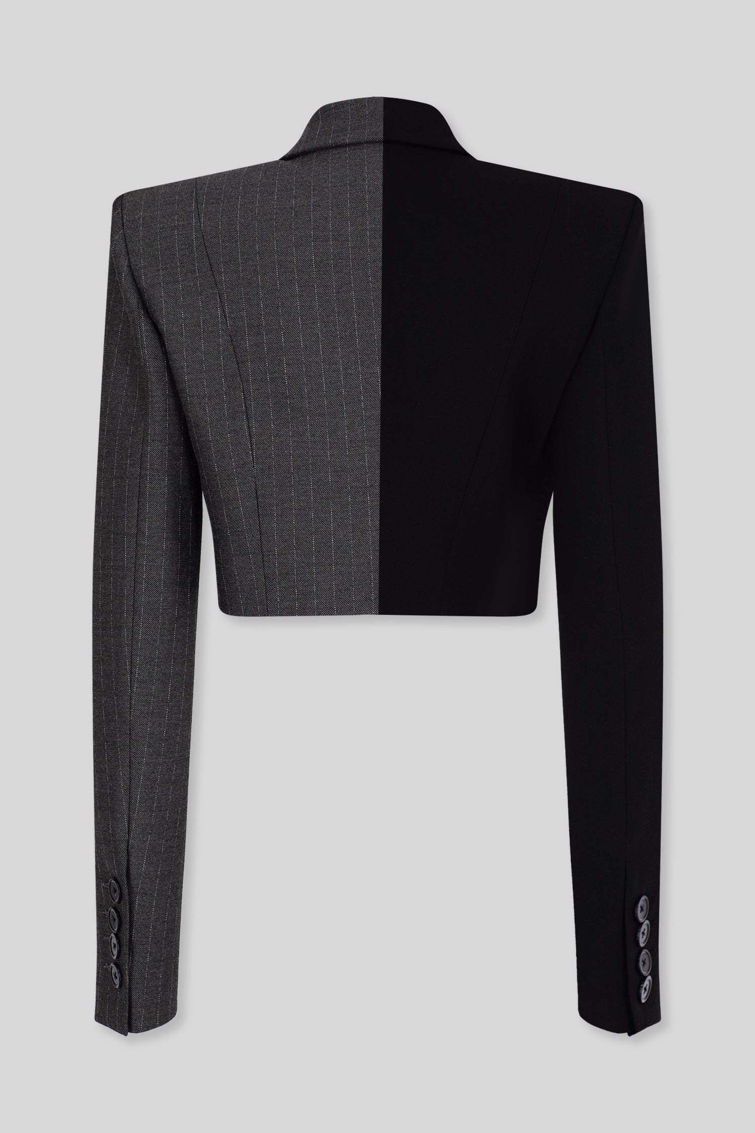 Italian oversized fit one sided collar mini blazer half striped grey fine wool fabric and half black fine wool blazer fabric.
