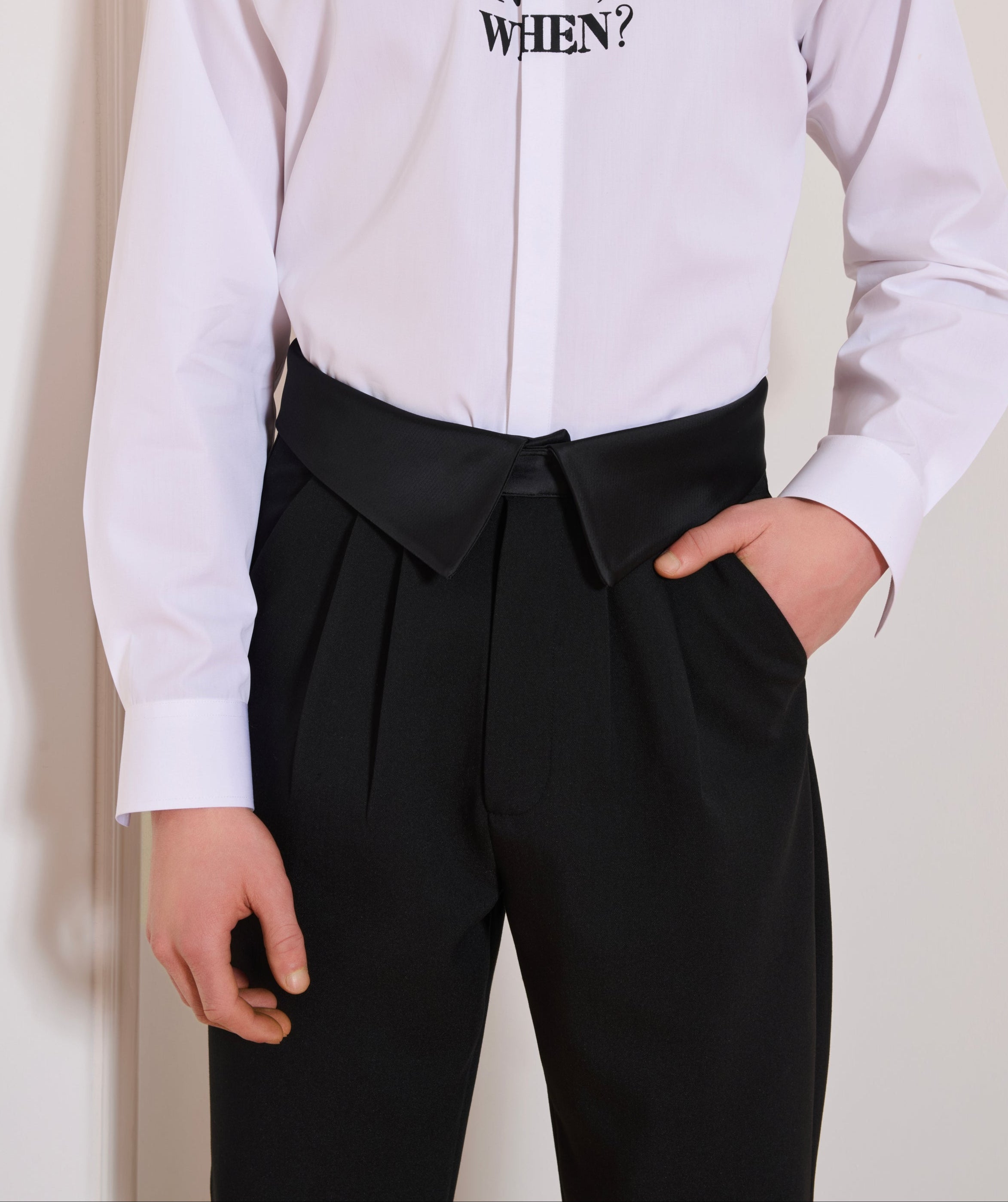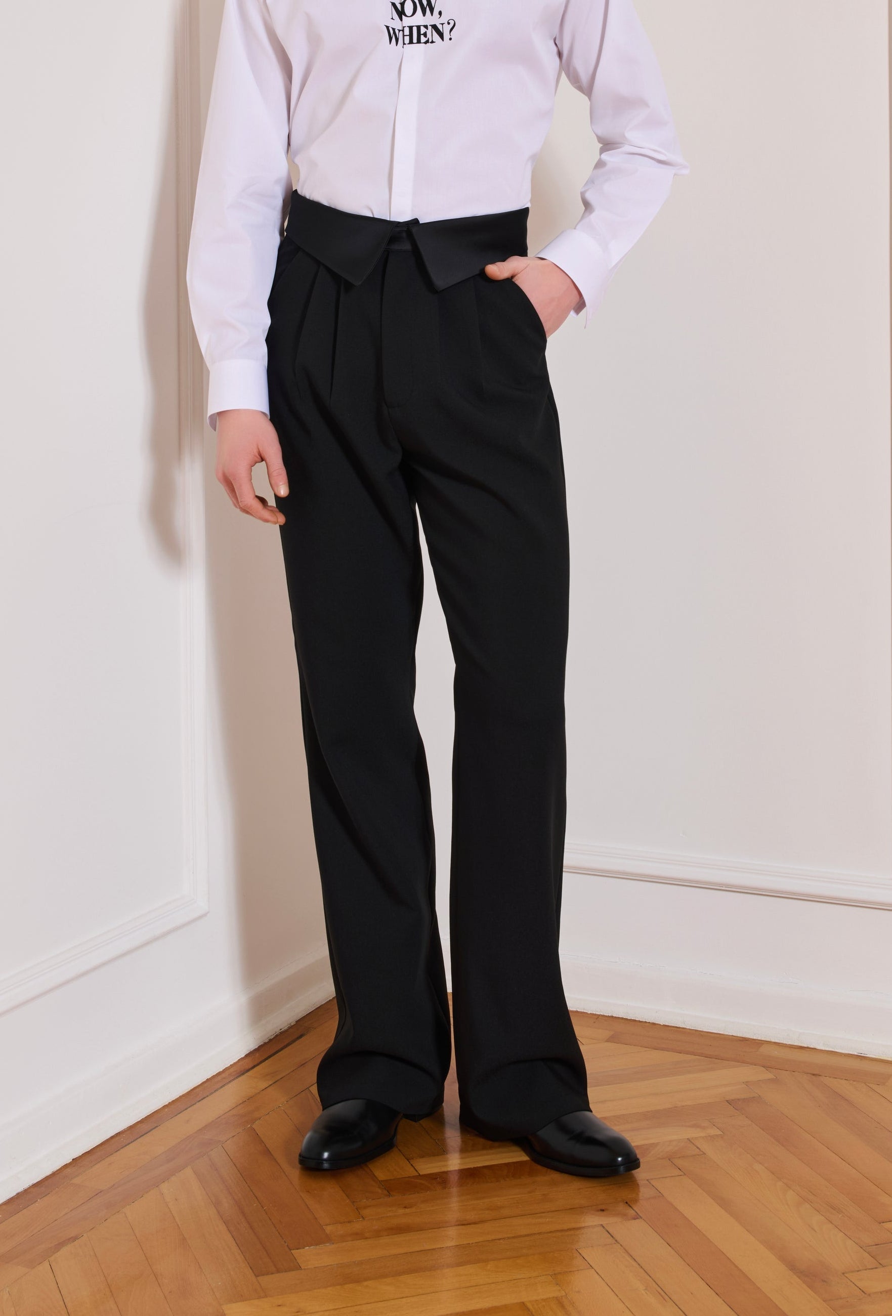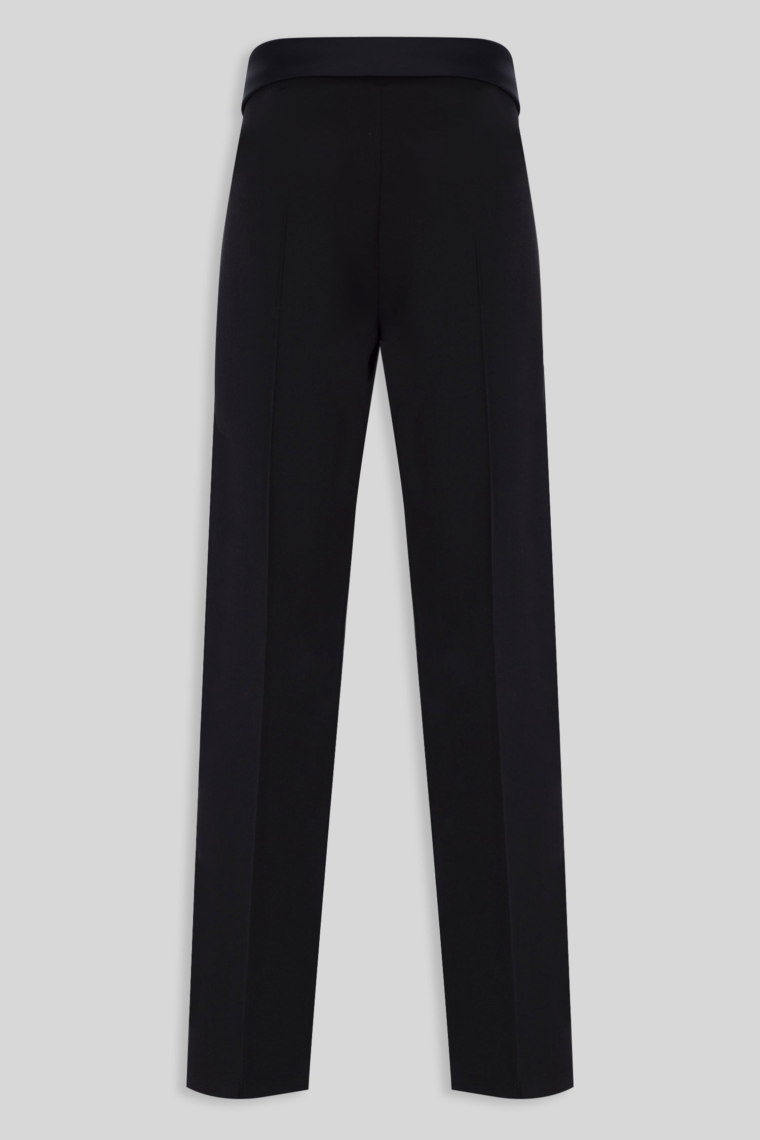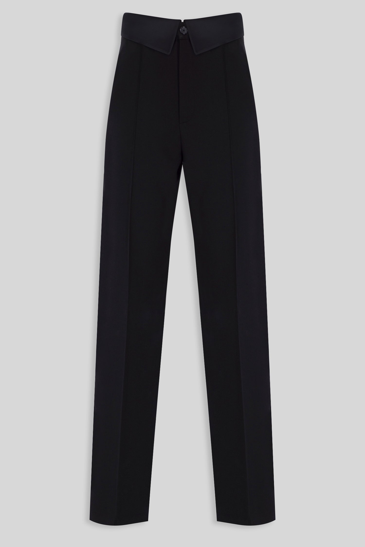 Classic cut Black fine Gabardin pants with an embedded Black fine Satin Collar shaped design on the waist.