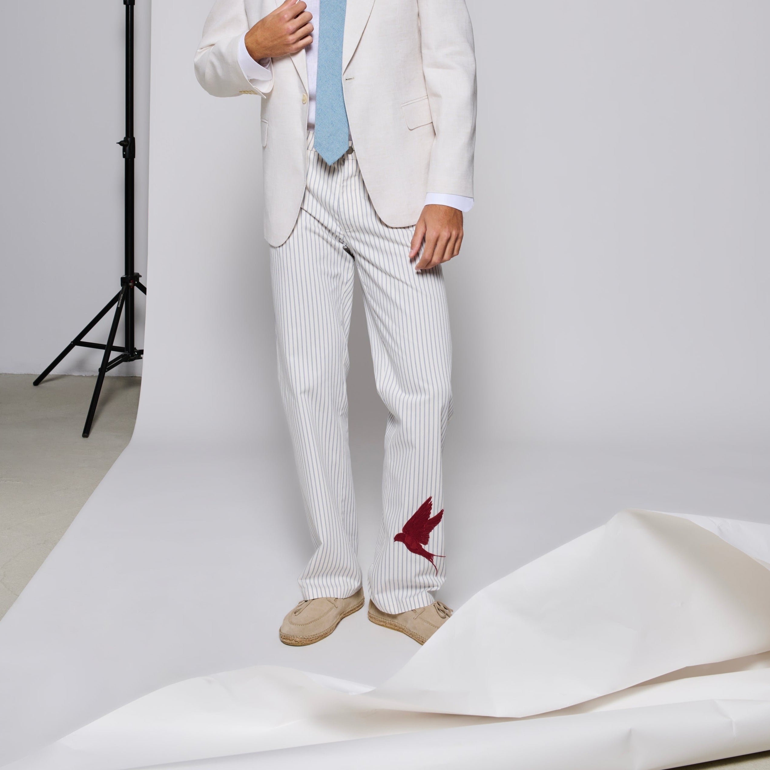 Boot-cut gabardine offwhite striped trousers - with a burgundy bird embroidered on the left side of the trouser leg