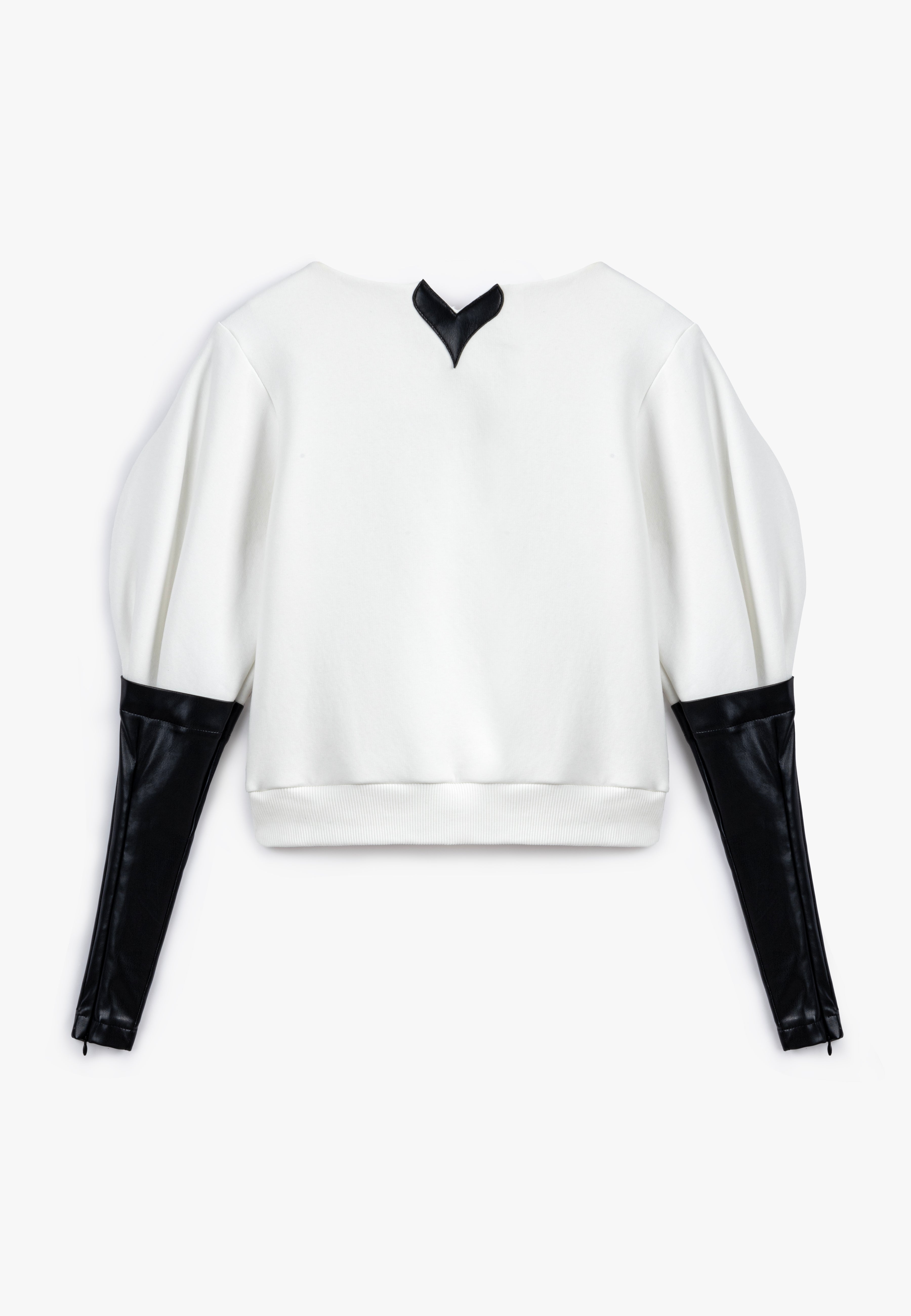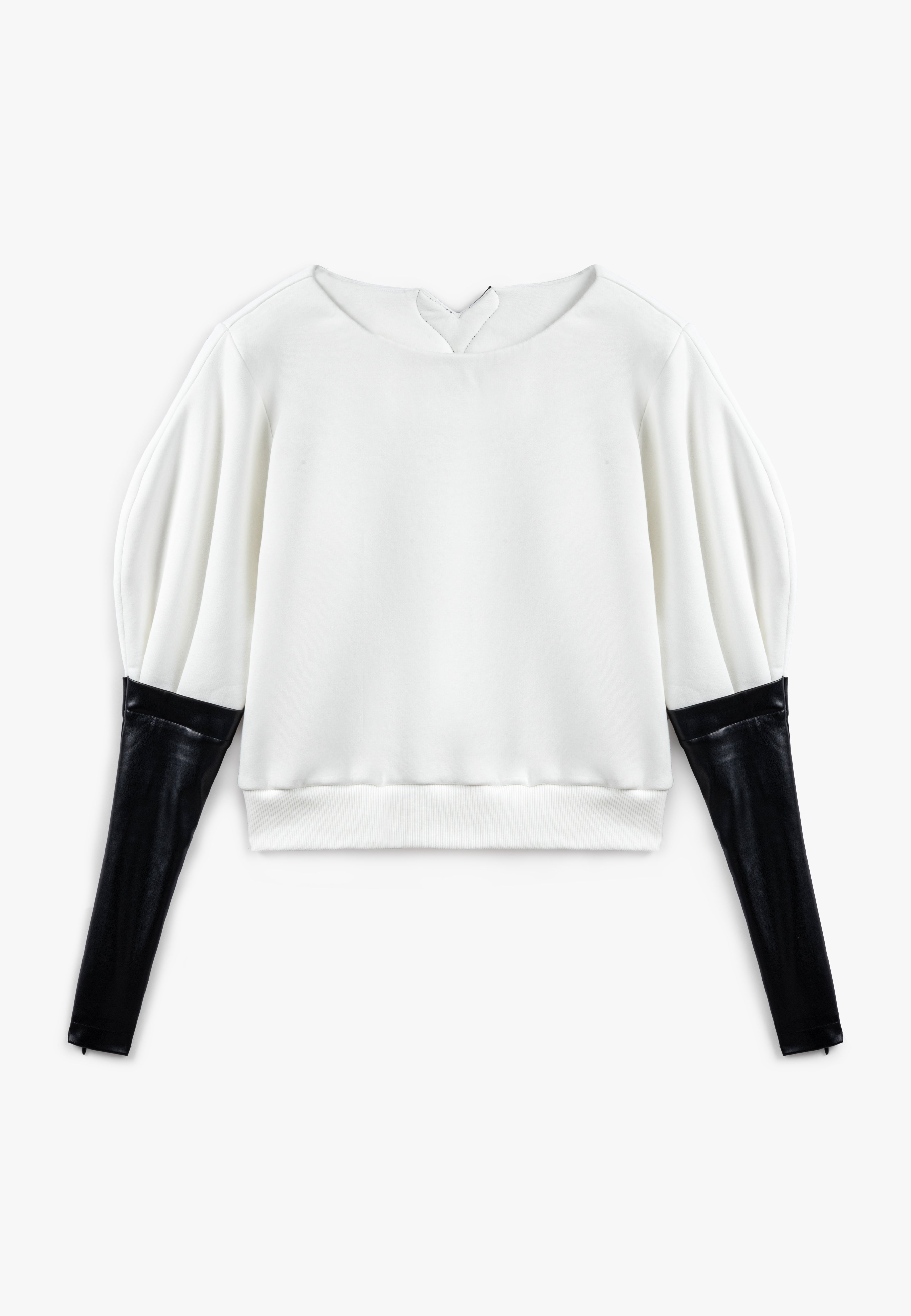 Semi-Oversized 100% White Cotton Sweatshirt with puffed sleeves and black tight leather forearms.