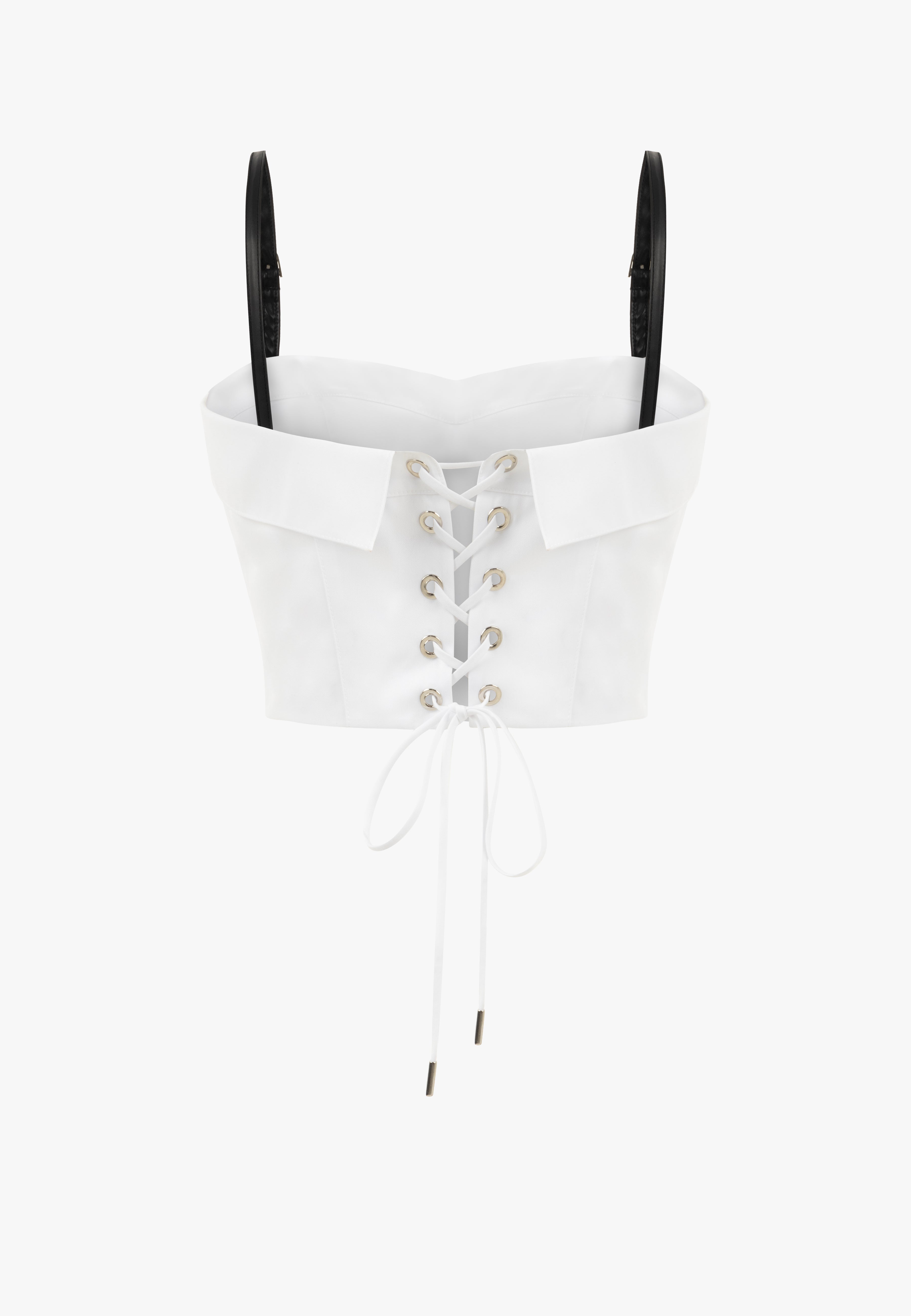Gabardine shirt bustier , with 2 collar details and shirt placket designed with love and detailed with two black belts as straps