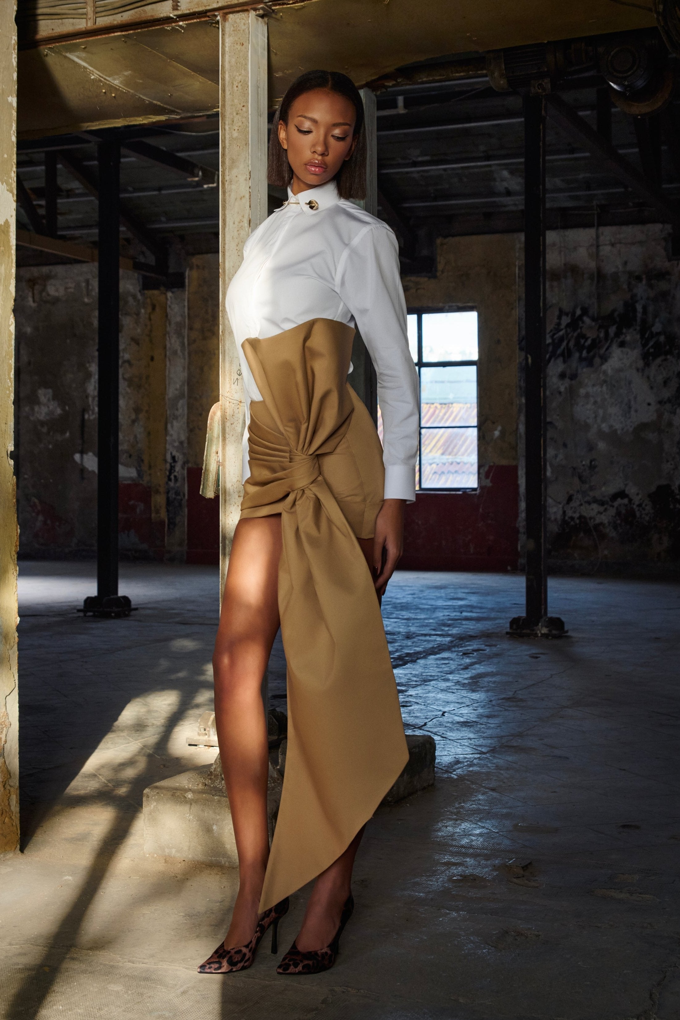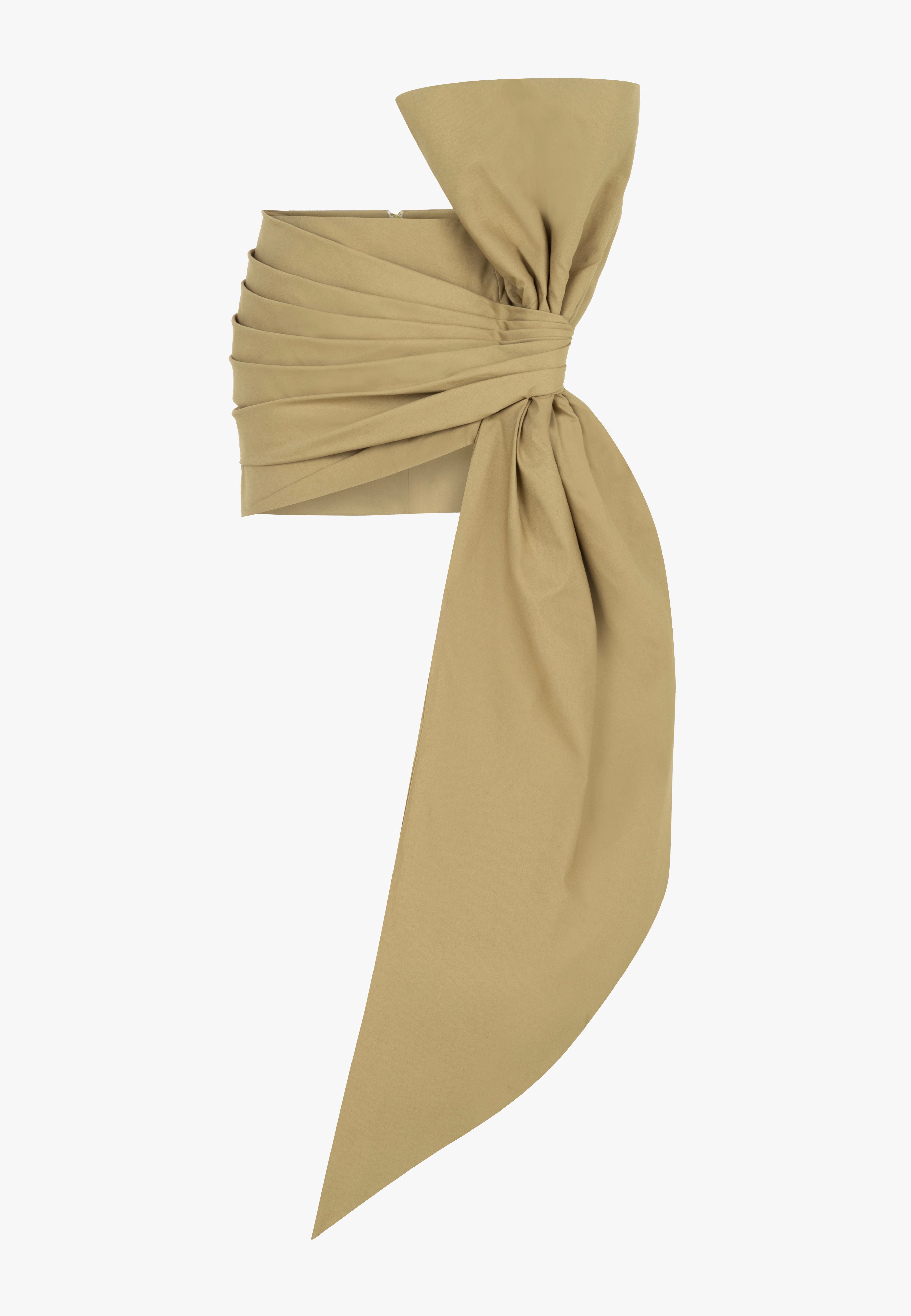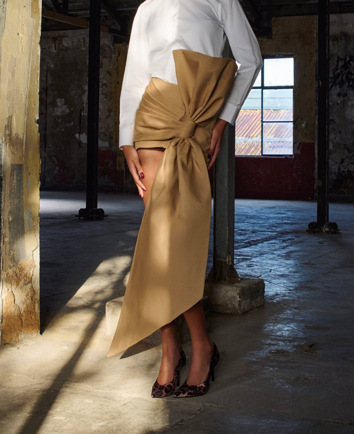 A signature KKoncept skirt, hand draped and stiff standing vertical ribbon, made of cotton twill densely woven Beige Gabardin.