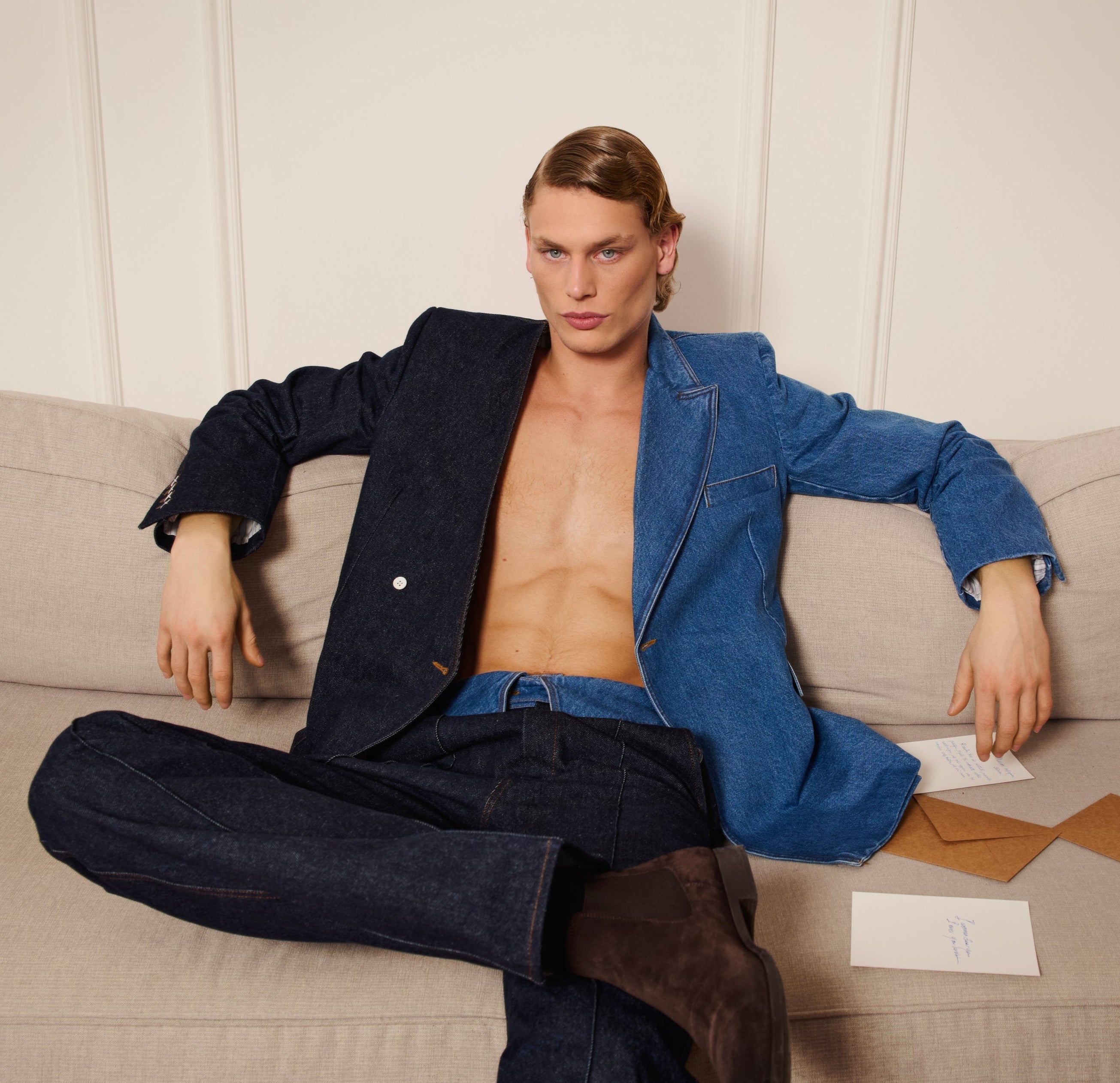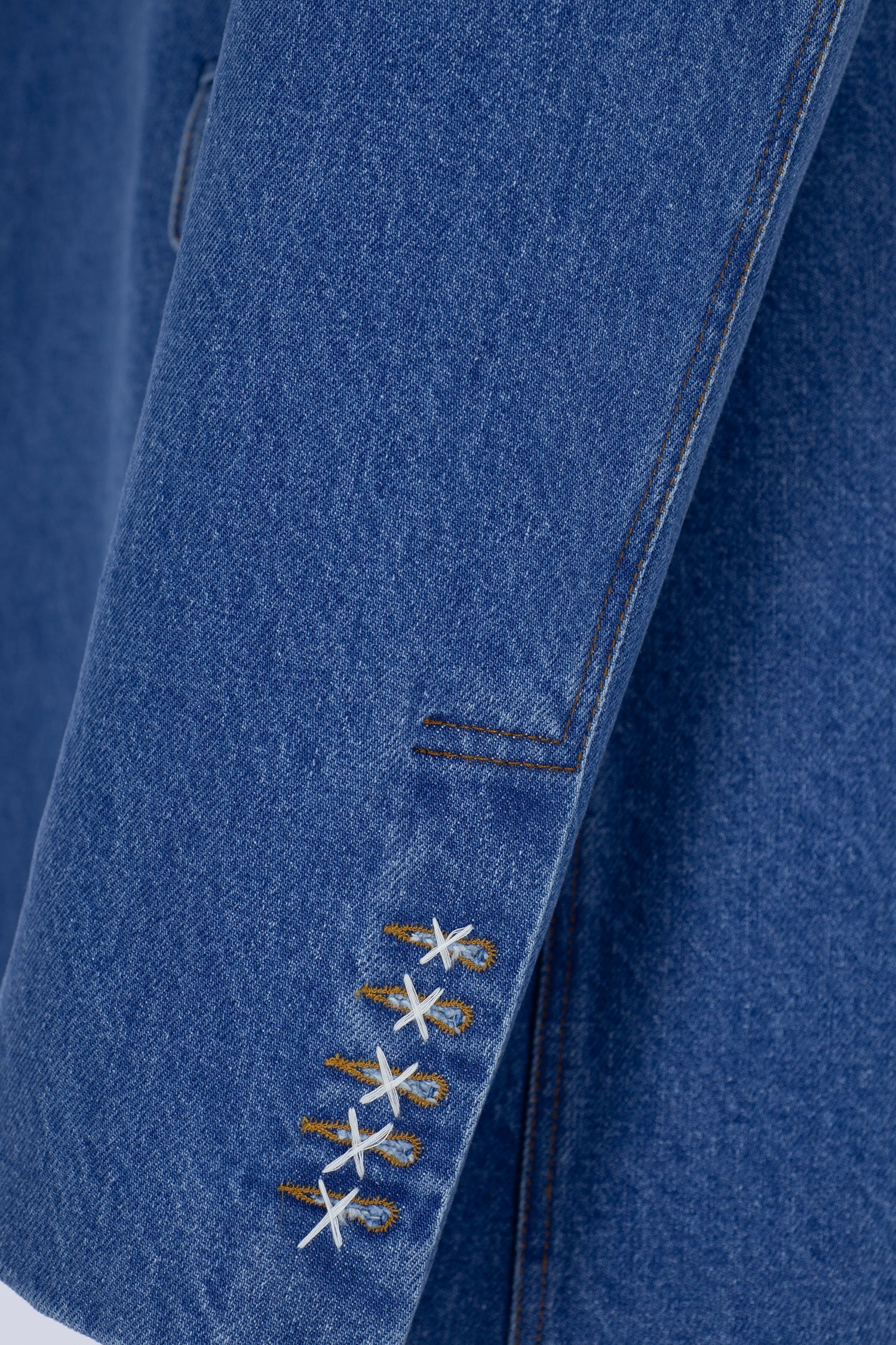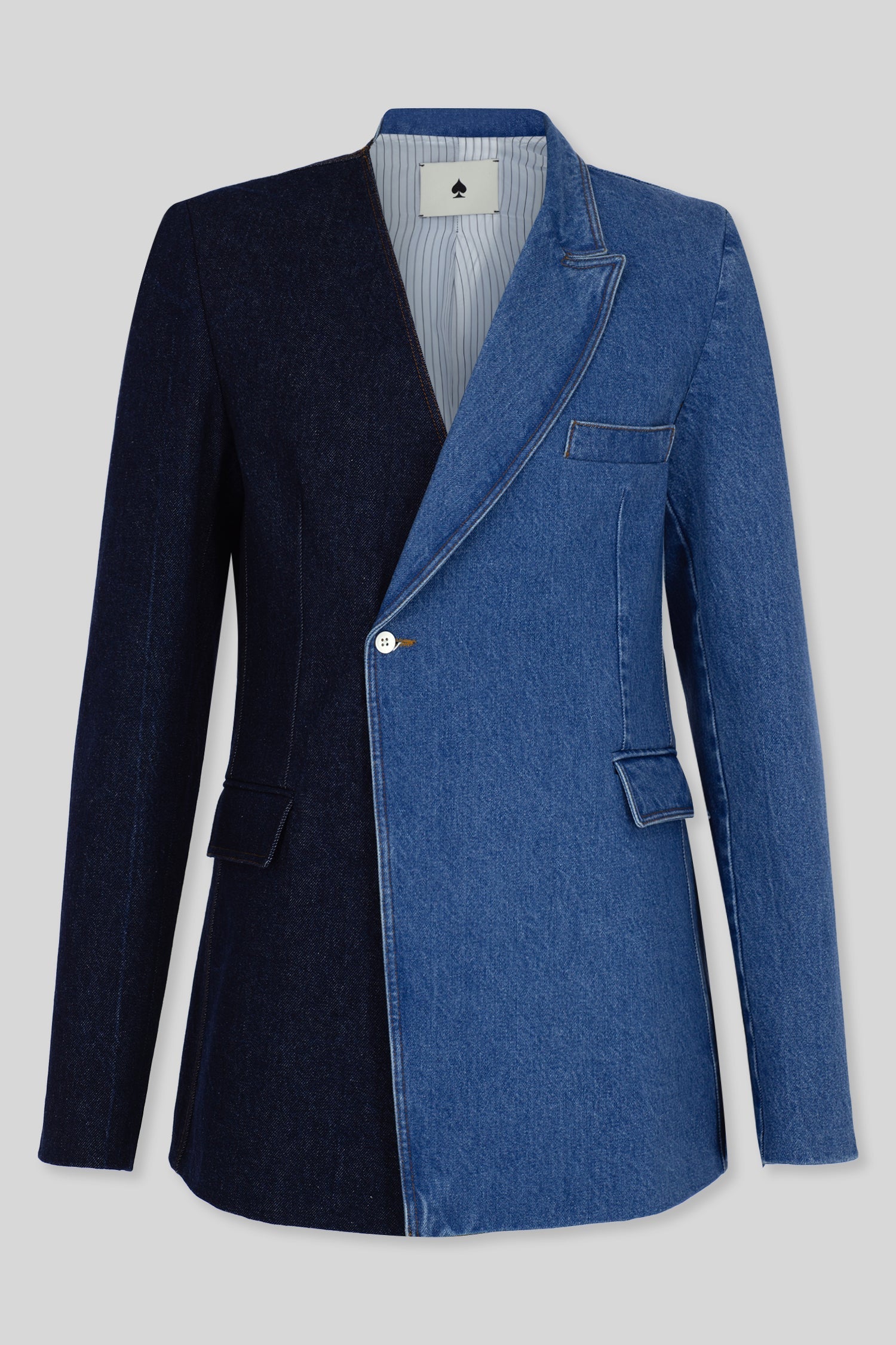 Italian oversized fit one sided collar blazer half dark washed indigo fine Denim and half grinding washed fine indigo Denim.