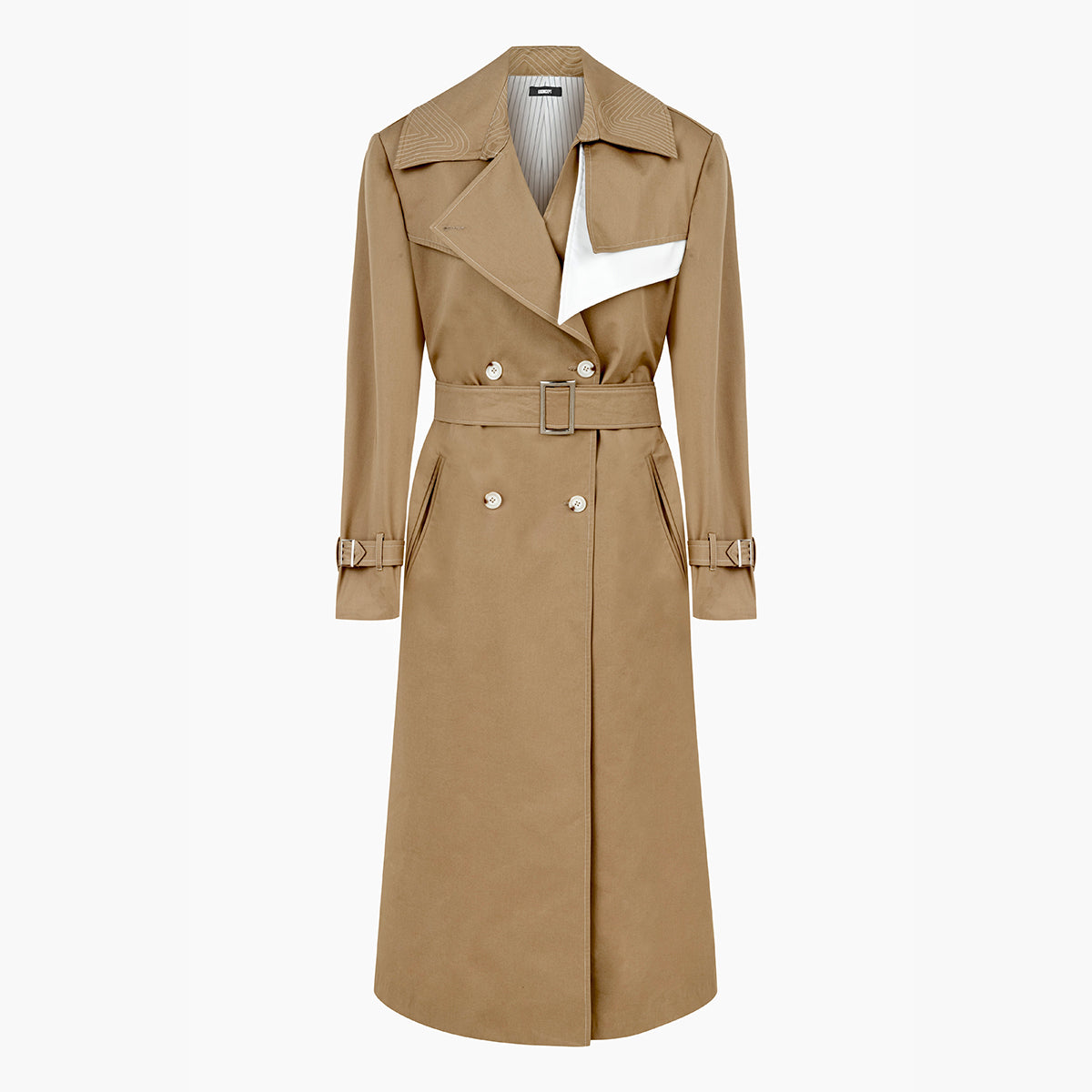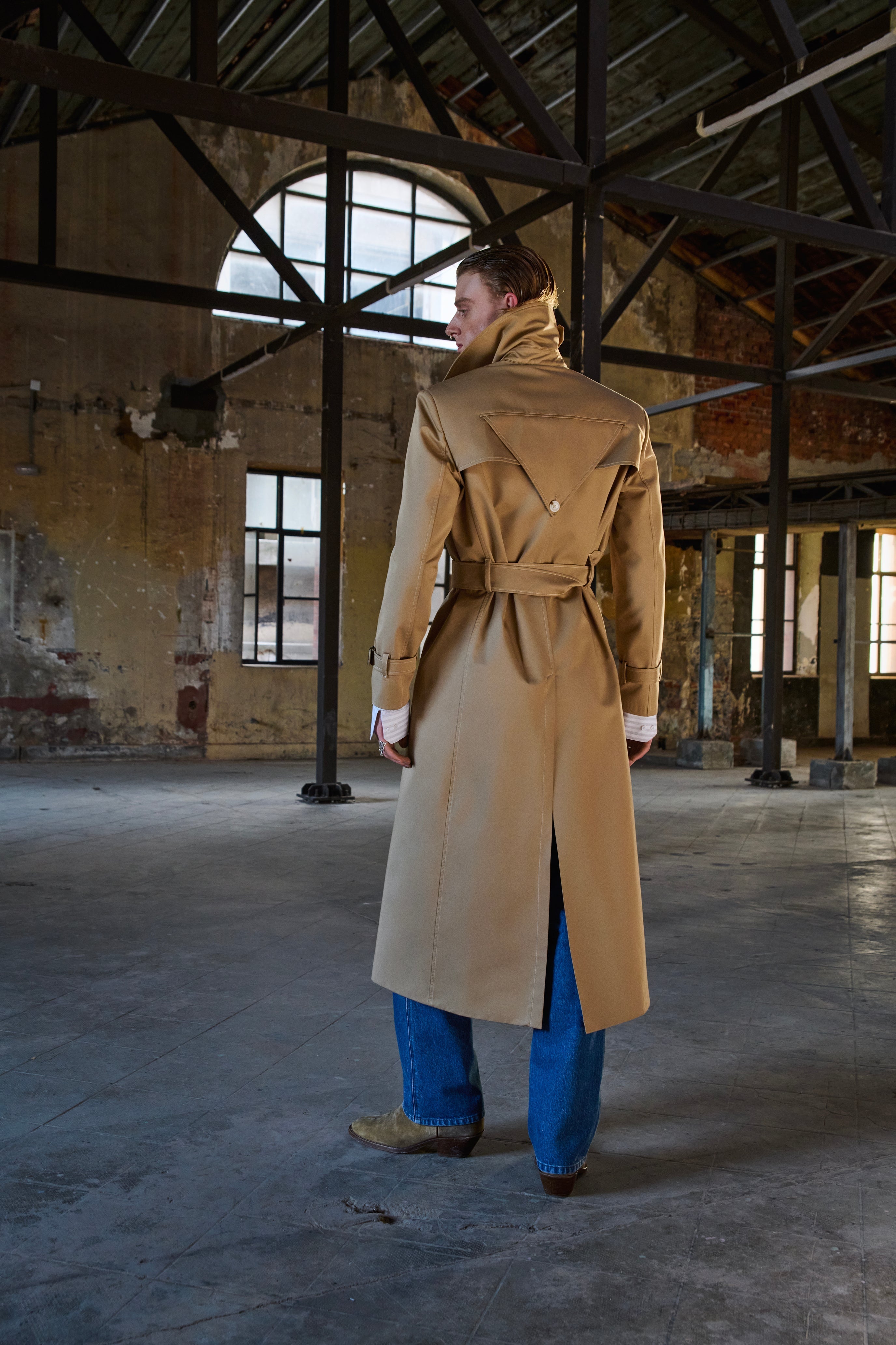 Men water proof cotton twill densely woven Beige Gabardin long Trench Coat.