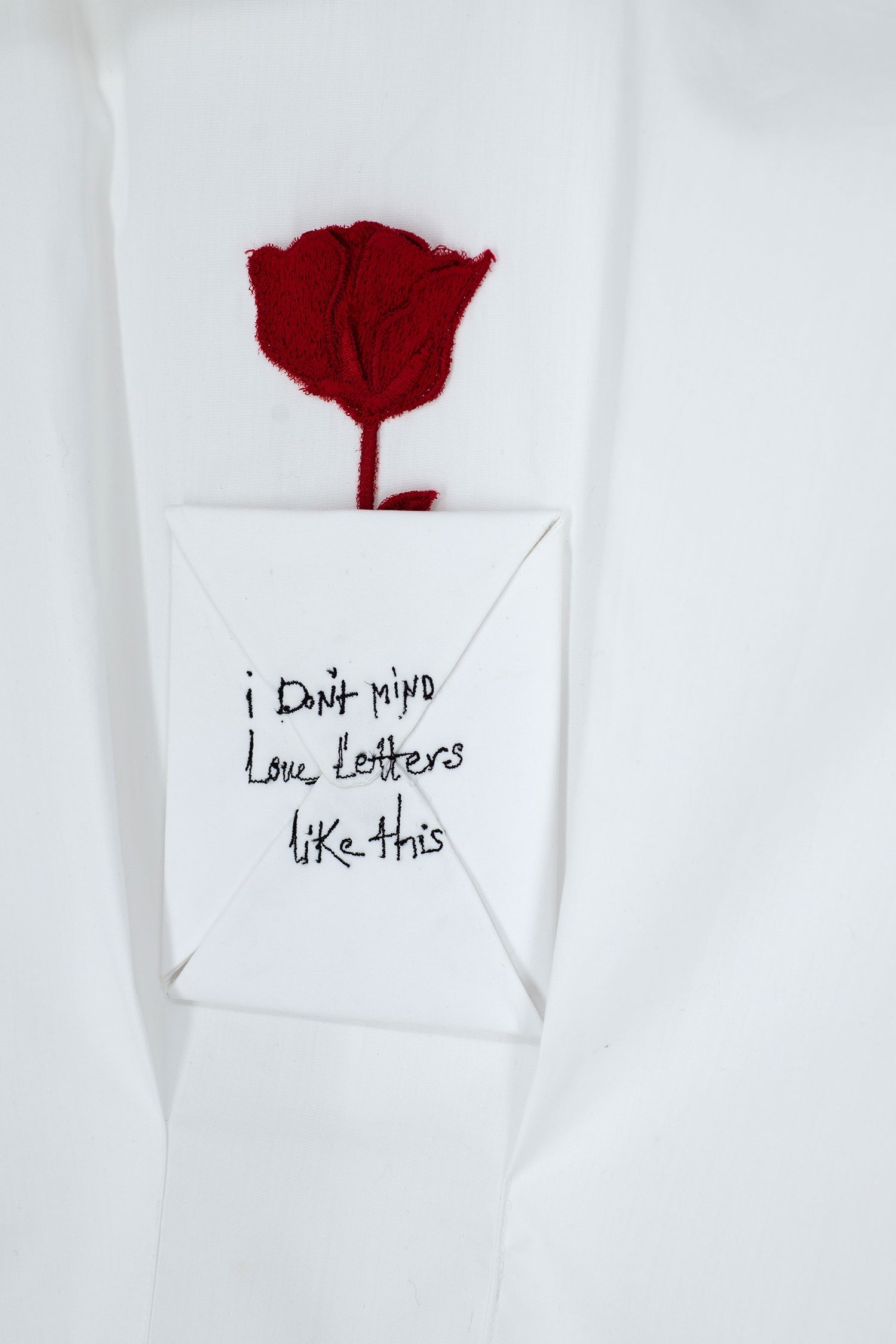 Back side embedded with a vibrant red flower and an envelope with a black embroidery handwriting 'I don't mind love letters like this.'