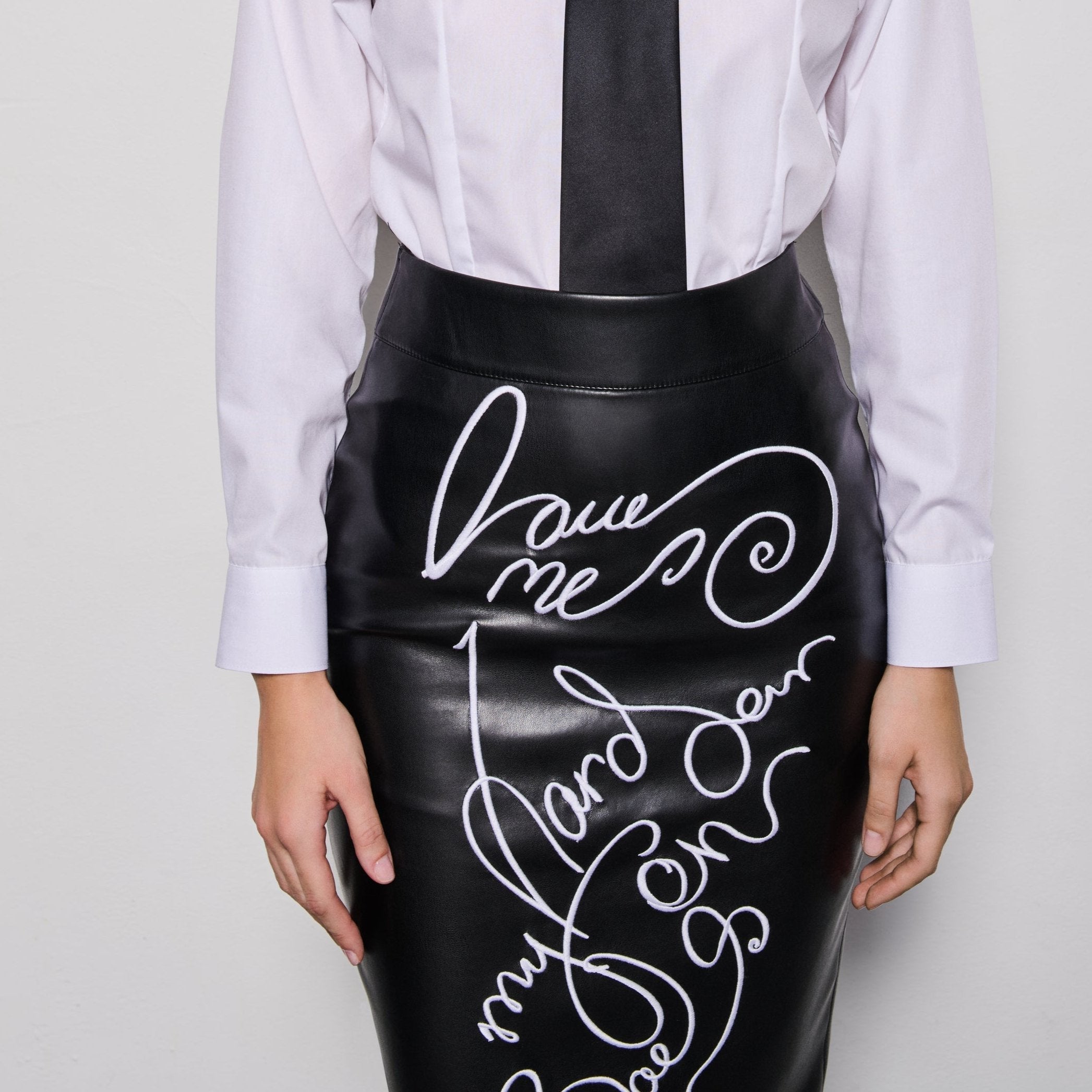 A Faux black leather pencil skirt with a "Love me harder on my bad days" white handwritten embroidery.