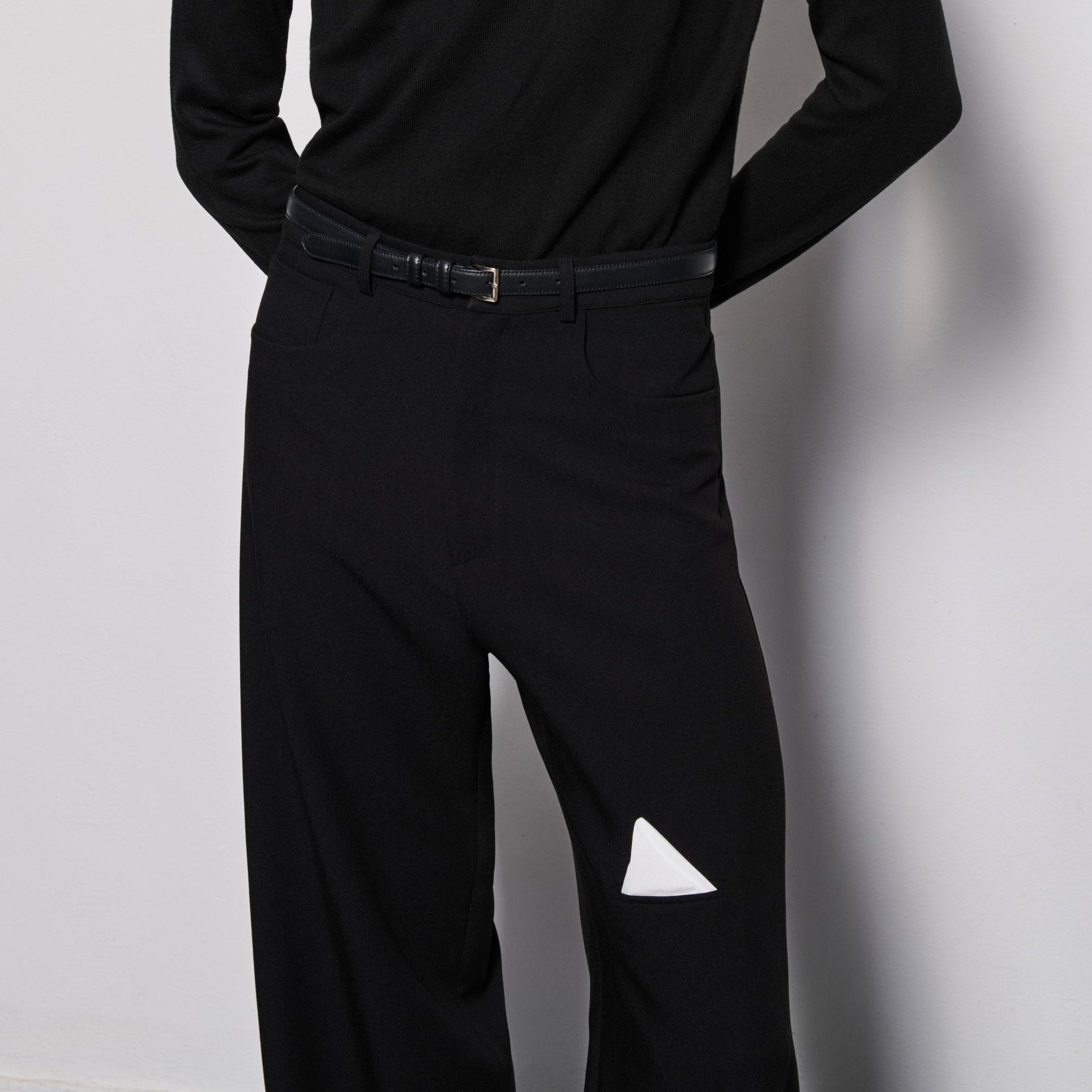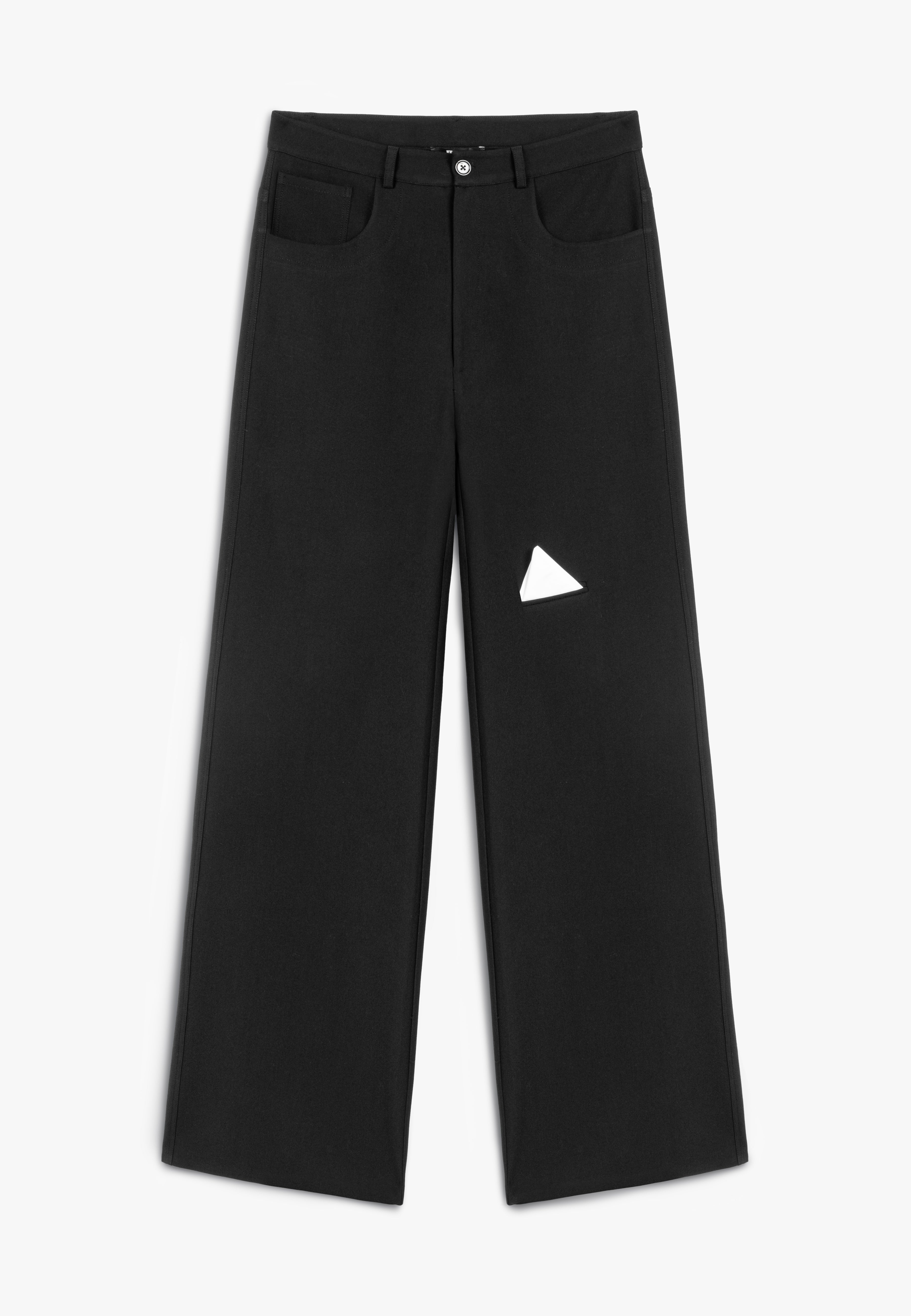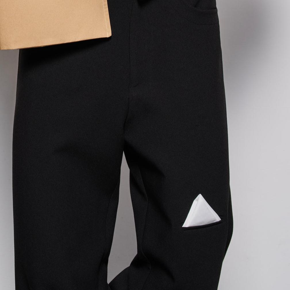 Uniquely cut classic Black pants with a pocket on the knee embellished with a white detachable handkerchief.