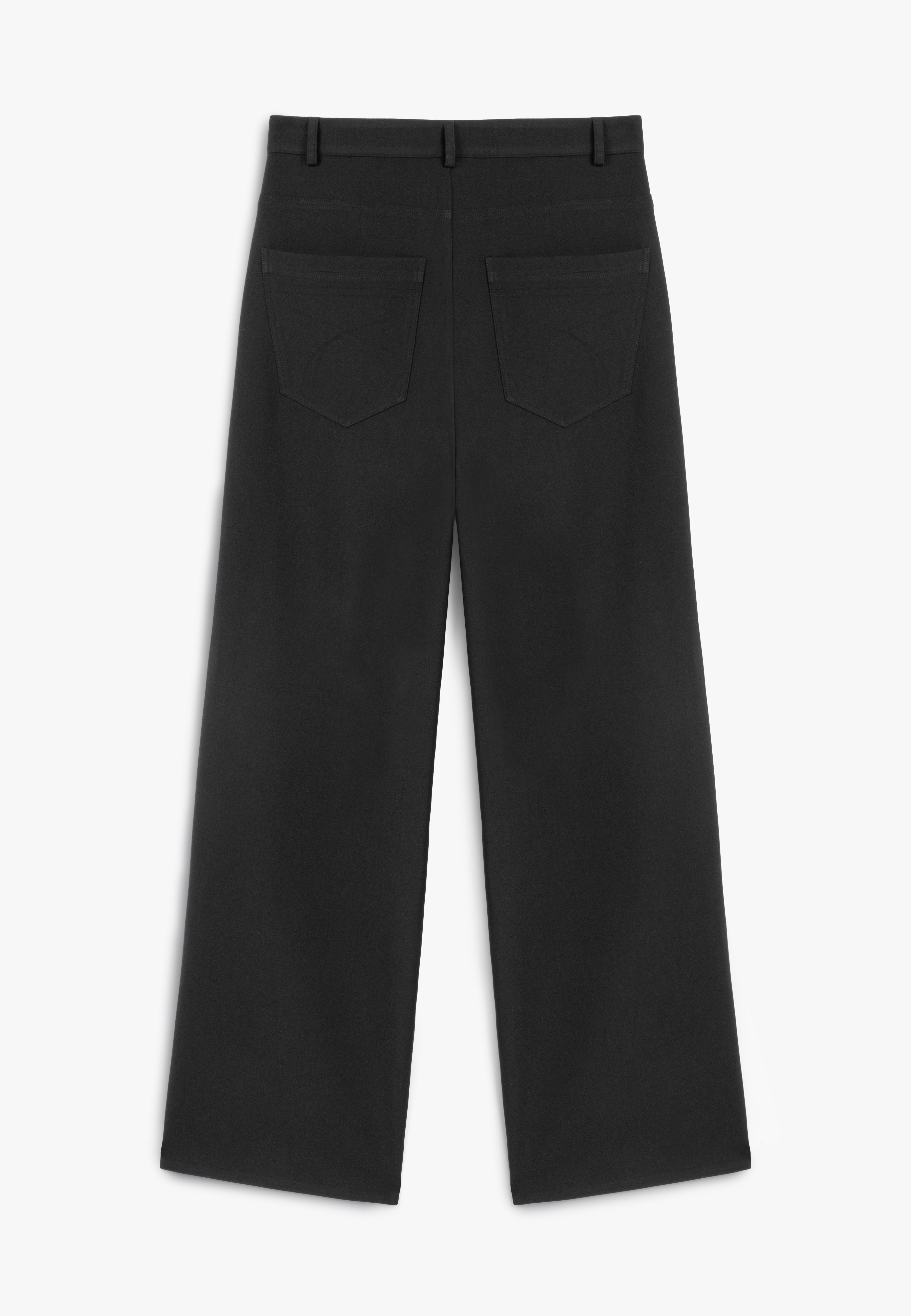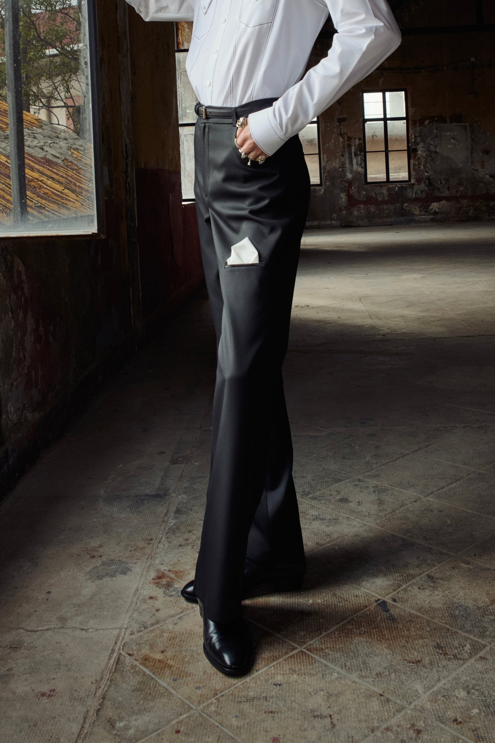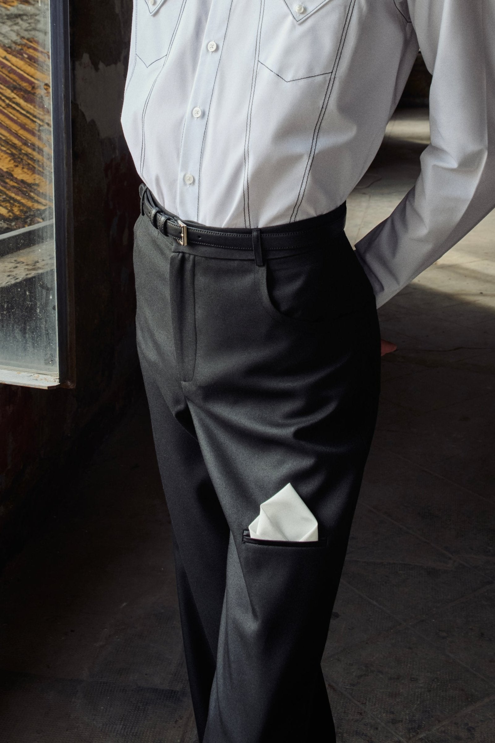 Uniquely cut classic Black pants with a pocket on the knee embellished with a white detachable handkerchief.