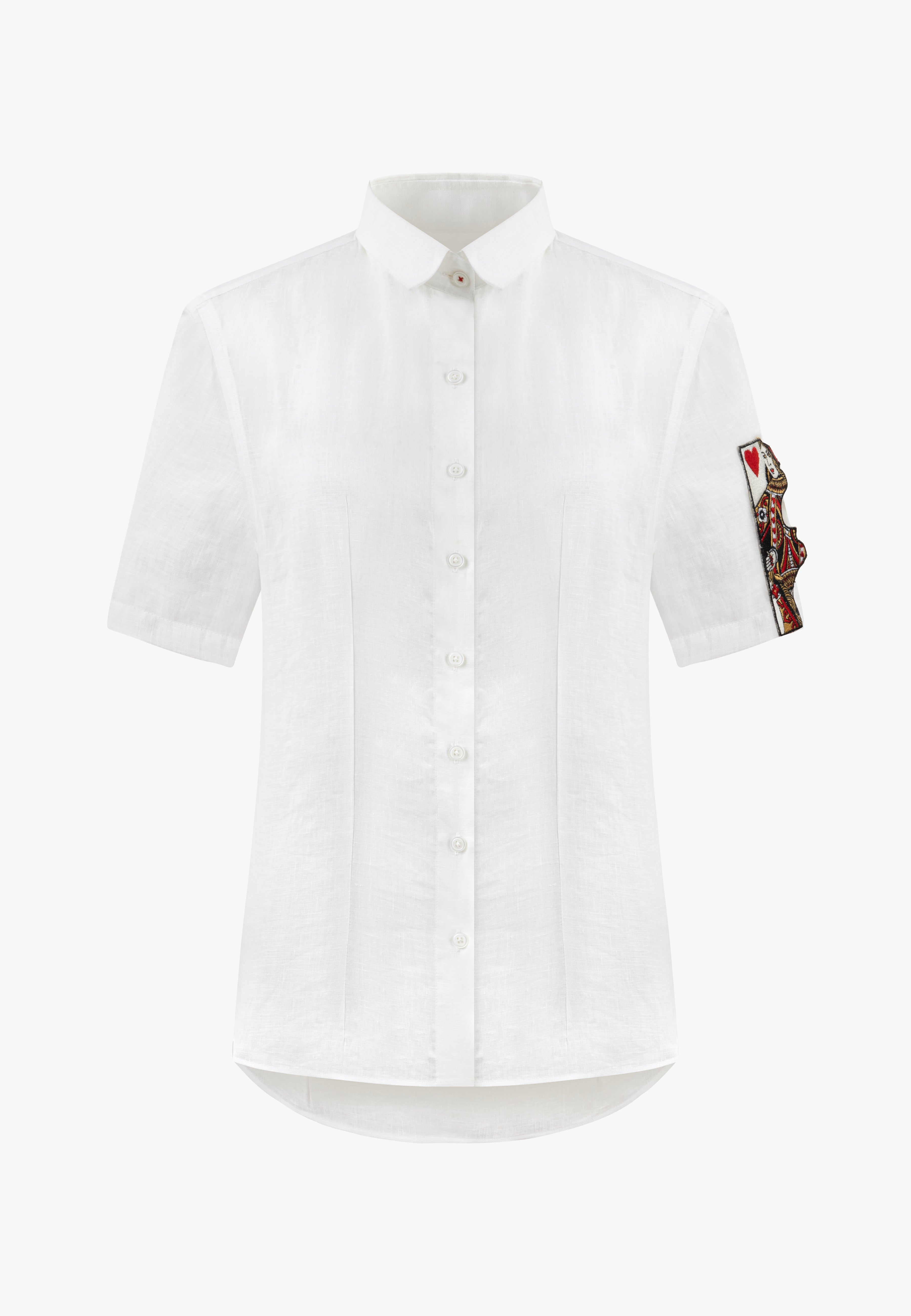 Queen of hearts shirt with a slim fit cut and draped short sleeves with queen of hearts unique card embroidery on one the left sleeve of the shirt