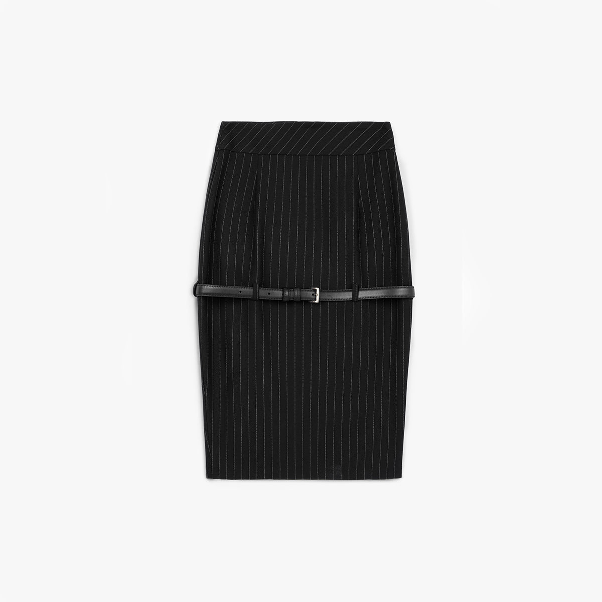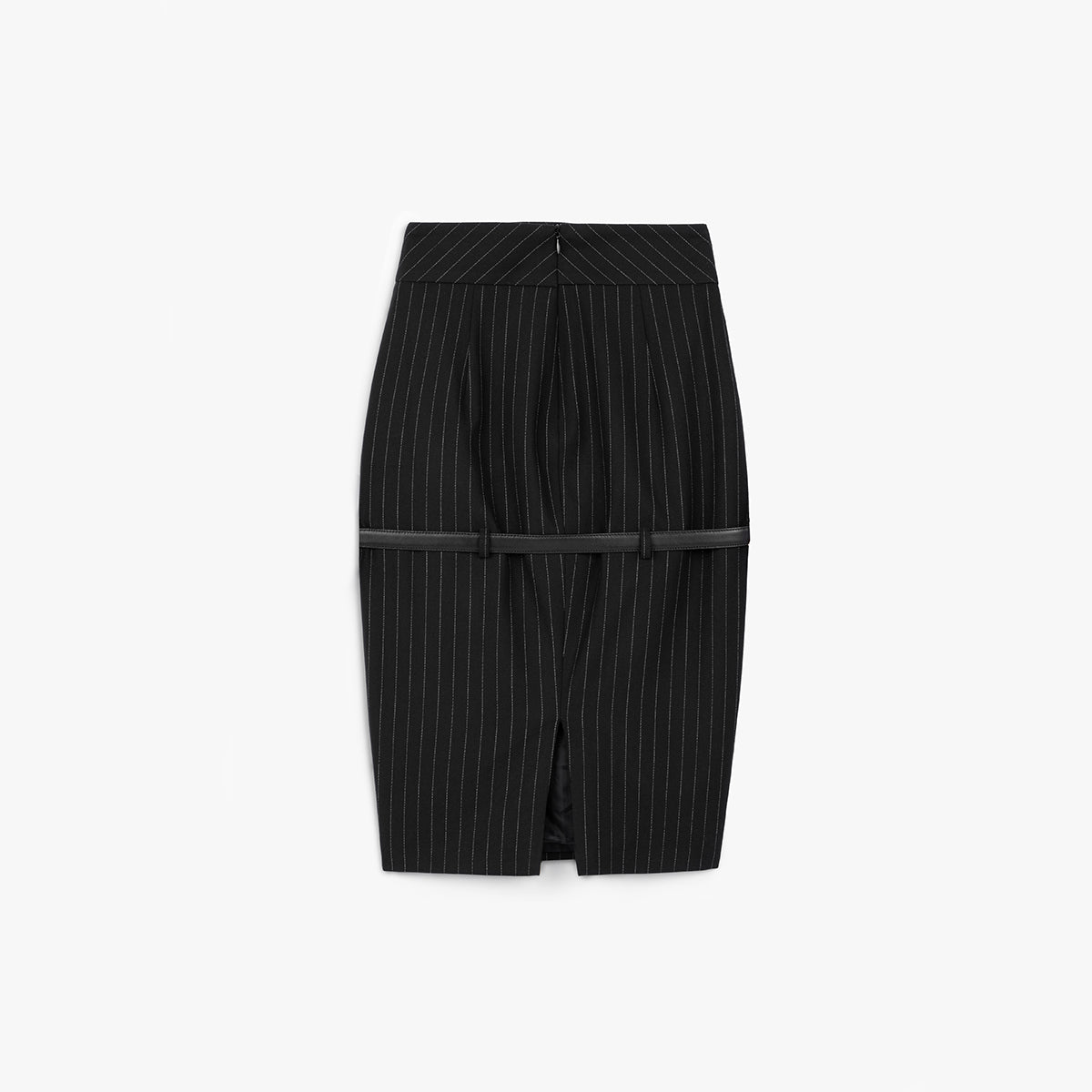 A White striped dark Grey pencil skirt with a detachable black leather belt on the middle of the garment.