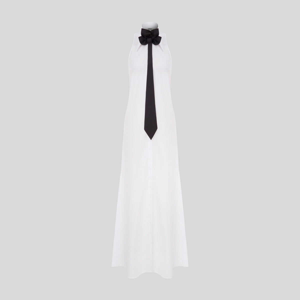 A long buttoned up White Poplin dress. (Can be buckled up or left loose)